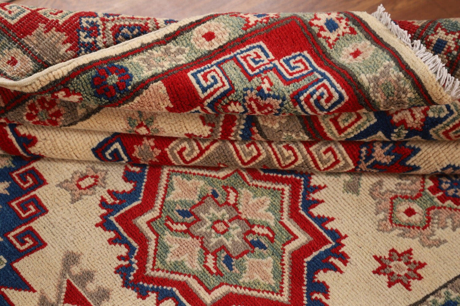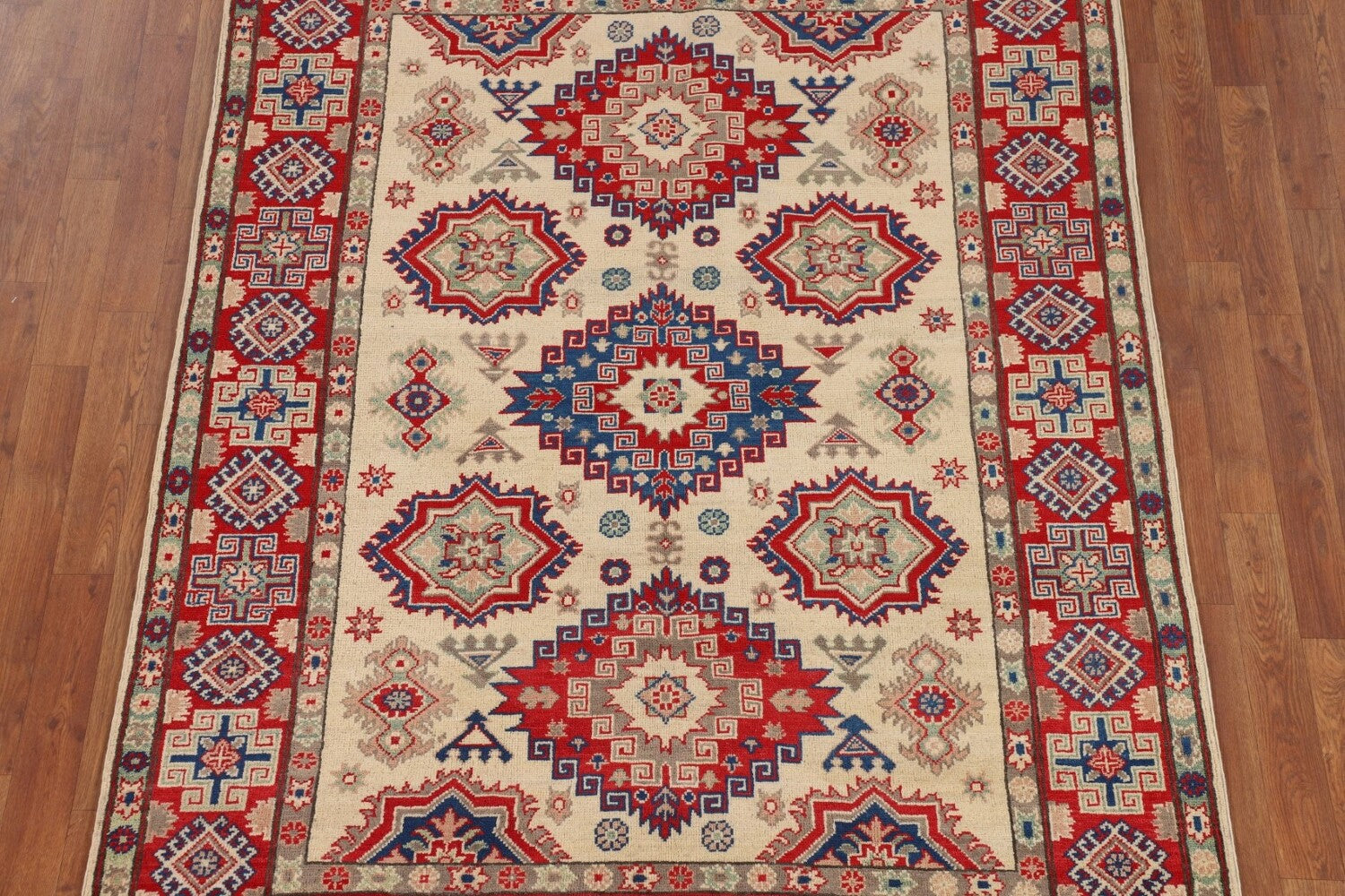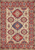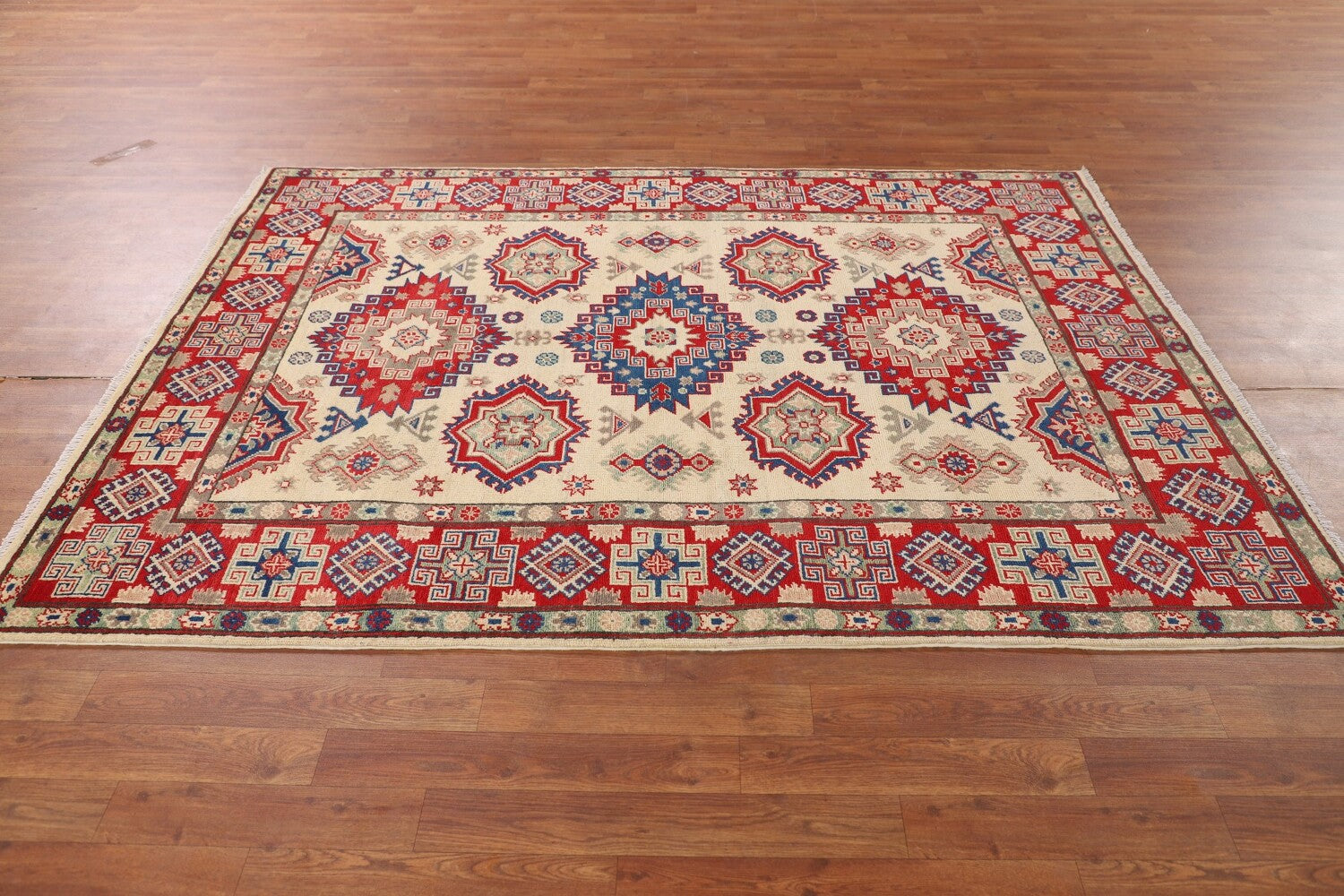 A Beautiful Genuine Pakistan Kazak rug is Hand Knotted by skillful weavers in Pakistan with 100% Wool Material. This rug is in New, First Quality condition. dimensions are 7' 0'' X 4' 11'' in foot and 213 X 150 in centimeter. the primary color is Beige & Ivories.