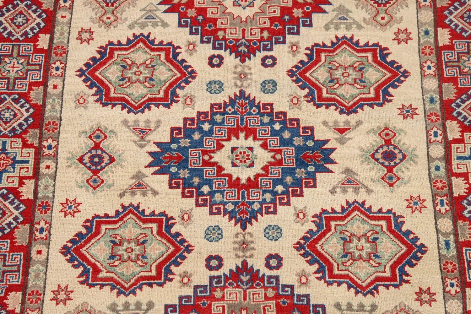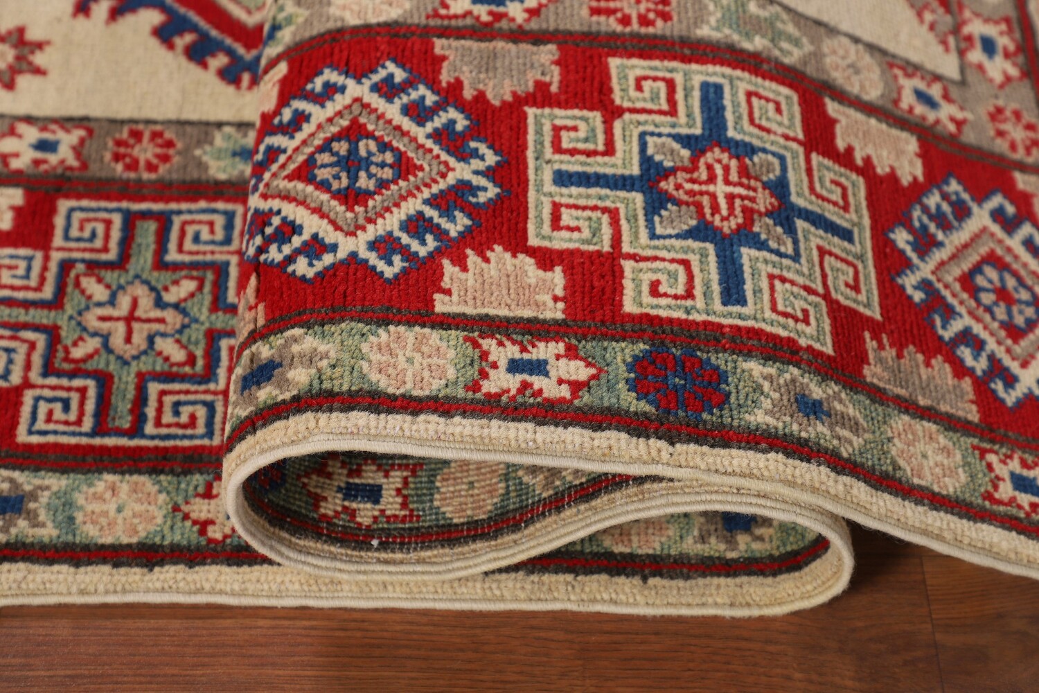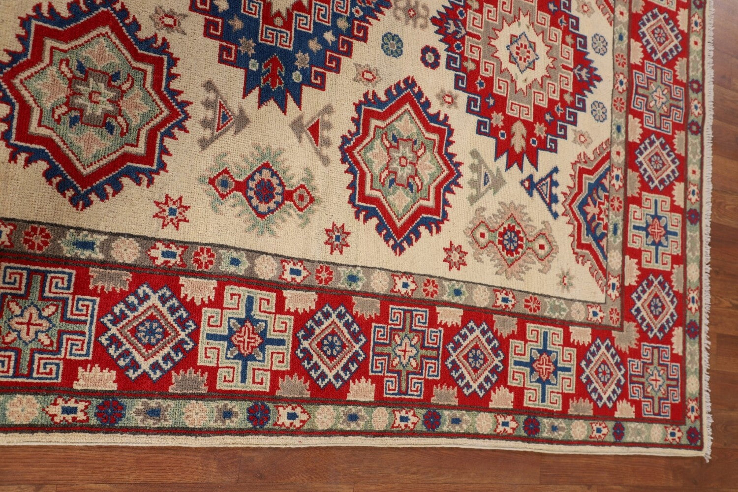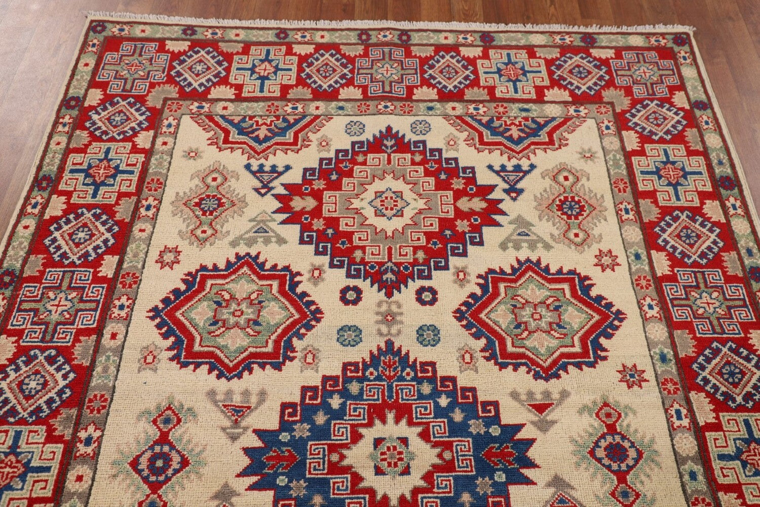 A Beautiful Genuine Pakistan Kazak rug is Hand Knotted by skillful weavers in Pakistan with 100% Wool Material. This rug is in New, First Quality condition. dimensions are 7' 0'' X 4' 11'' in foot and 213 X 150 in centimeter. the primary color is Beige & Ivories.