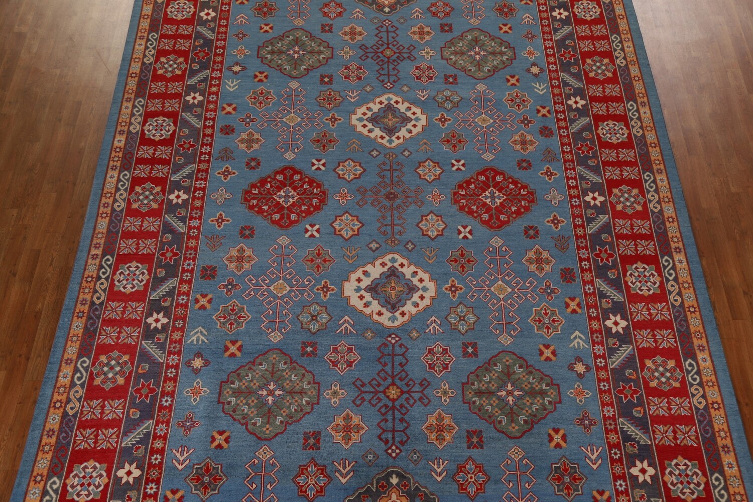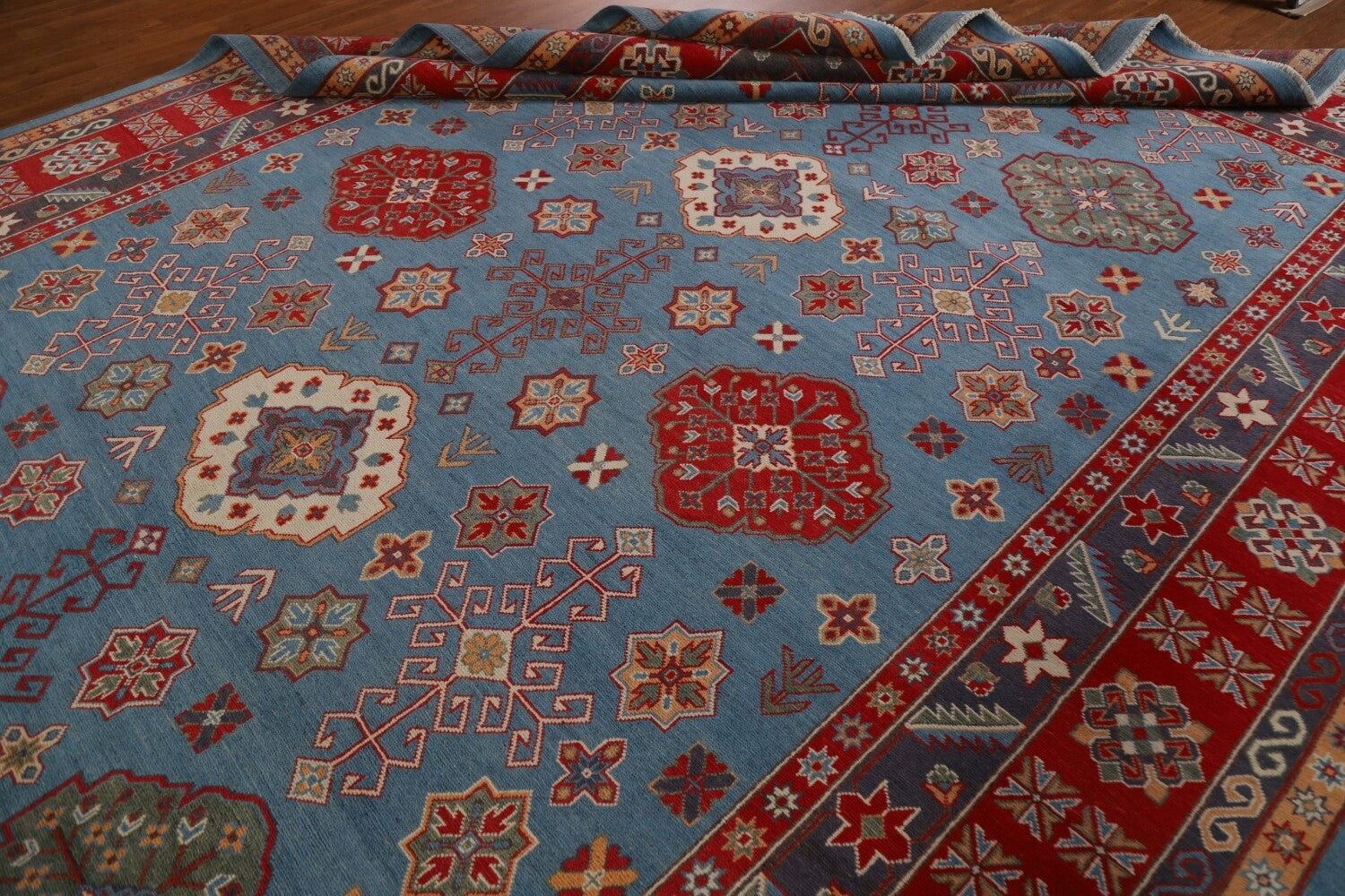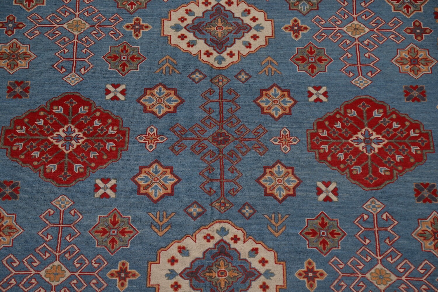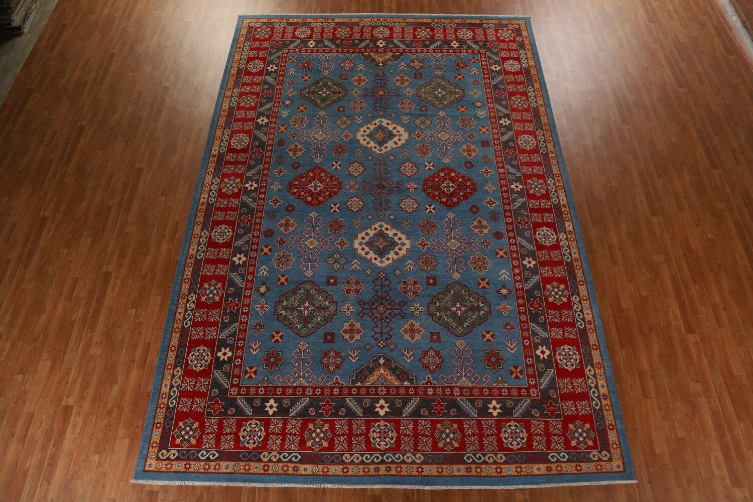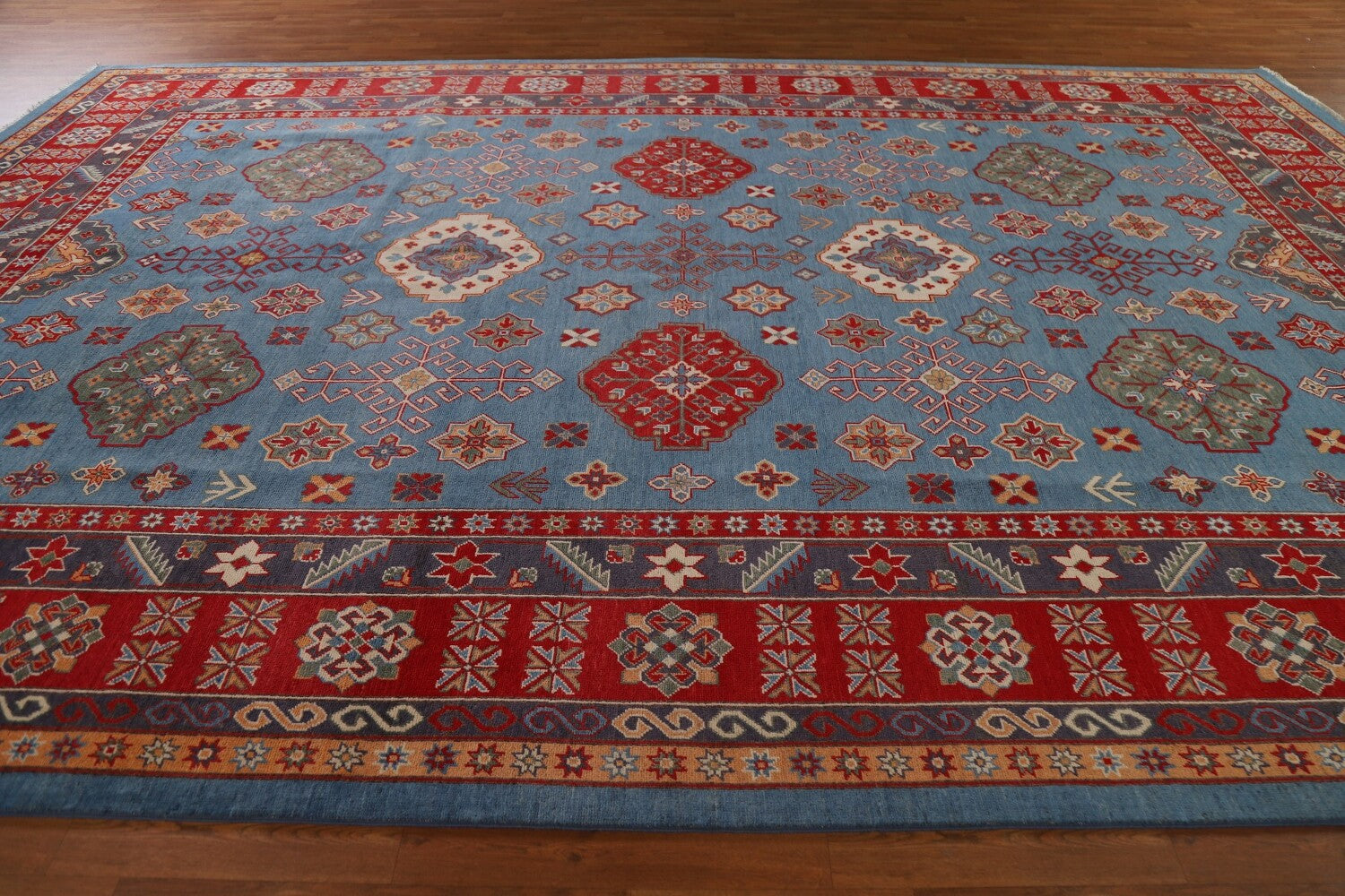 A Beautiful Genuine Pakistan Kazak rug is Hand Knotted by skillful weavers in Pakistan with 100% Wool Material. This rug is in condition. dimensions are 14' 10'' X 9' 11'' in foot and 452 X 302 in centimeter. the primary color is Navy Blue & Blues.