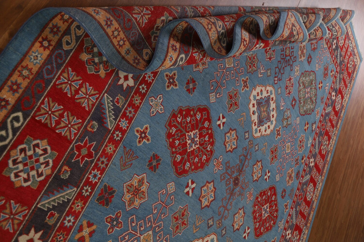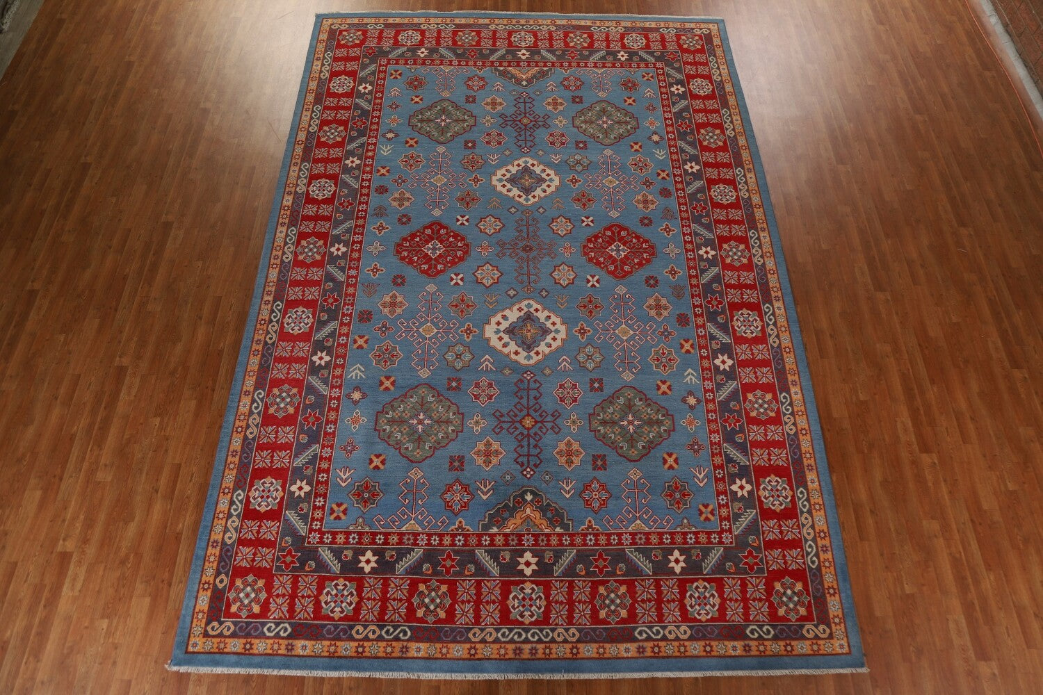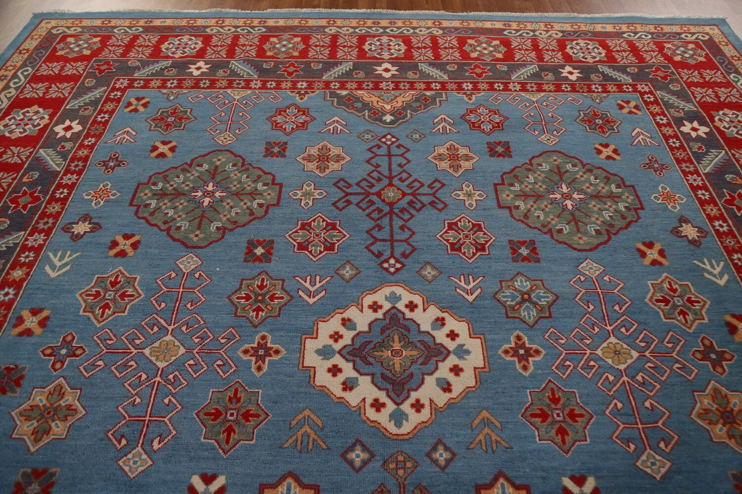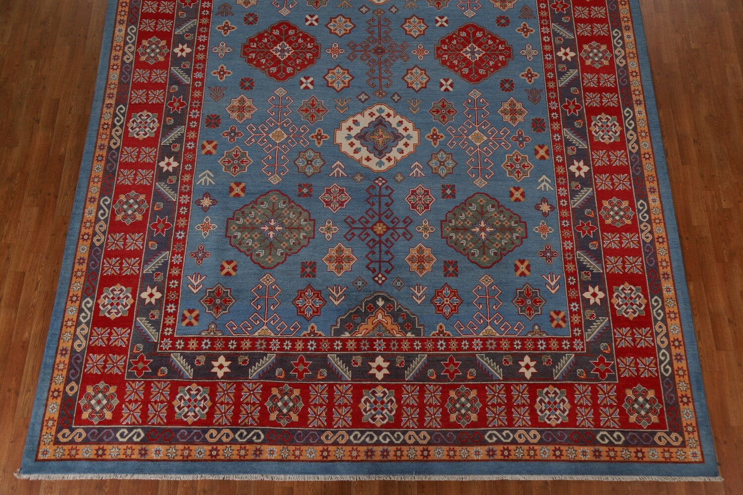 A Beautiful Genuine Pakistan Kazak rug is Hand Knotted by skillful weavers in Pakistan with 100% Wool Material. This rug is in condition. dimensions are 14' 10'' X 9' 11'' in foot and 452 X 302 in centimeter. the primary color is Navy Blue & Blues.