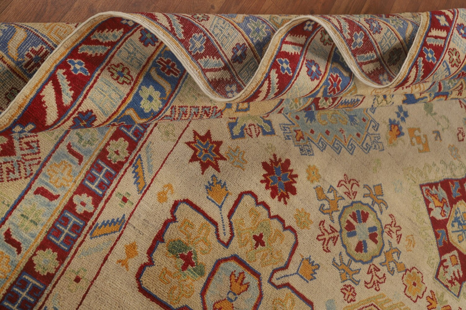 A Beautiful Genuine Pakistan Kazak rug is Hand Knotted by skillful weavers in Pakistan with 100% Wool Material. This rug is in condition. dimensions are 13' 5'' X 9' 9'' in foot and 409 X 297 in centimeter. the primary color is Peach.