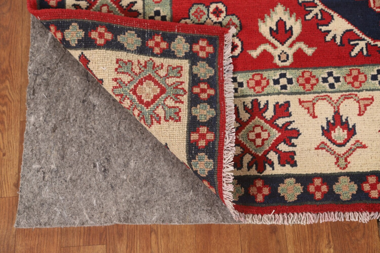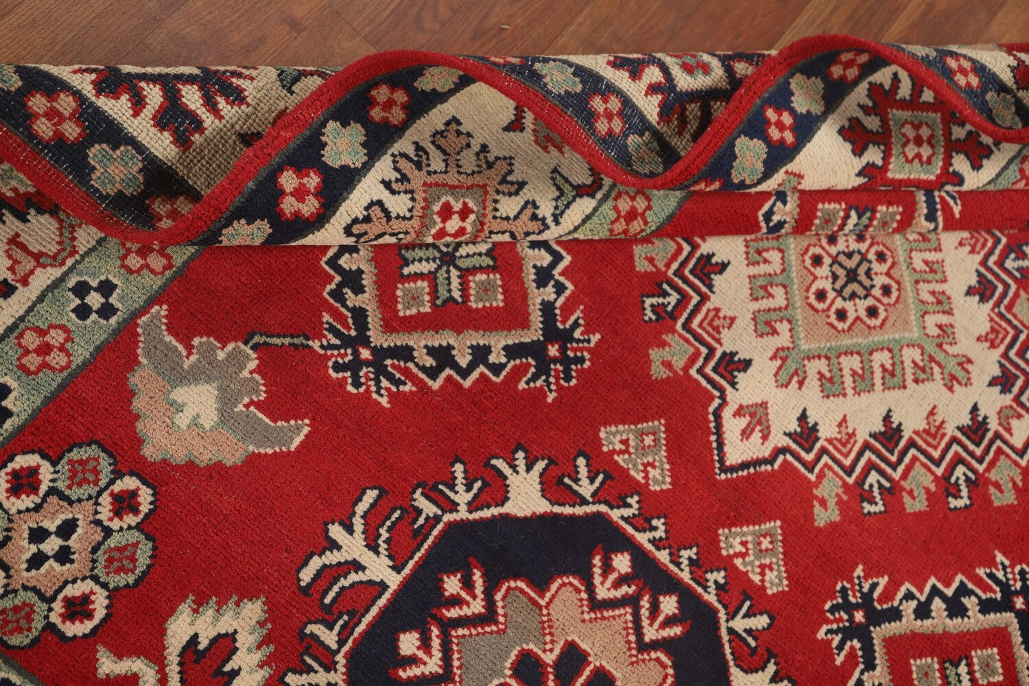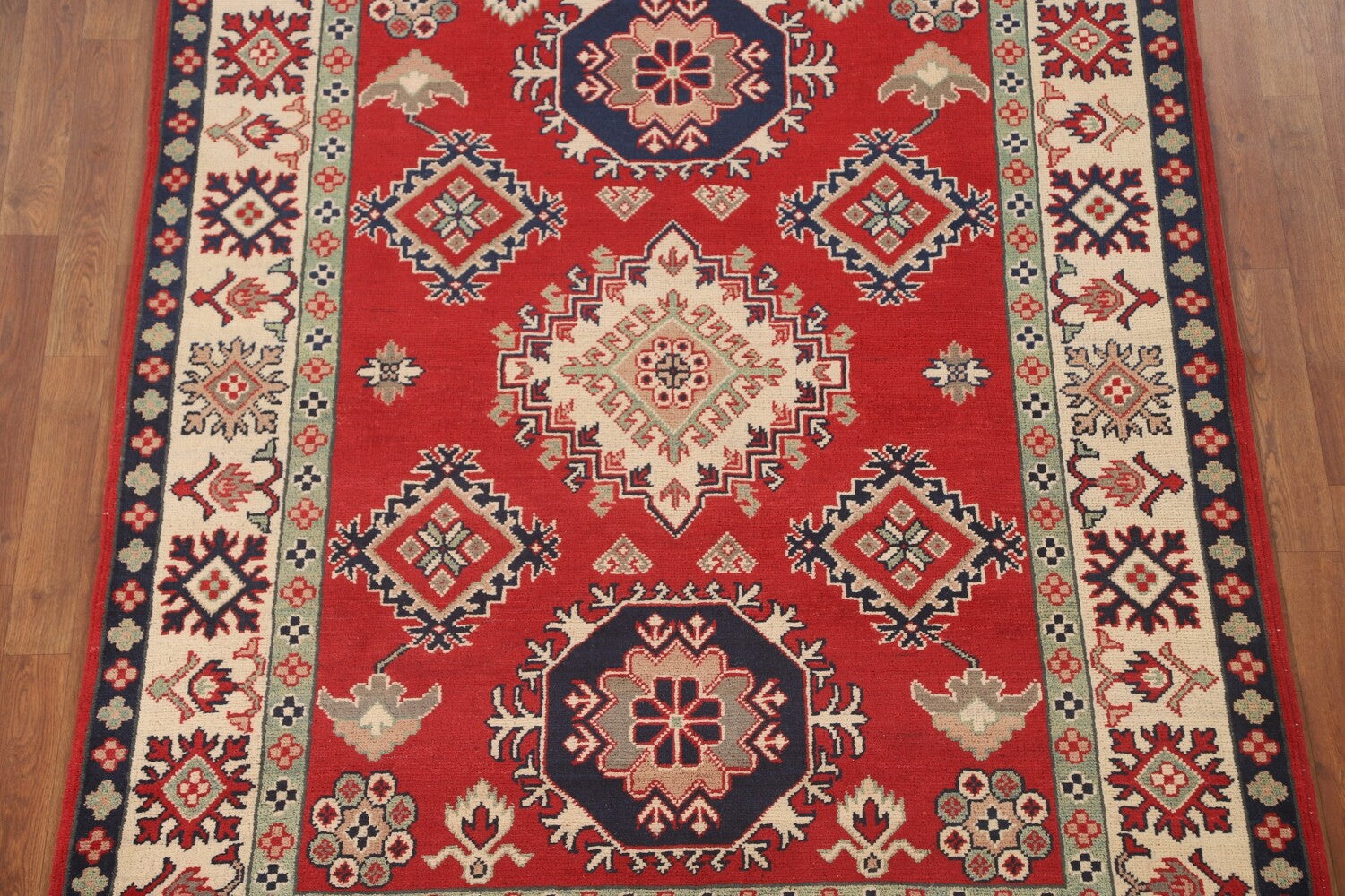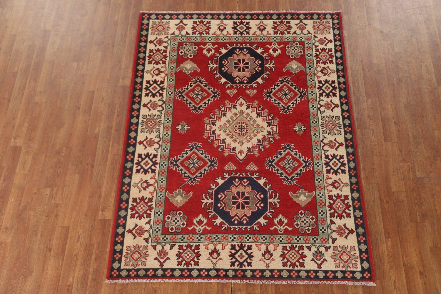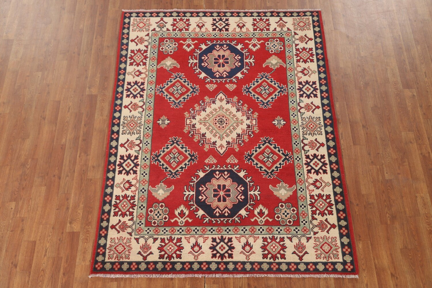 A Beautiful Genuine Pakistan Kazak rug is Hand Knotted by skillful weavers in Pakistan with 100% Wool Material. This rug is in New, First Quality condition. dimensions are 6' 8'' X 5' 1'' in foot and 203 X 155 in centimeter. the primary color is Red.
