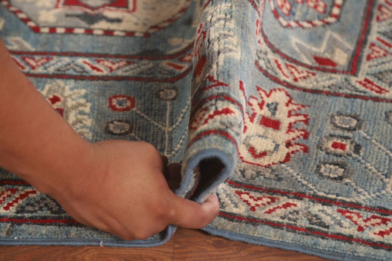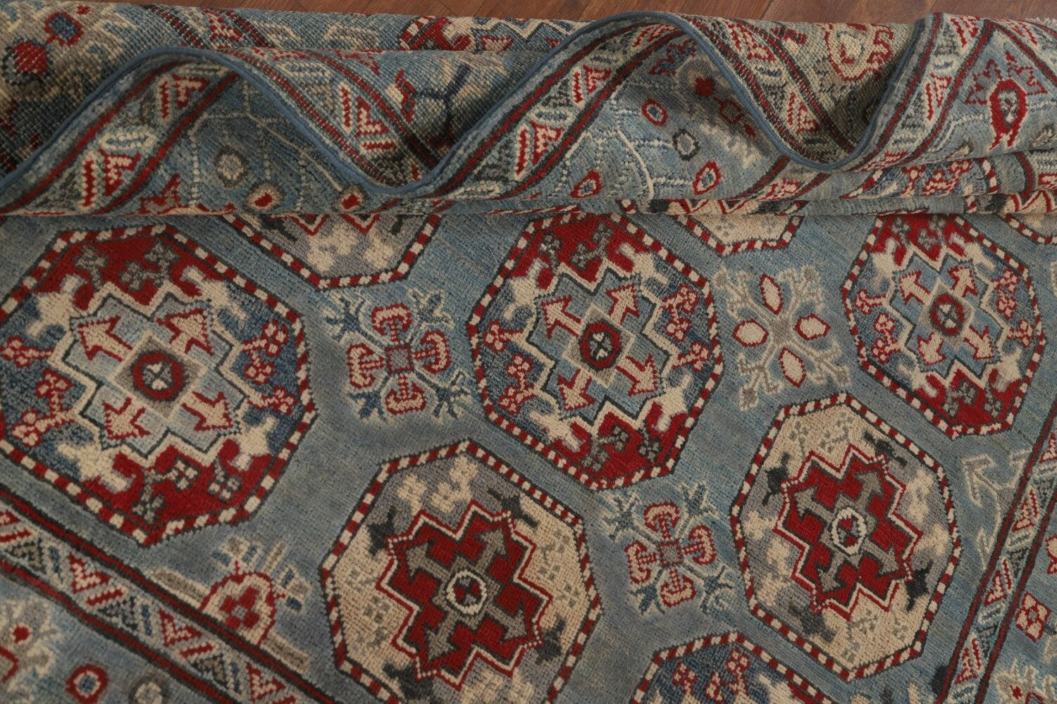 A Beautiful Genuine Pakistan Kazak rug is Hand Knotted by skillful weavers in Pakistan with 100% Wool Material. This rug is in New, First Quality condition. dimensions are 6' 7'' X 5' 0'' in foot and 201 X 152 in centimeter. the primary color is Navy Blue & Blues.