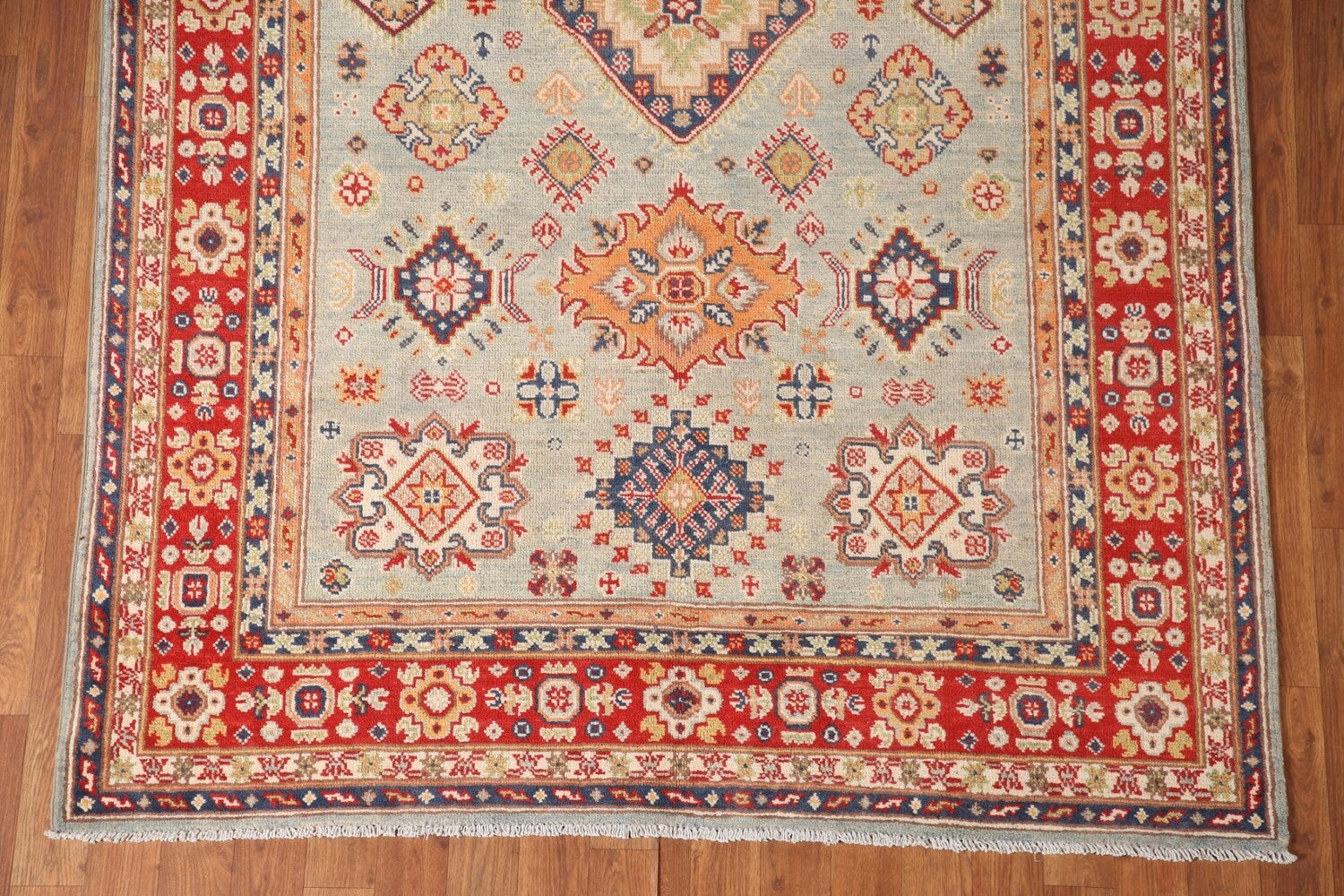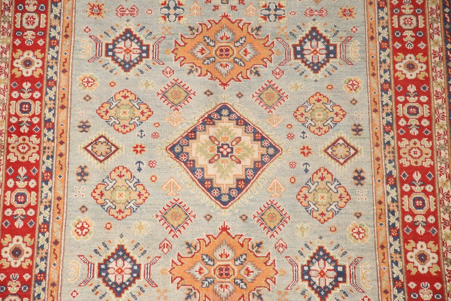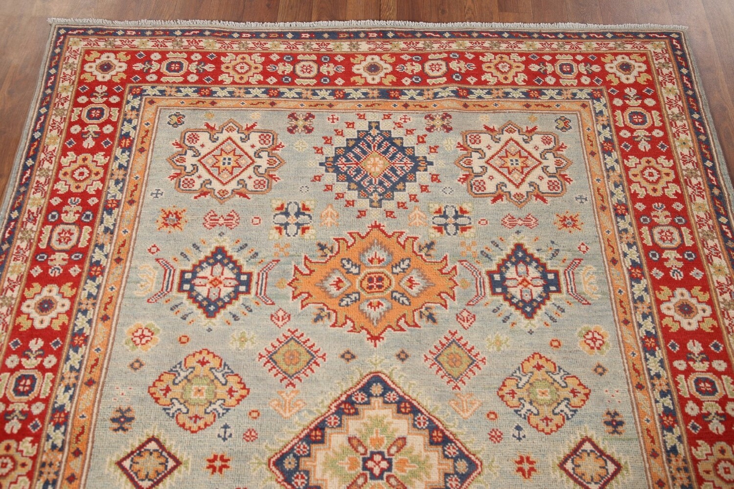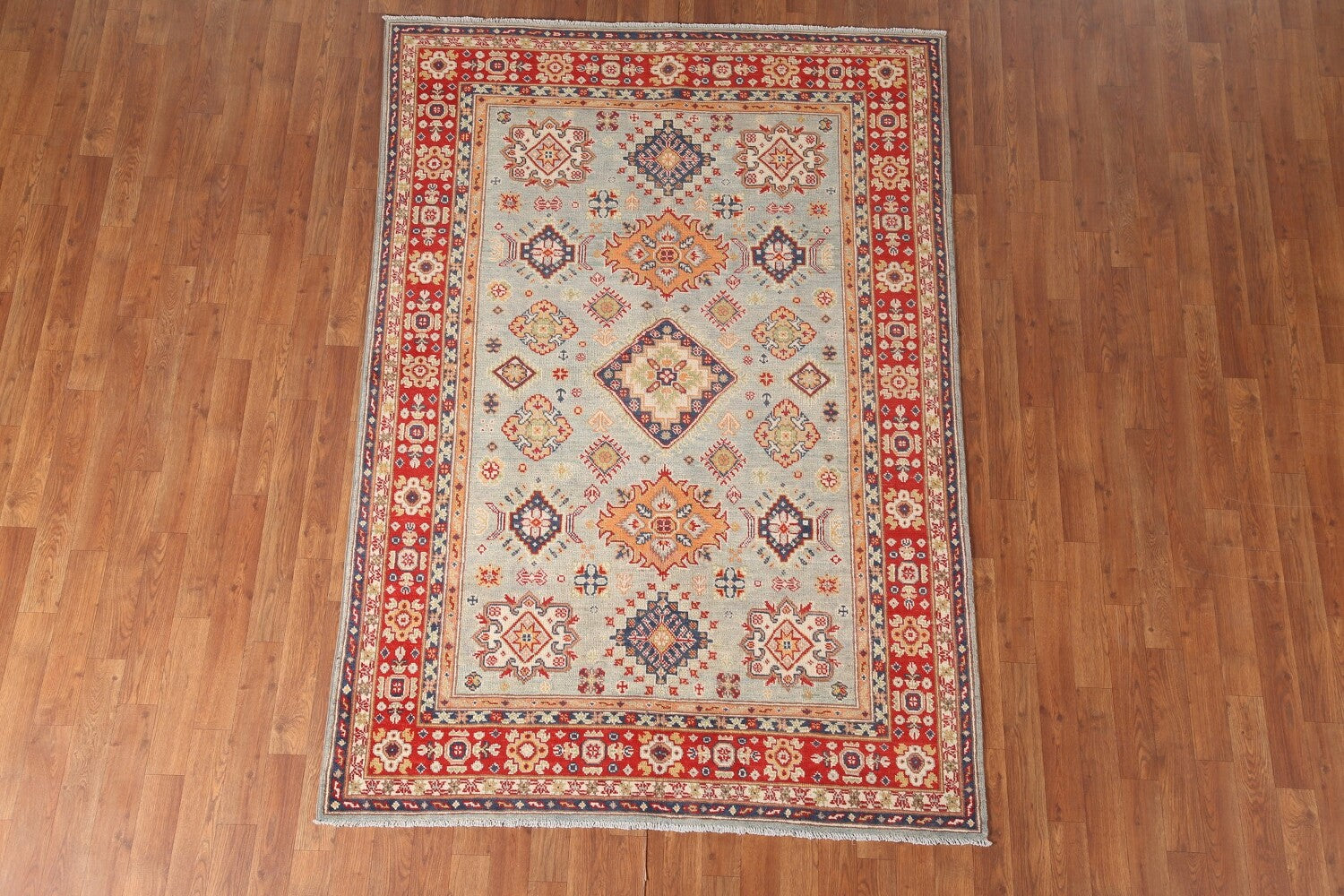 A Beautiful Genuine Pakistan Kazak rug is Hand Knotted by skillful weavers in Pakistan with 100% Wool Material. This rug is in New, First Quality condition. dimensions are 6' 11'' X 4' 10'' in foot and 211 X 147 in centimeter. the primary color is Navy Blue & Blues.