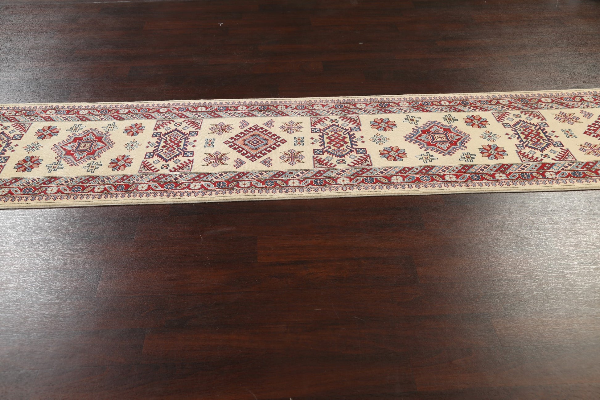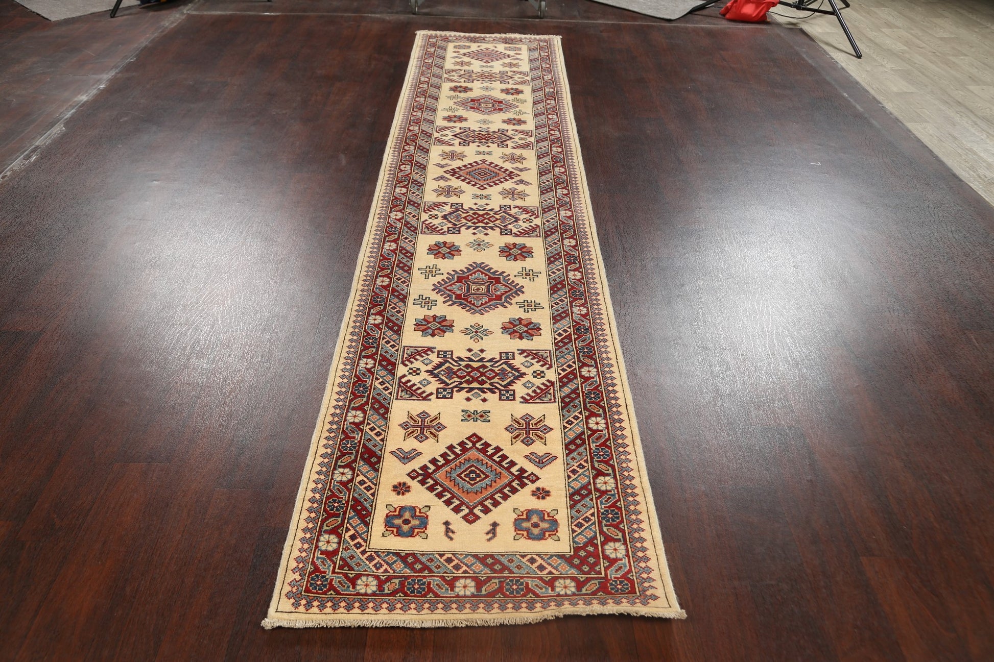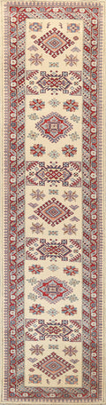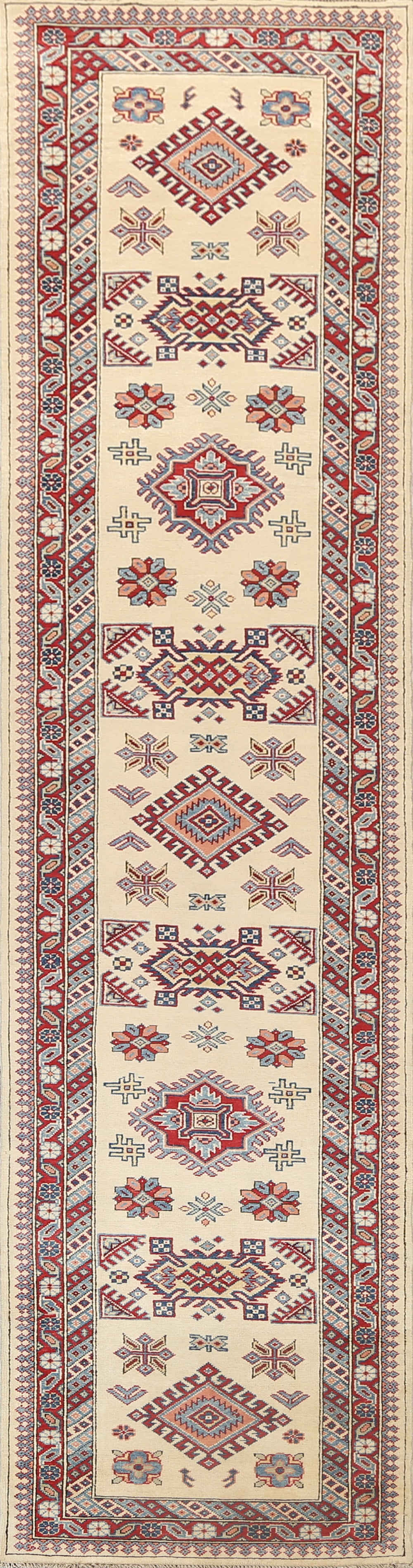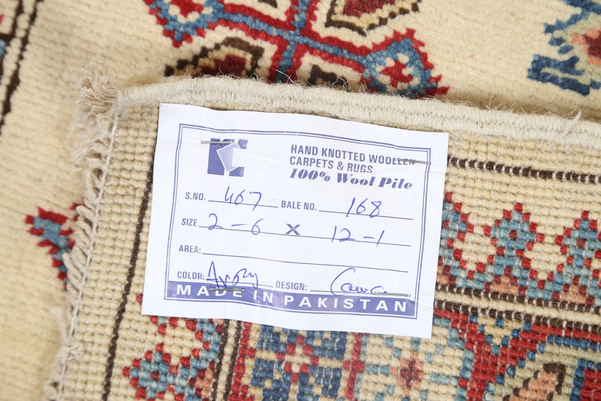 A Beautiful Genuine Pakistan Kazak rug is Hand Knotted by skillful weavers in Pakistan with 100% Wool Material. This rug is in New, First Quality condition. dimensions are 12' 1'' X 2' 5'' in foot and 368 X 74 in centimeter. the primary color is Beige & Ivories.