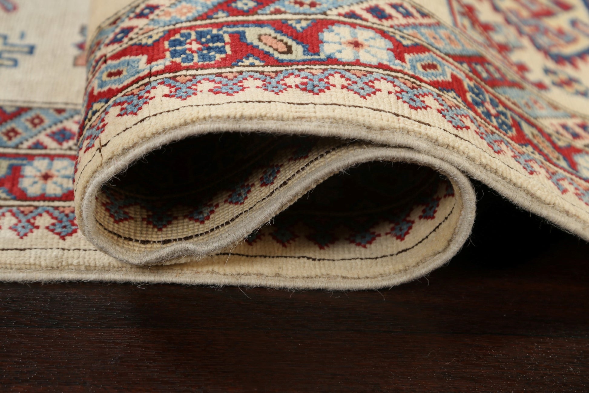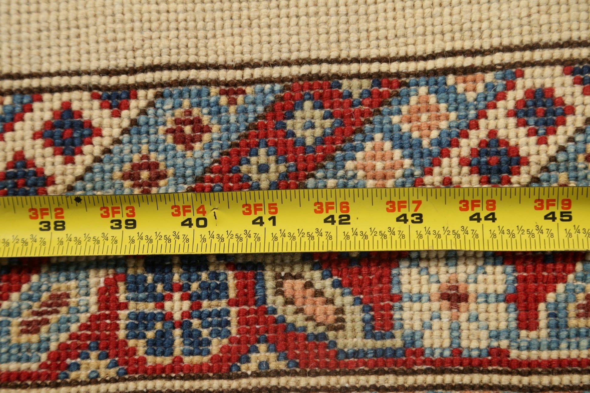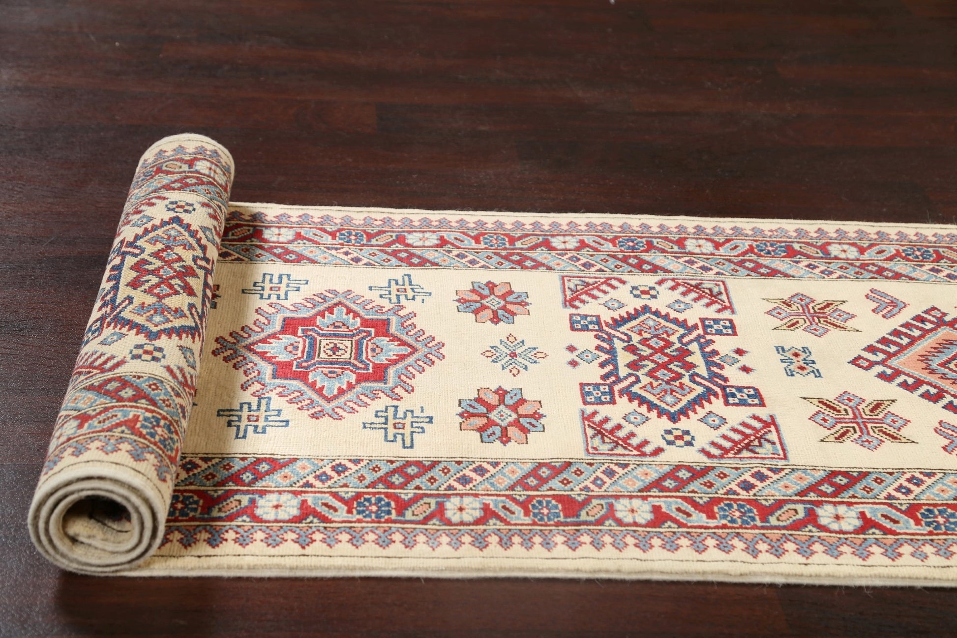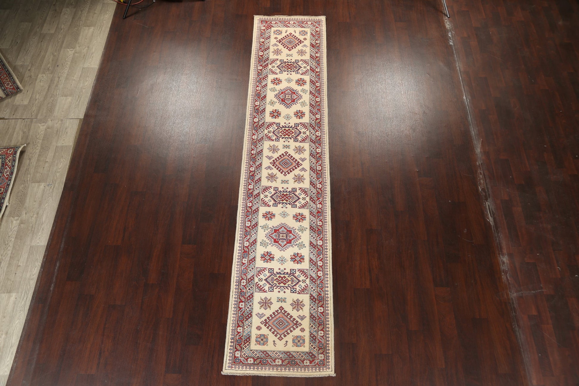 A Beautiful Genuine Pakistan Kazak rug is Hand Knotted by skillful weavers in Pakistan with 100% Wool Material. This rug is in New, First Quality condition. dimensions are 12' 1'' X 2' 5'' in foot and 368 X 74 in centimeter. the primary color is Beige & Ivories.
