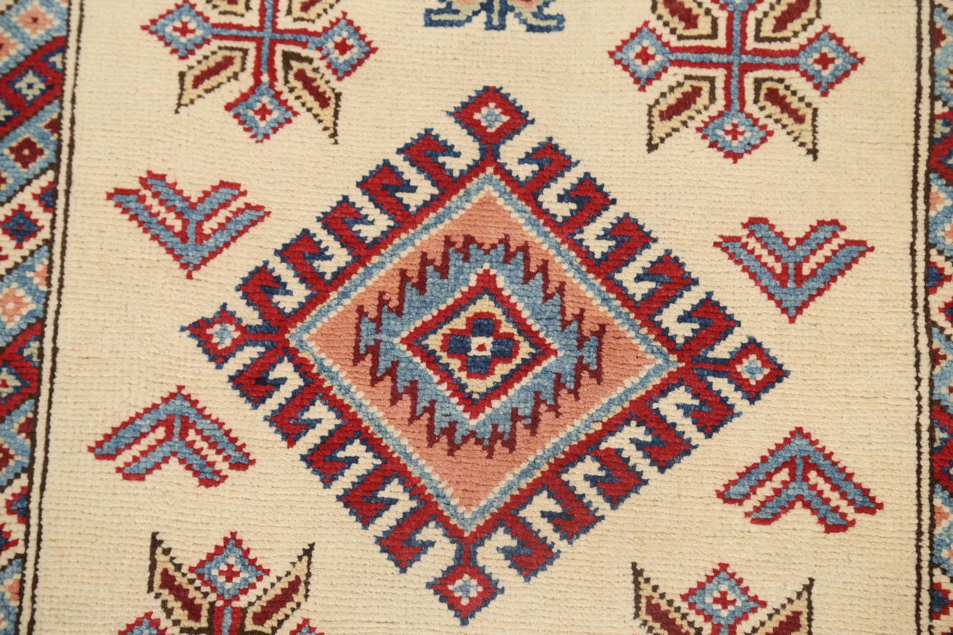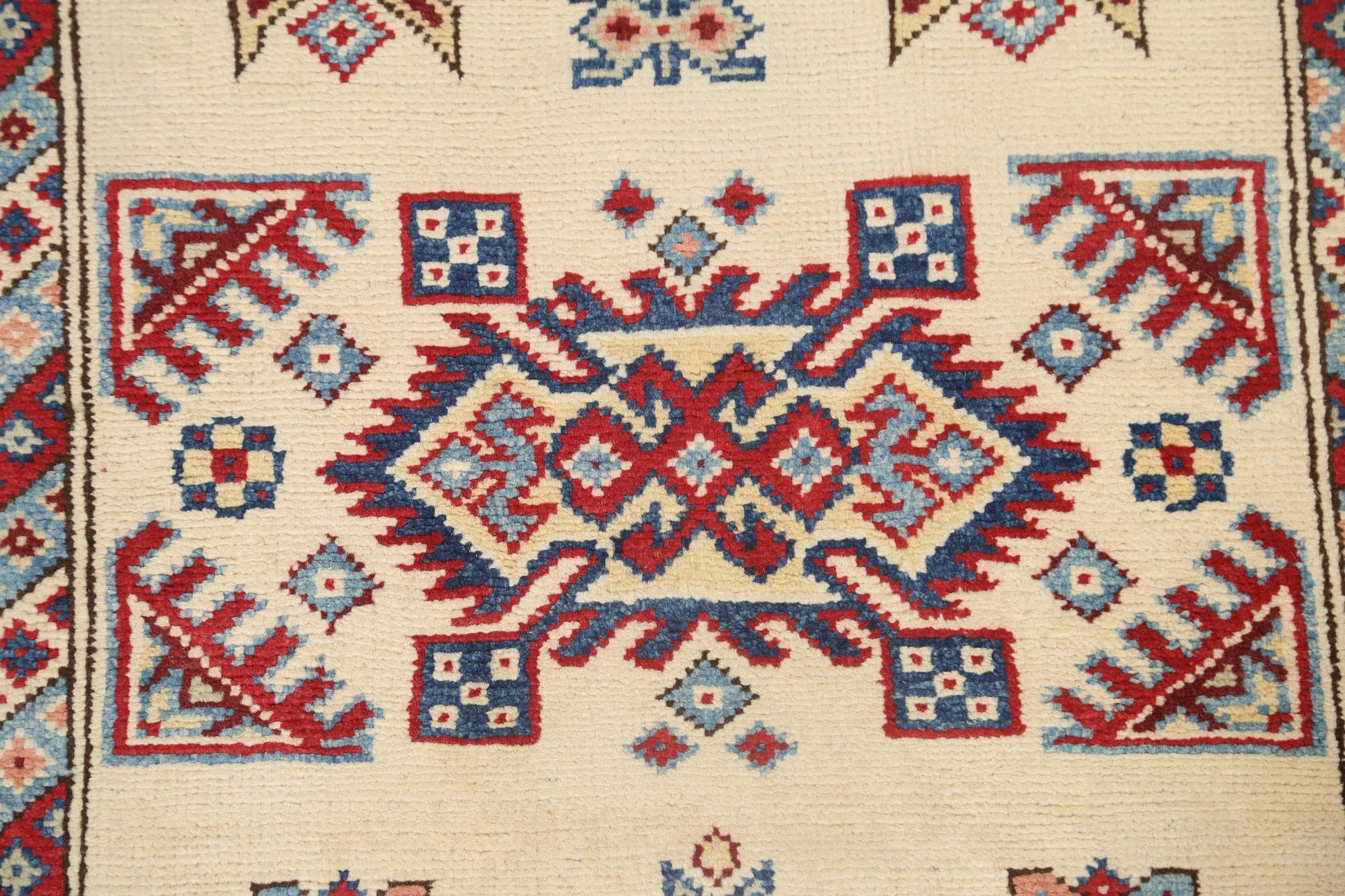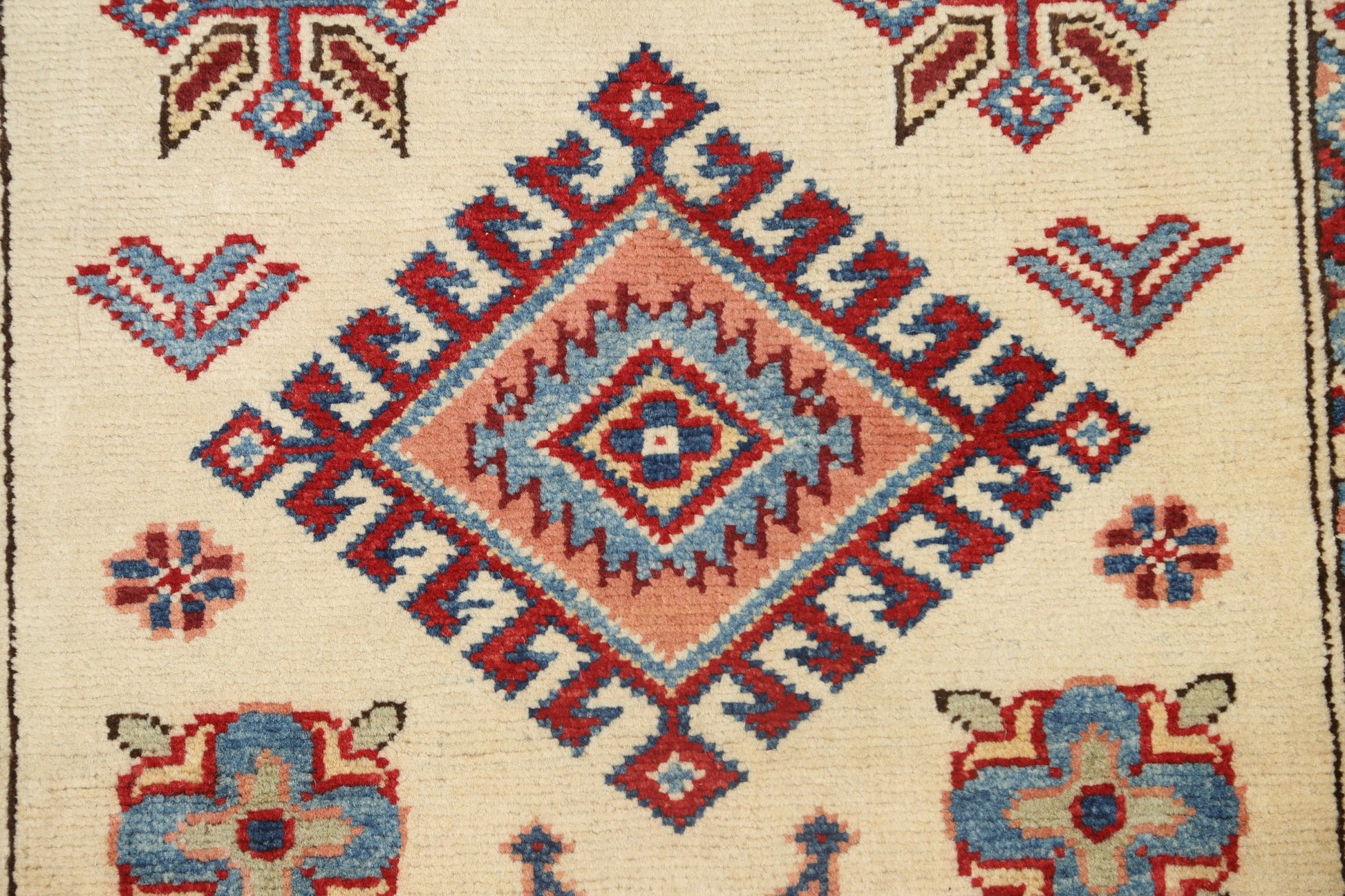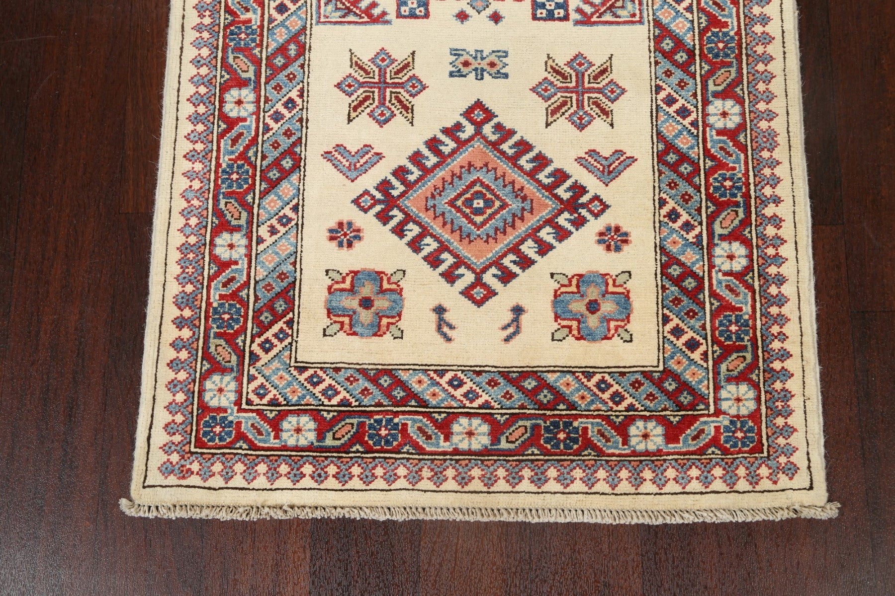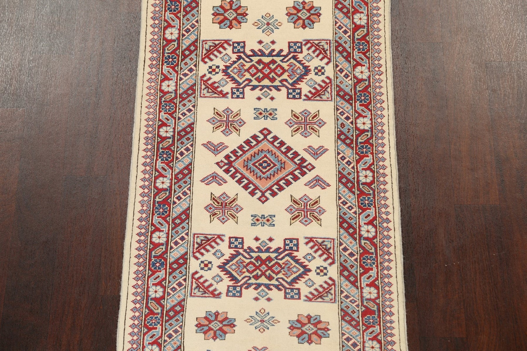 A Beautiful Genuine Pakistan Kazak rug is Hand Knotted by skillful weavers in Pakistan with 100% Wool Material. This rug is in New, First Quality condition. dimensions are 12' 1'' X 2' 5'' in foot and 368 X 74 in centimeter. the primary color is Beige & Ivories.
