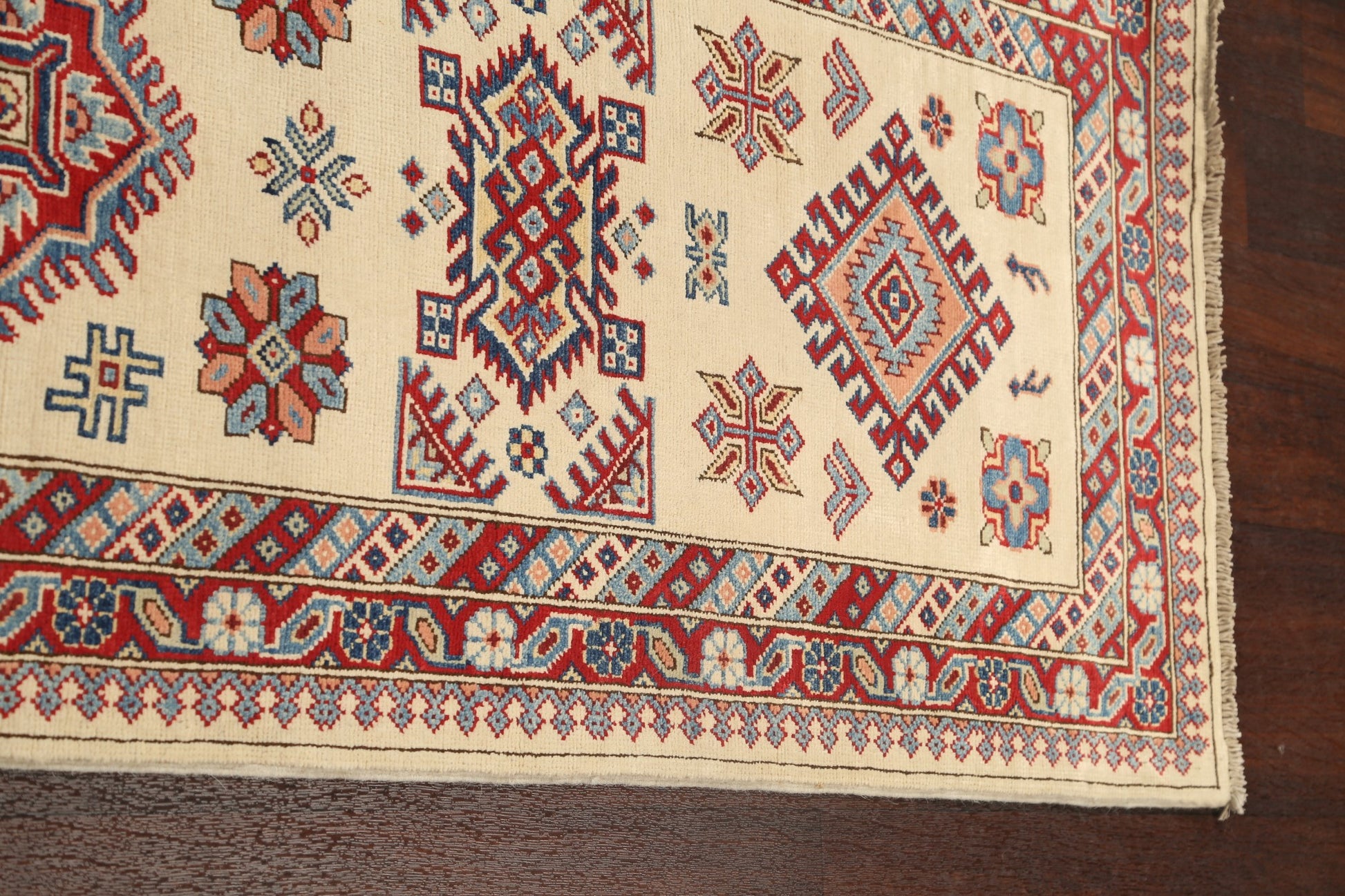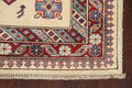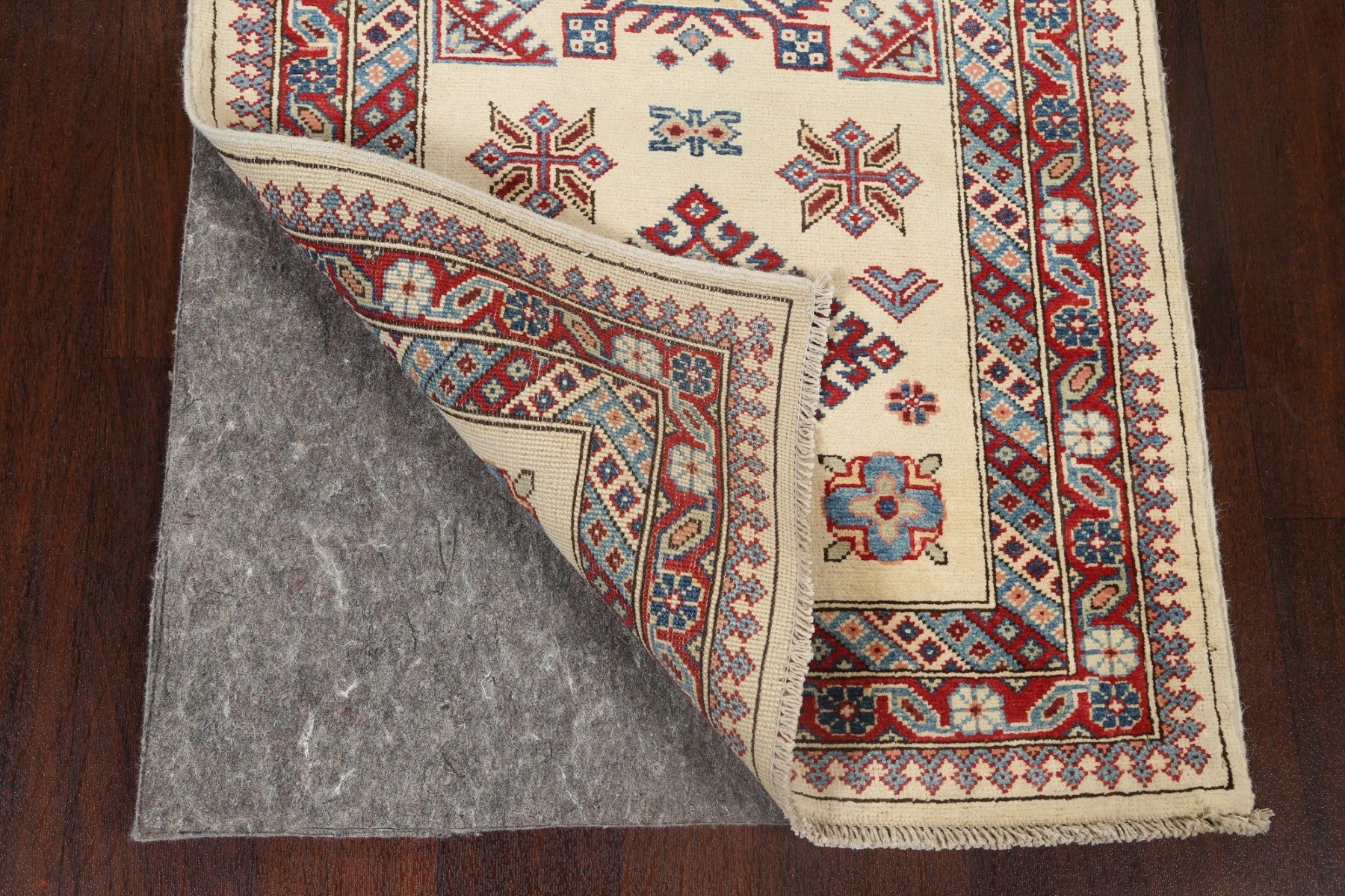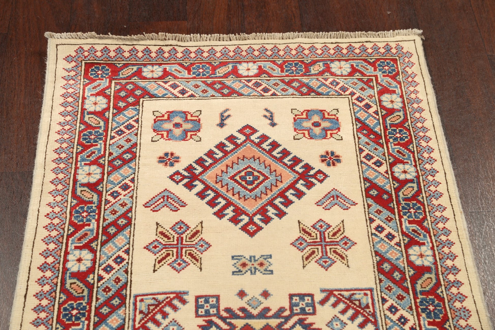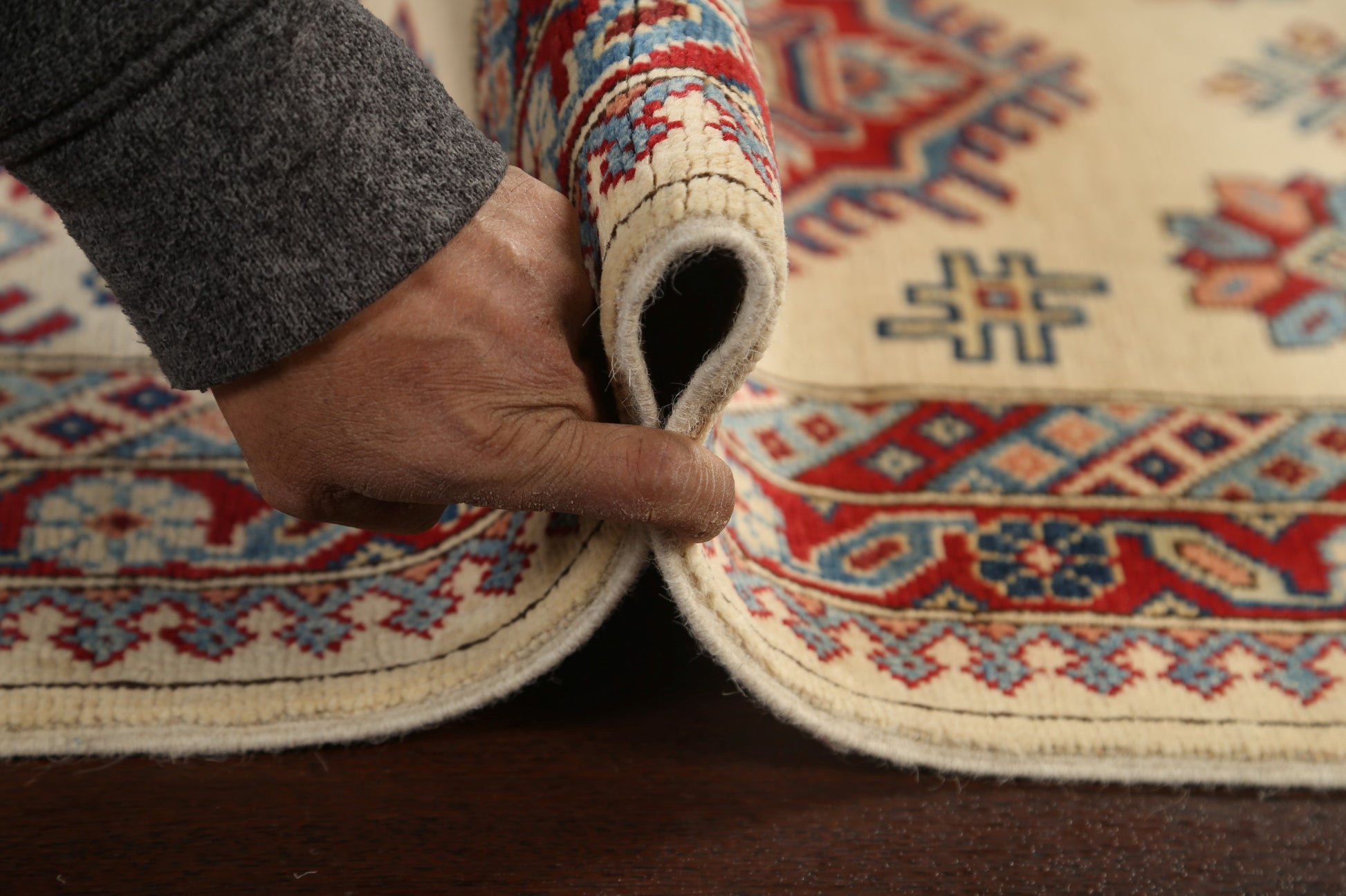 A Beautiful Genuine Pakistan Kazak rug is Hand Knotted by skillful weavers in Pakistan with 100% Wool Material. This rug is in New, First Quality condition. dimensions are 12' 1'' X 2' 5'' in foot and 368 X 74 in centimeter. the primary color is Beige & Ivories.