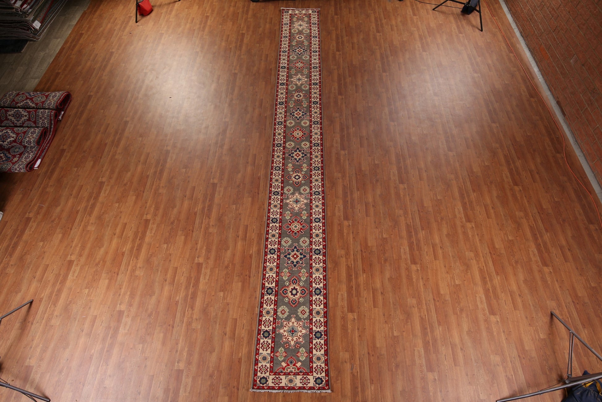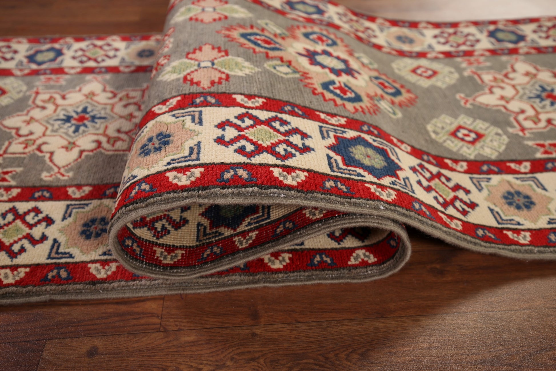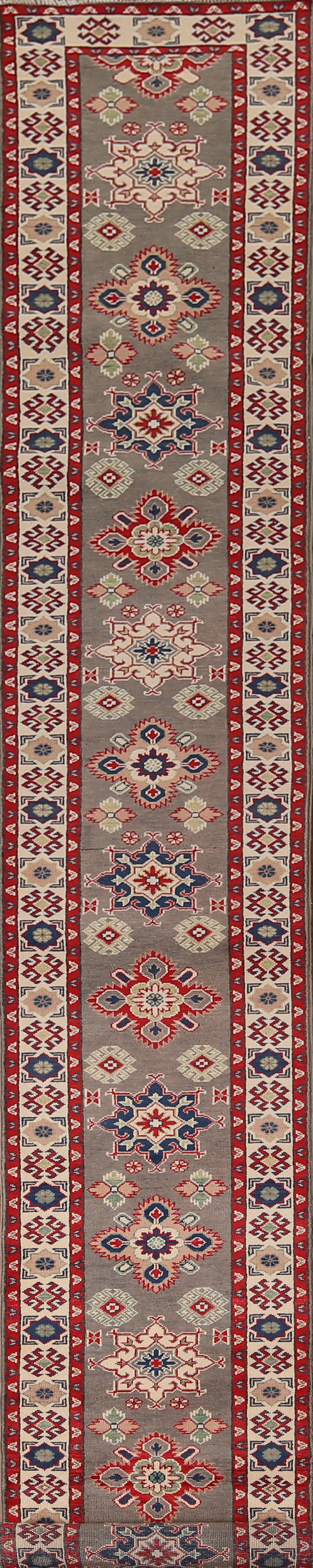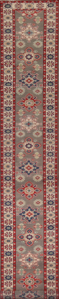 A Beautiful Genuine Pakistan Kazak rug is Hand Knotted by skillful weavers in Pakistan with 100% Wool Material. This rug is in New, First Quality condition. dimensions are 19' 2'' X 2' 1'' in foot and 584 X 64 in centimeter. the primary color is Greys & Charcoal.