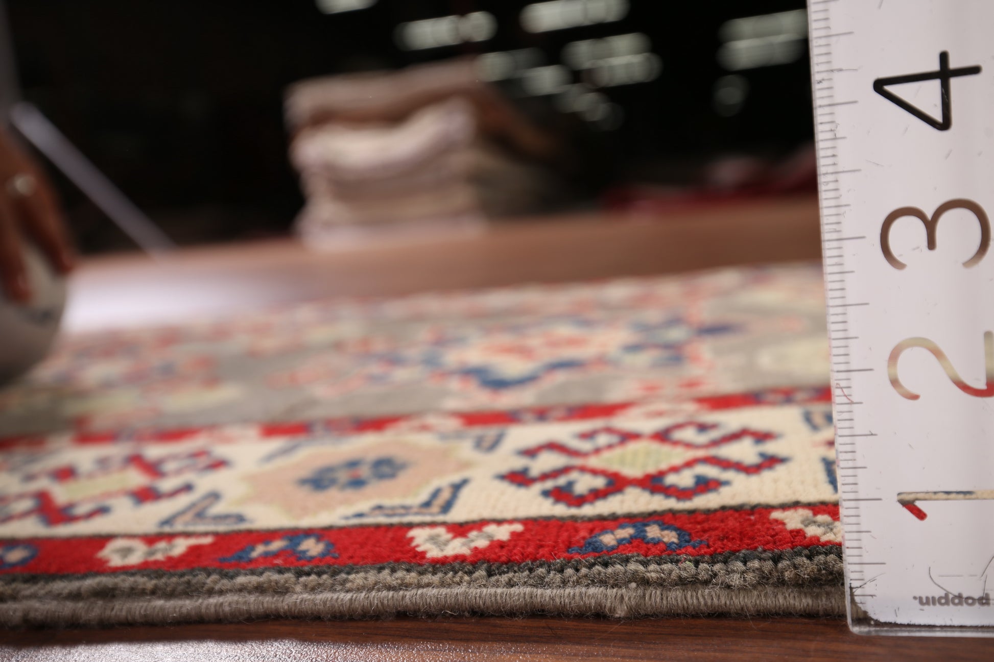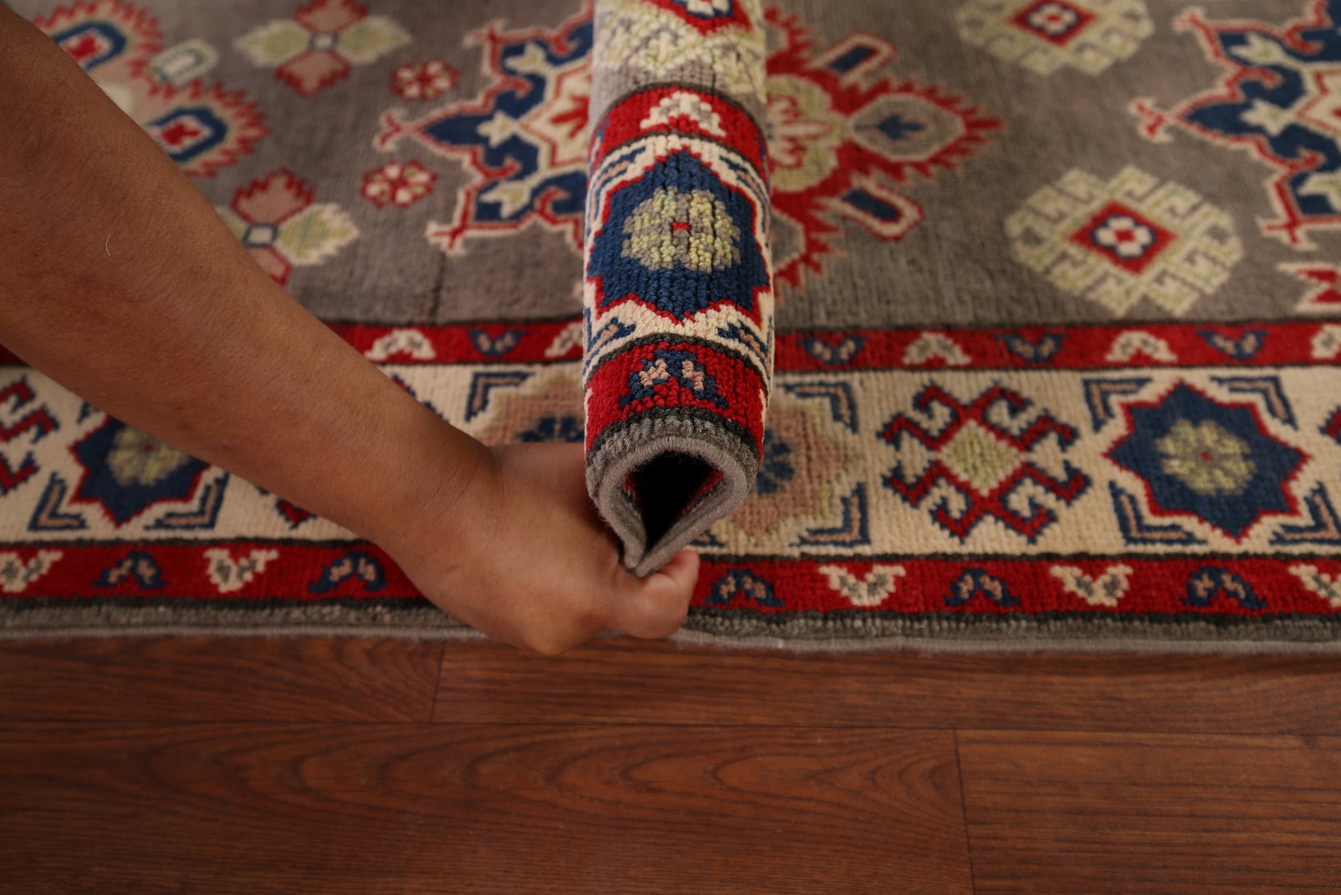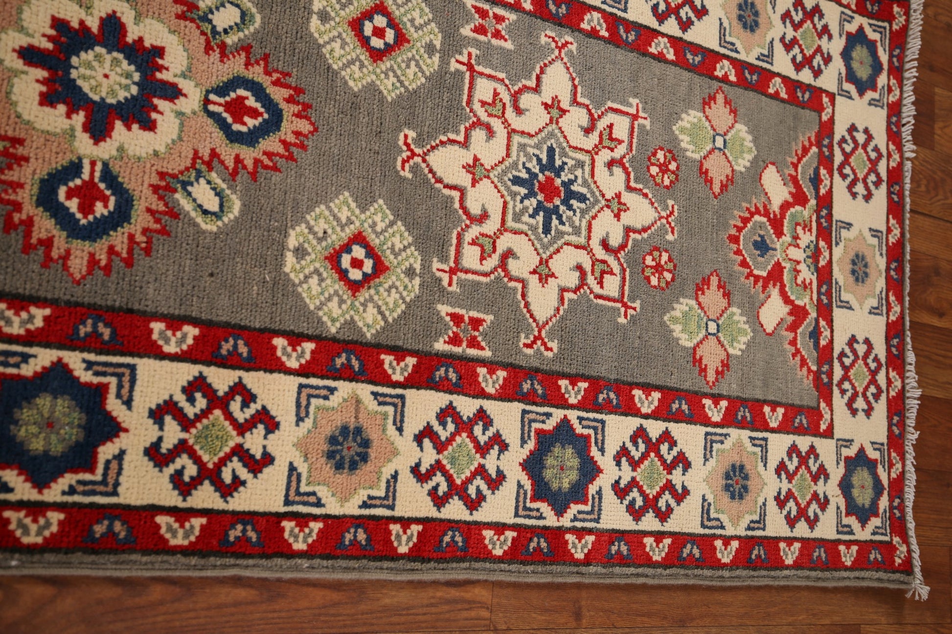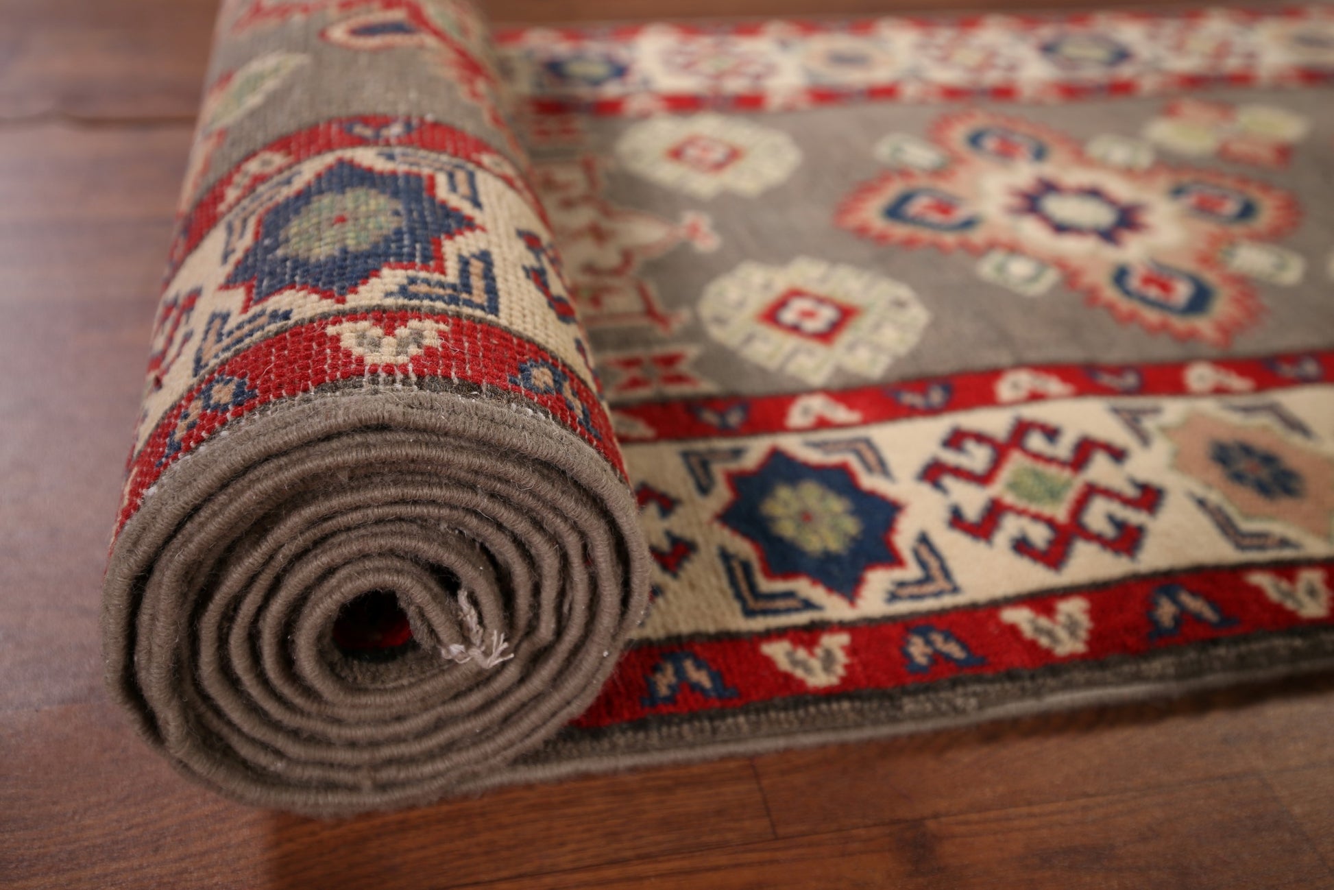 A Beautiful Genuine Pakistan Kazak rug is Hand Knotted by skillful weavers in Pakistan with 100% Wool Material. This rug is in New, First Quality condition. dimensions are 19' 2'' X 2' 1'' in foot and 584 X 64 in centimeter. the primary color is Greys & Charcoal.