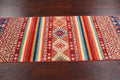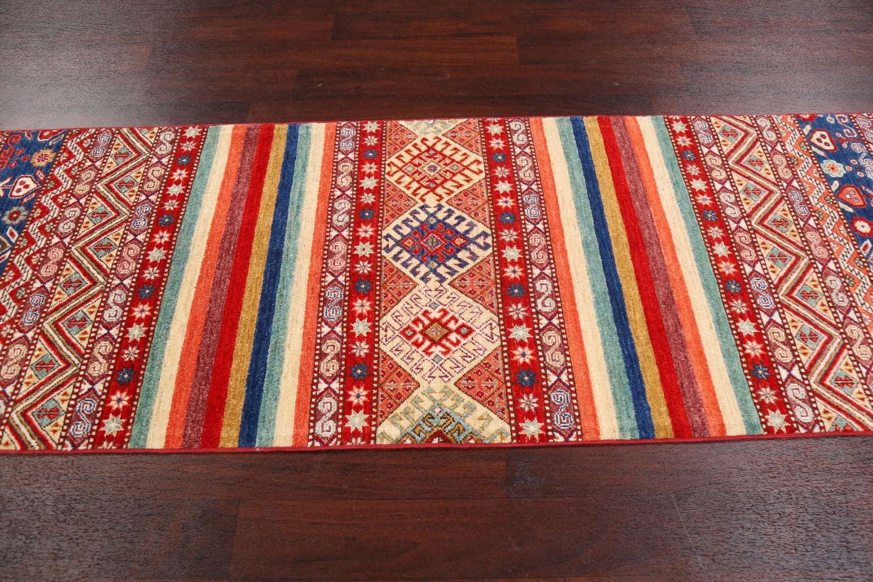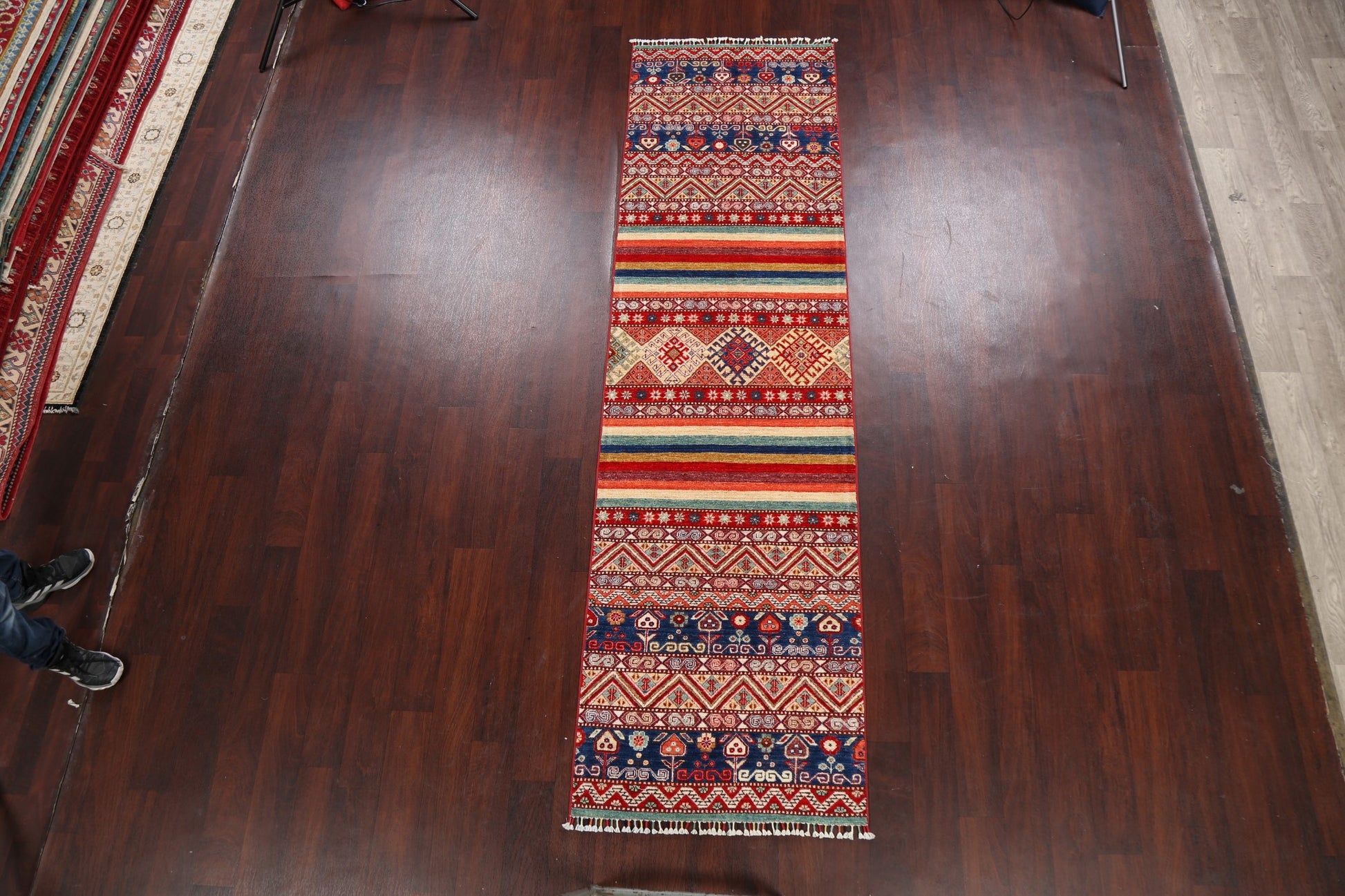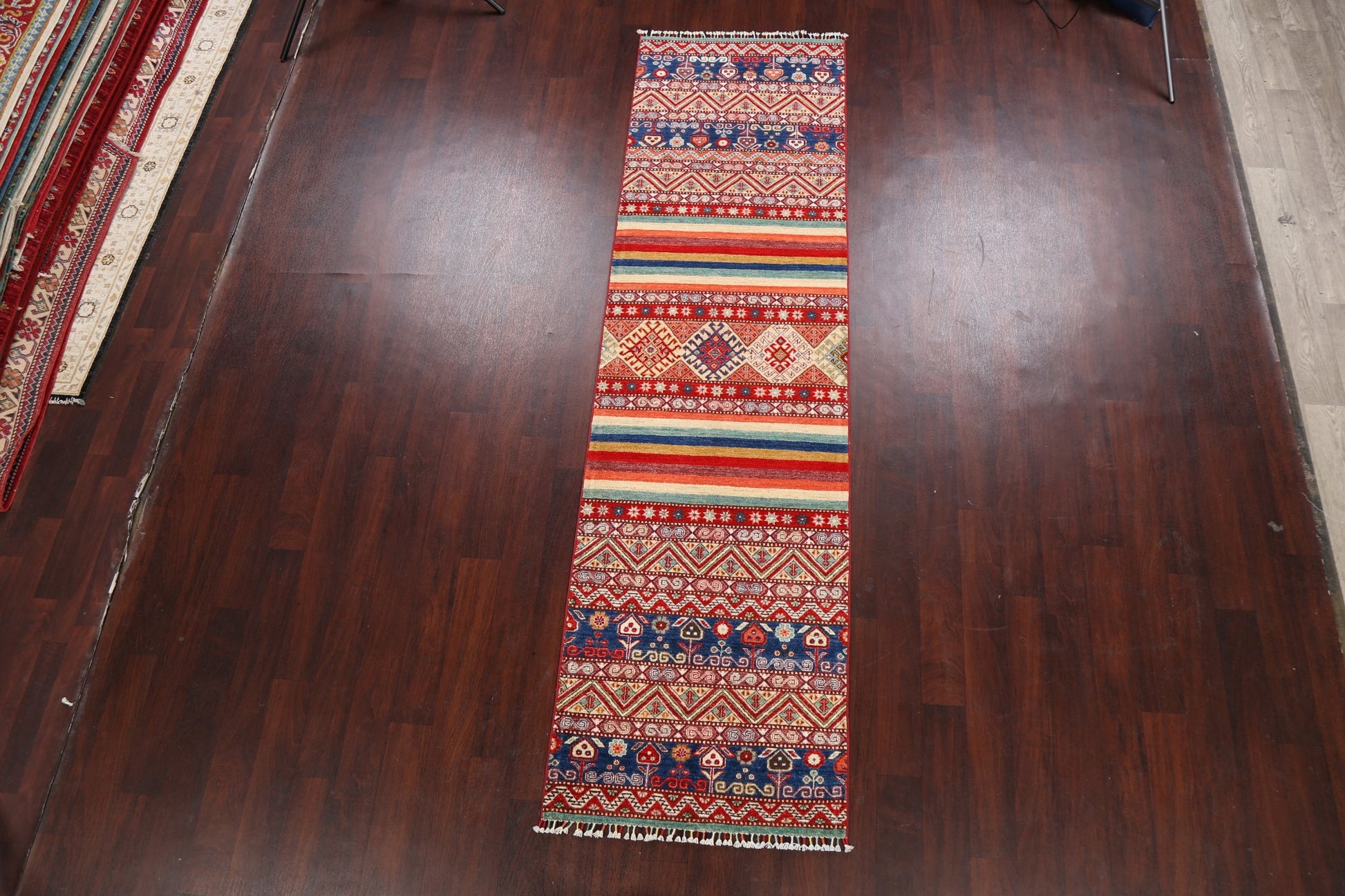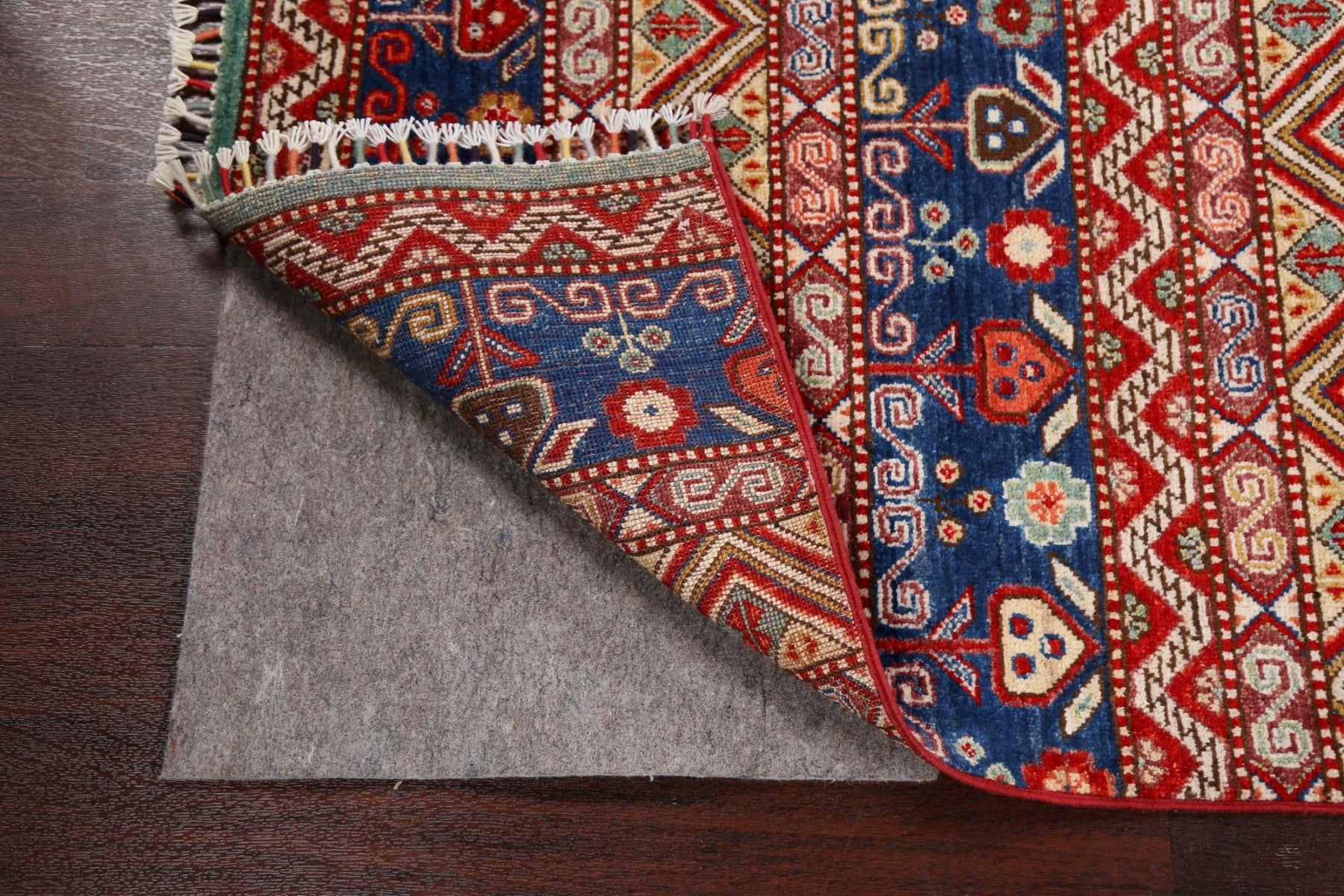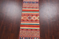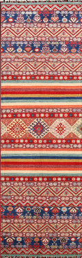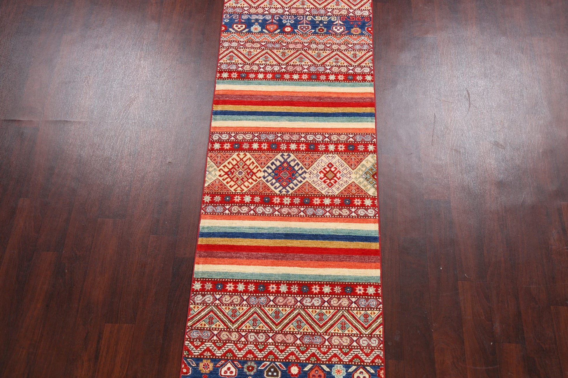 A Beautiful Genuine Pakistan Kazak rug is Hand Knotted by skillful weavers in Pakistan with 100% Wool Material. This rug is in New, First Quality condition. dimensions are 9' 9'' X 2' 8'' in foot and 297 X 81 in centimeter. the primary color is Multi-Colored.