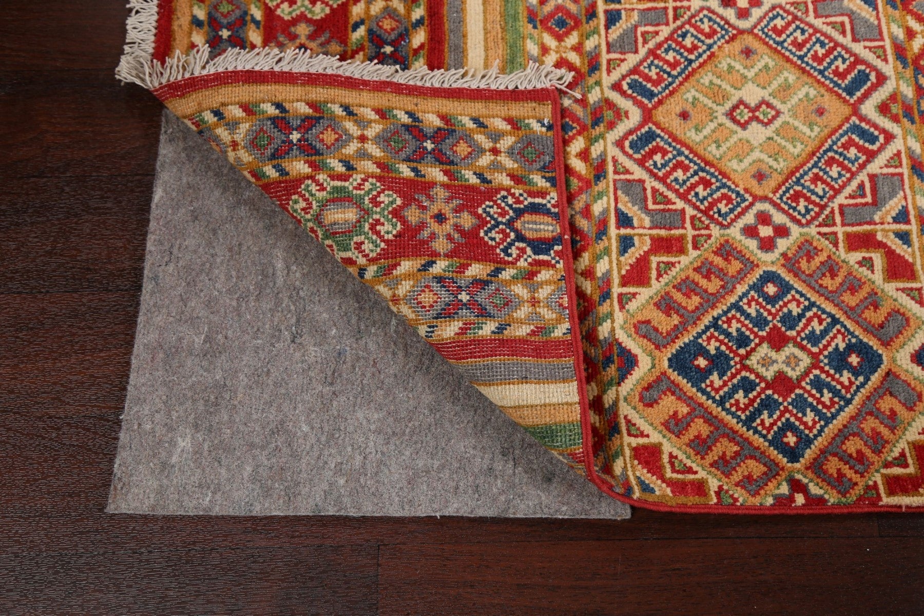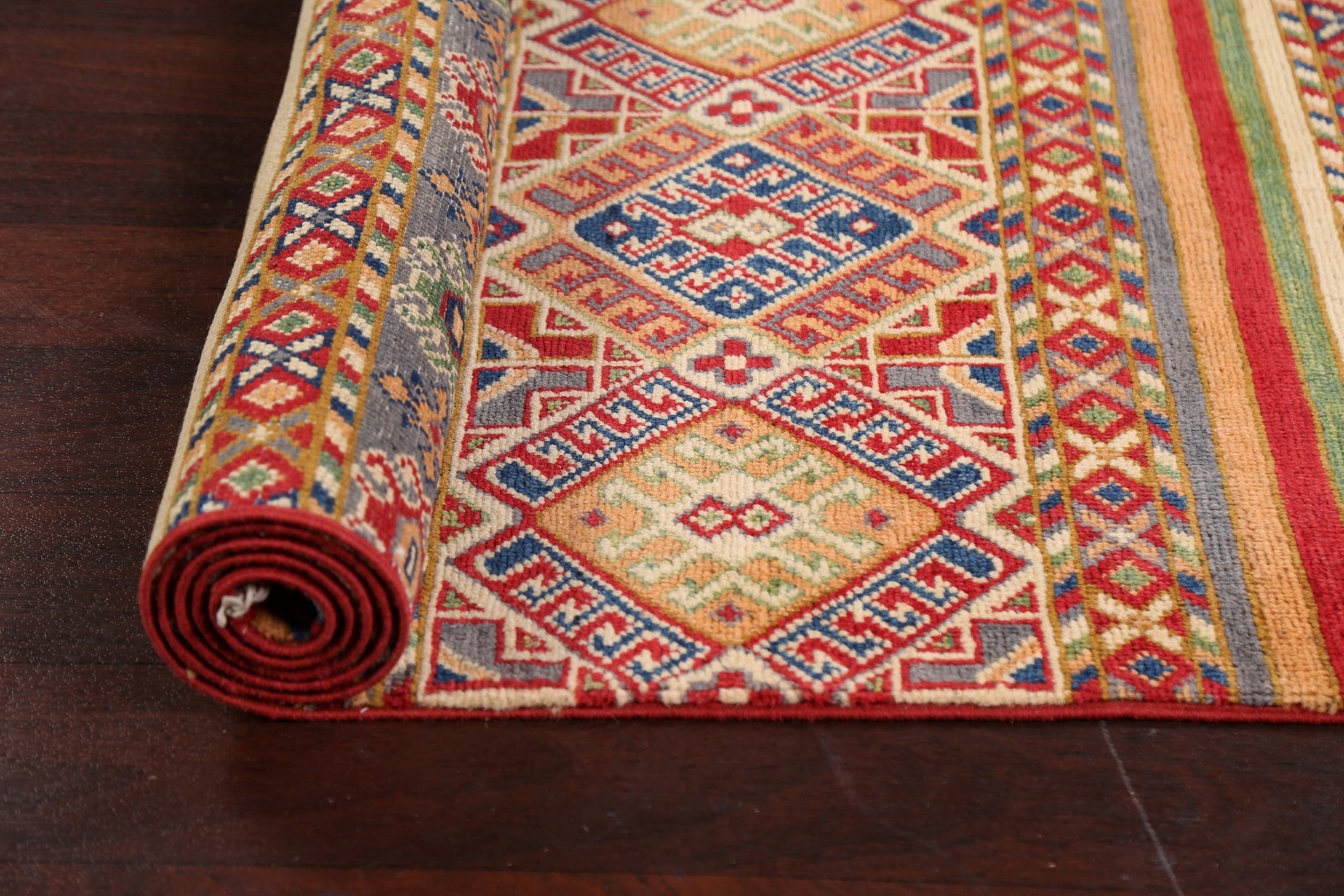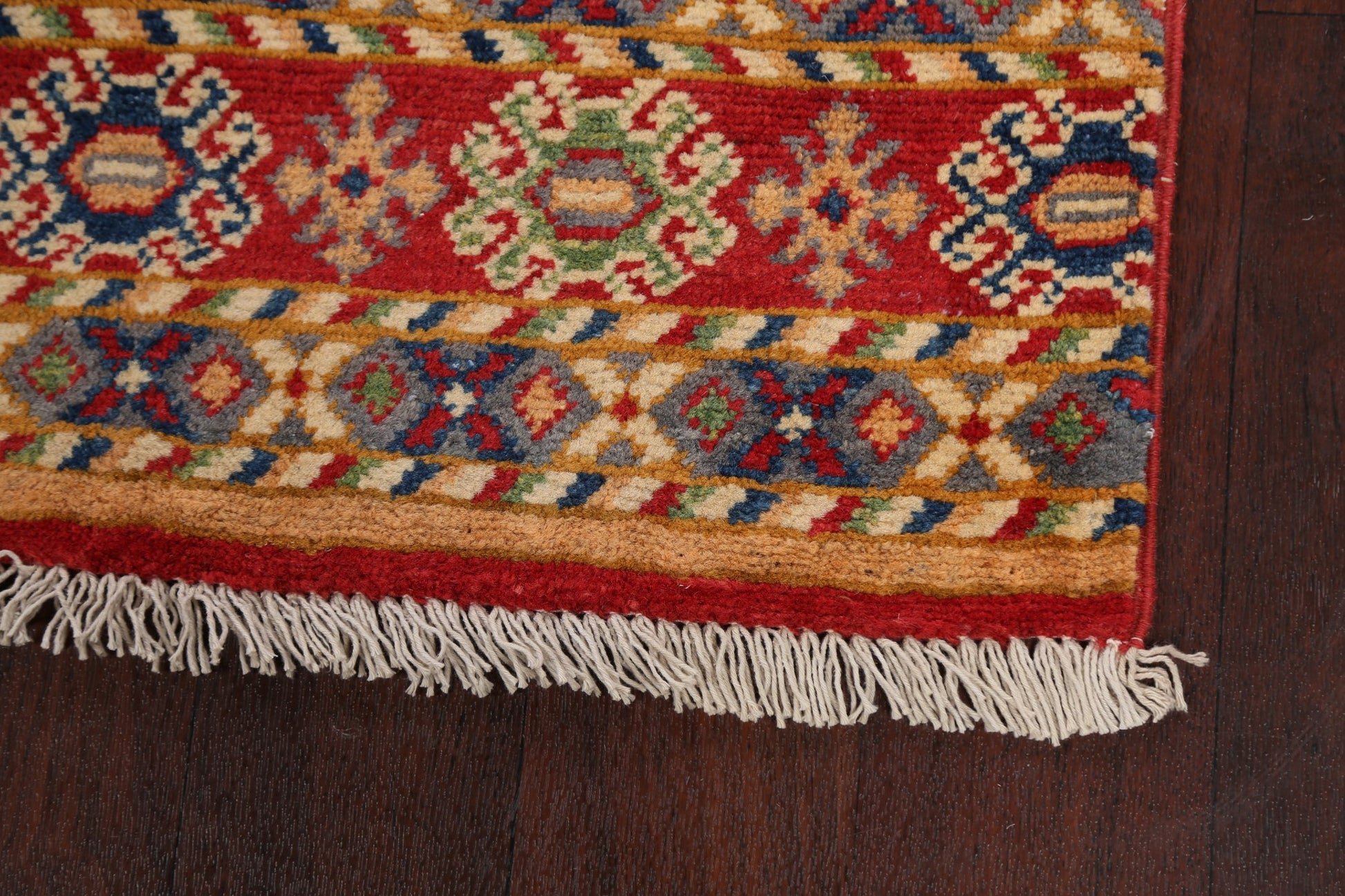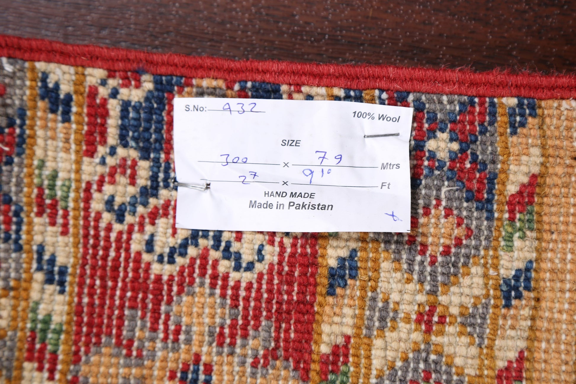 A Beautiful Genuine Pakistan Kazak rug is Hand Knotted by skillful weavers in Pakistan with 100% Wool Material. This rug is in New, First Quality condition. dimensions are 9' 10'' X 2' 7'' in foot and 300 X 79 in centimeter. the primary color is Multi-Colored.