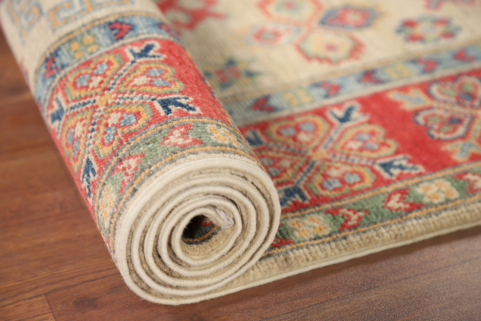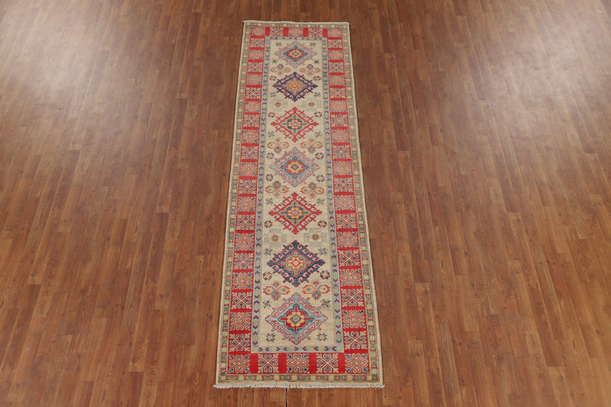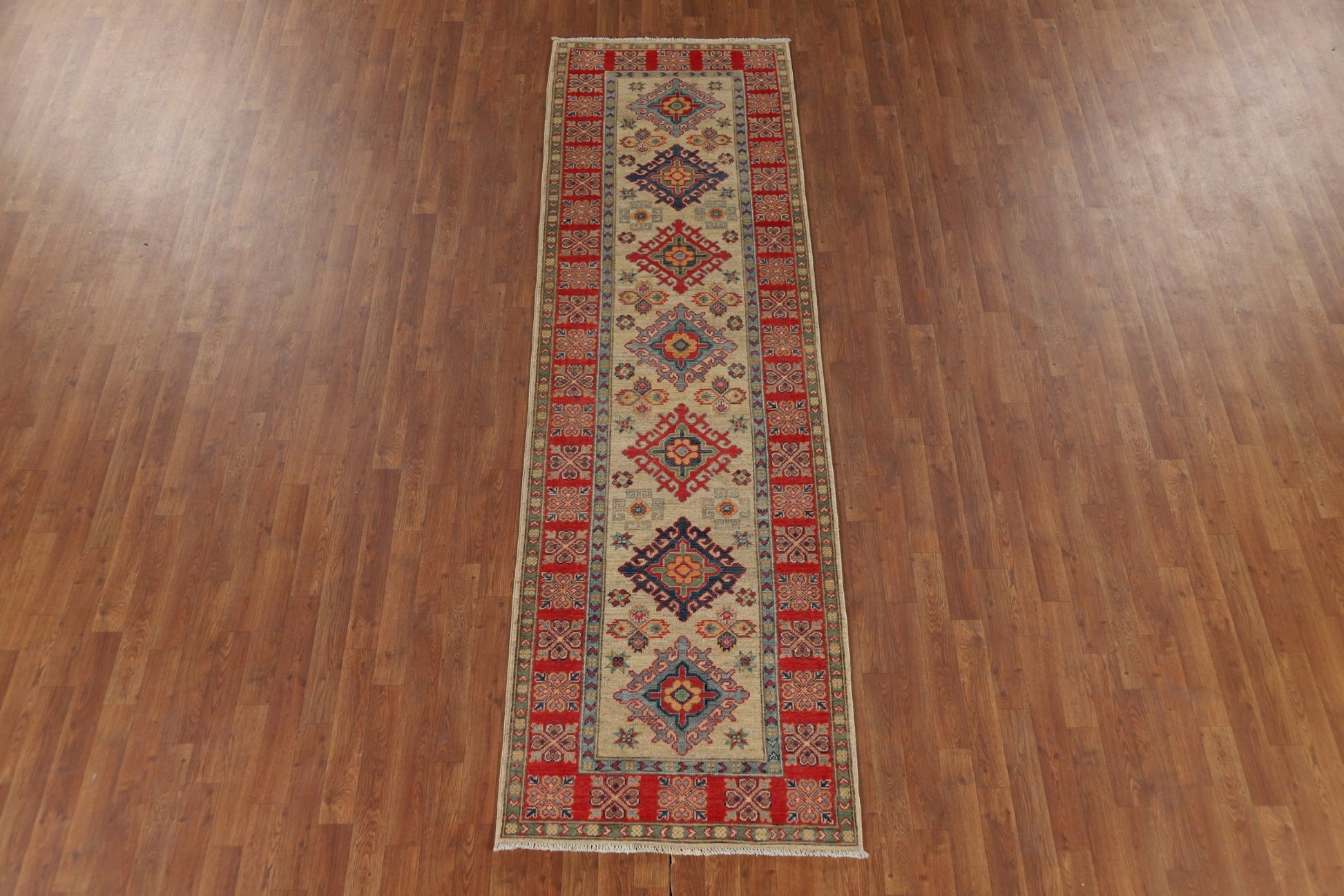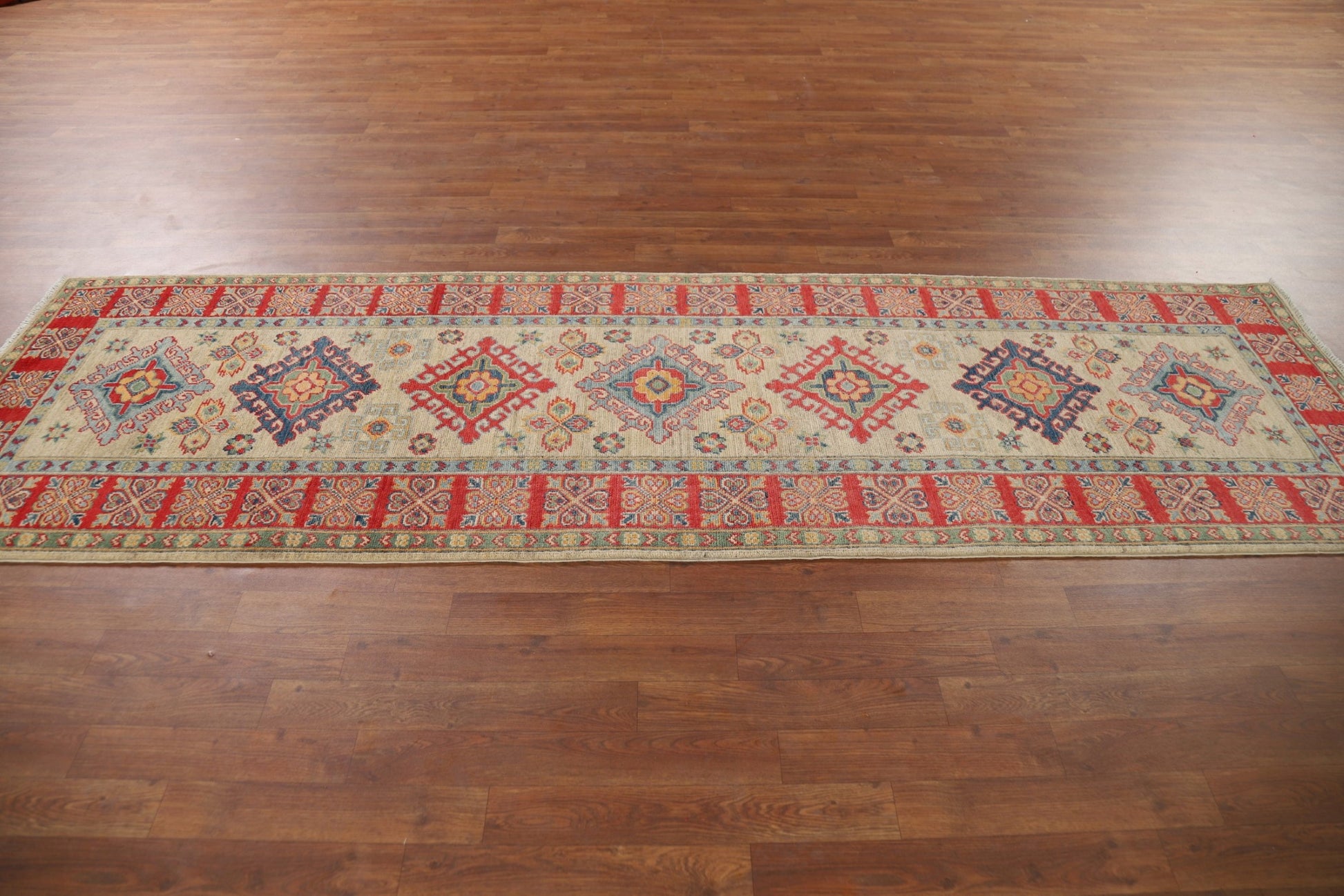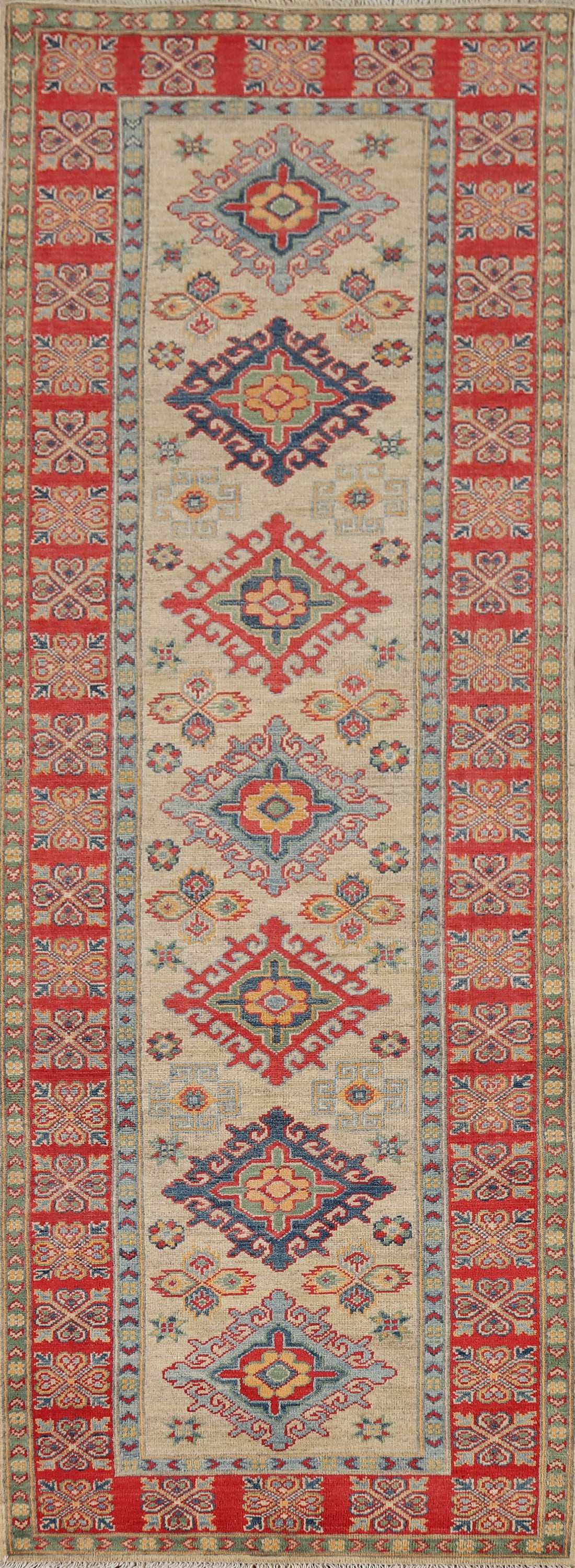 A Beautiful Genuine Pakistan Kazak rug is Hand Knotted by skillful weavers in Pakistan with 100% Wool Material. This rug is in New, First Quality condition. dimensions are 9' 7'' X 2' 10'' in foot and 292 X 86 in centimeter. the primary color is Beige & Ivories.
