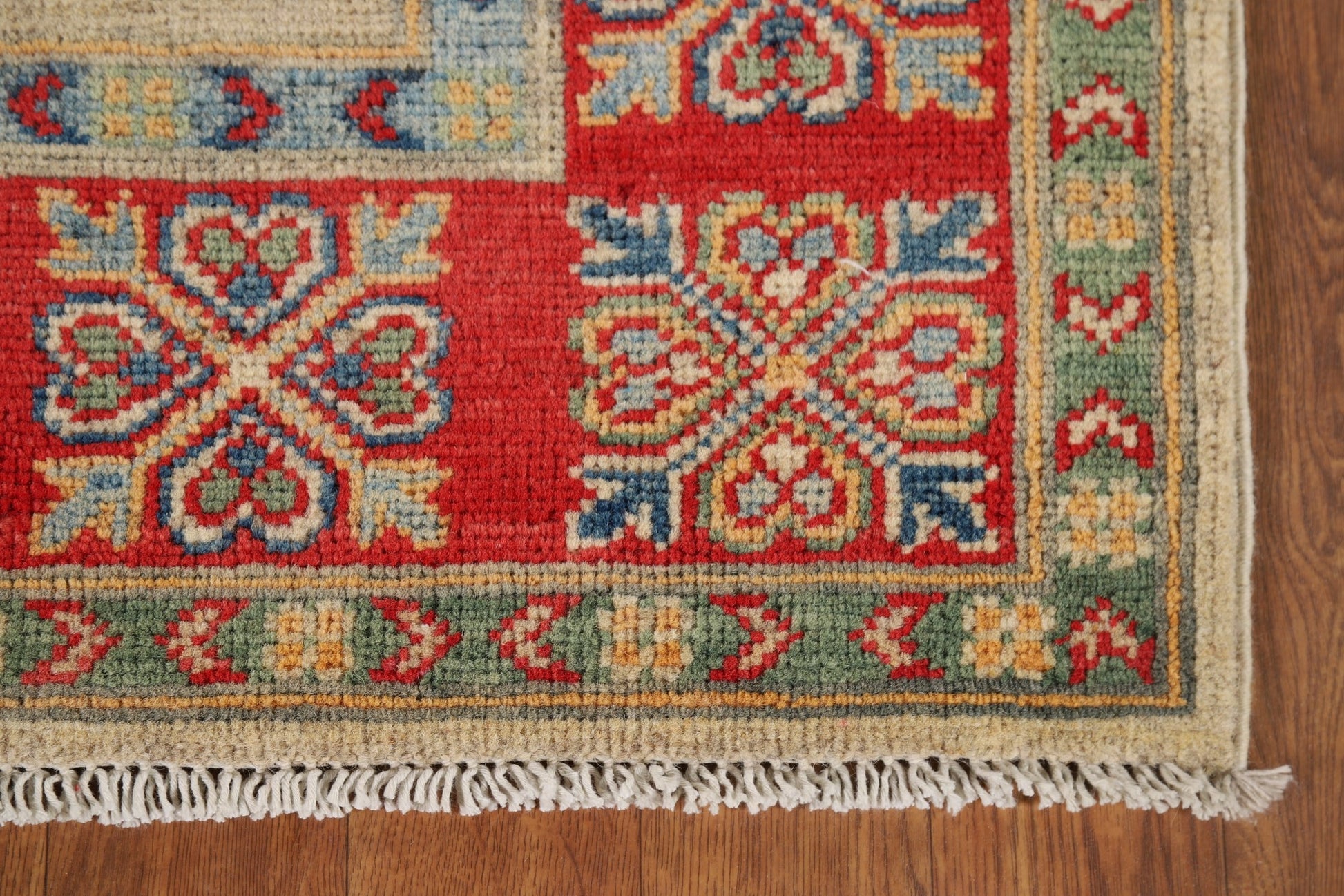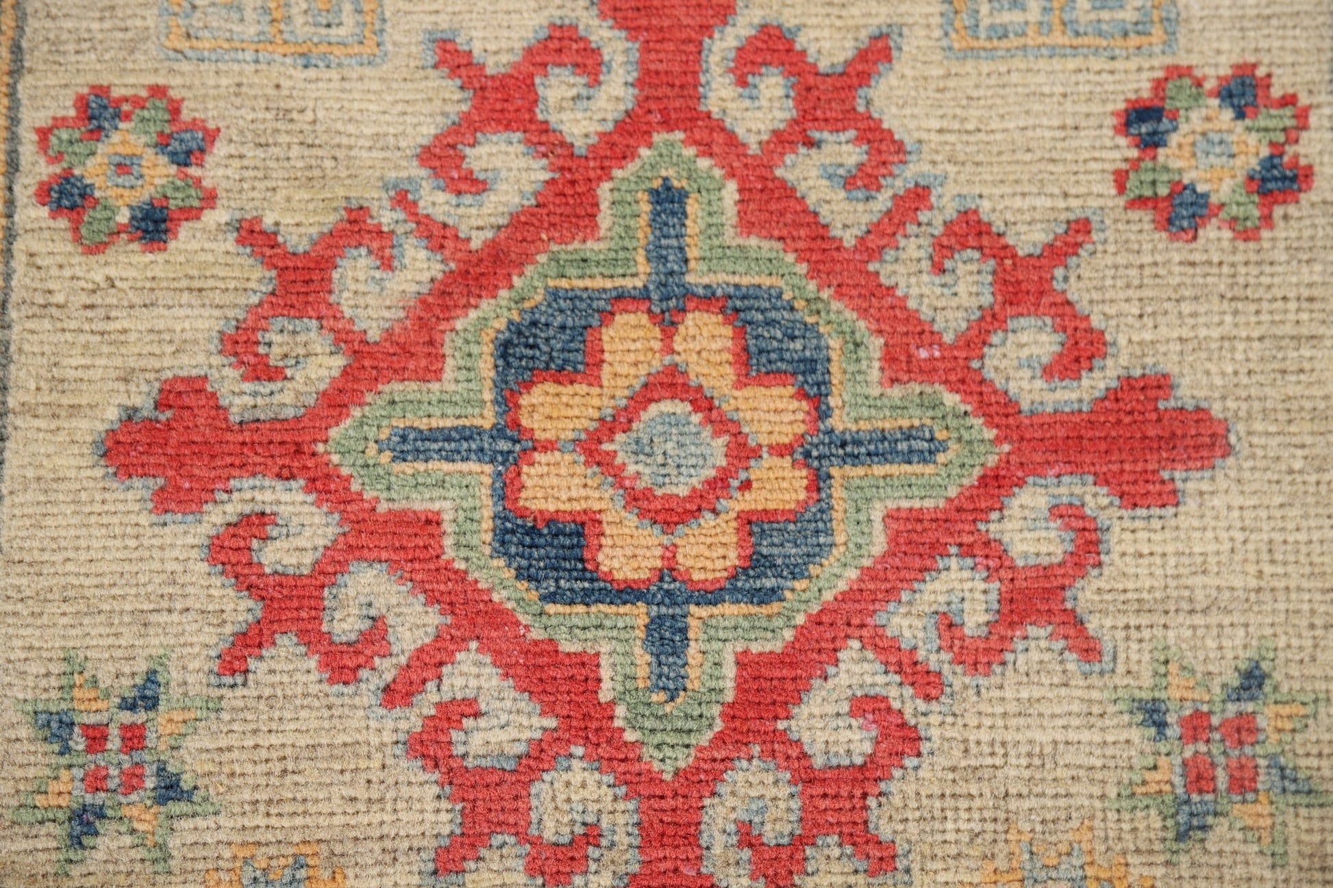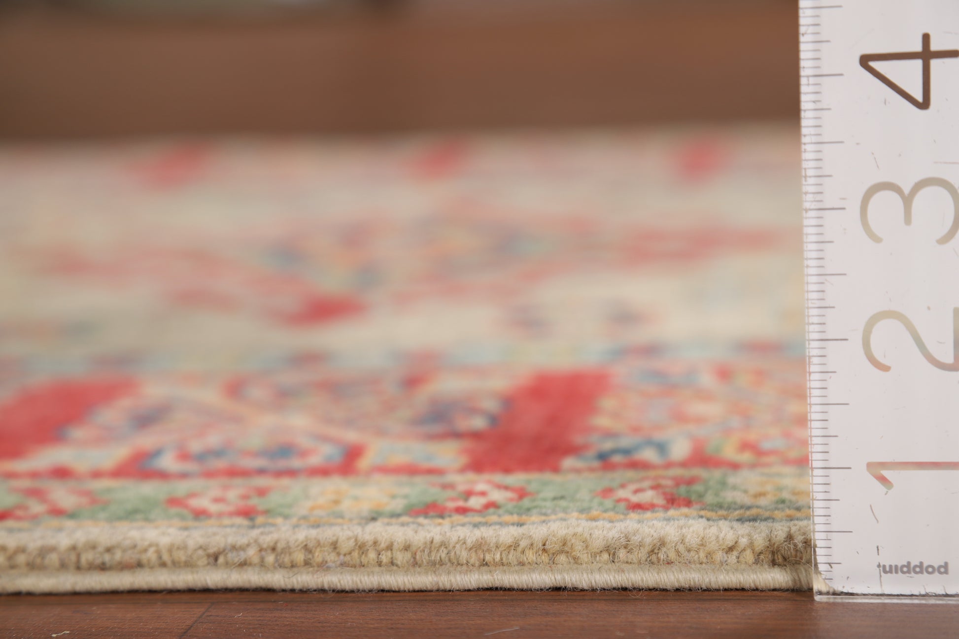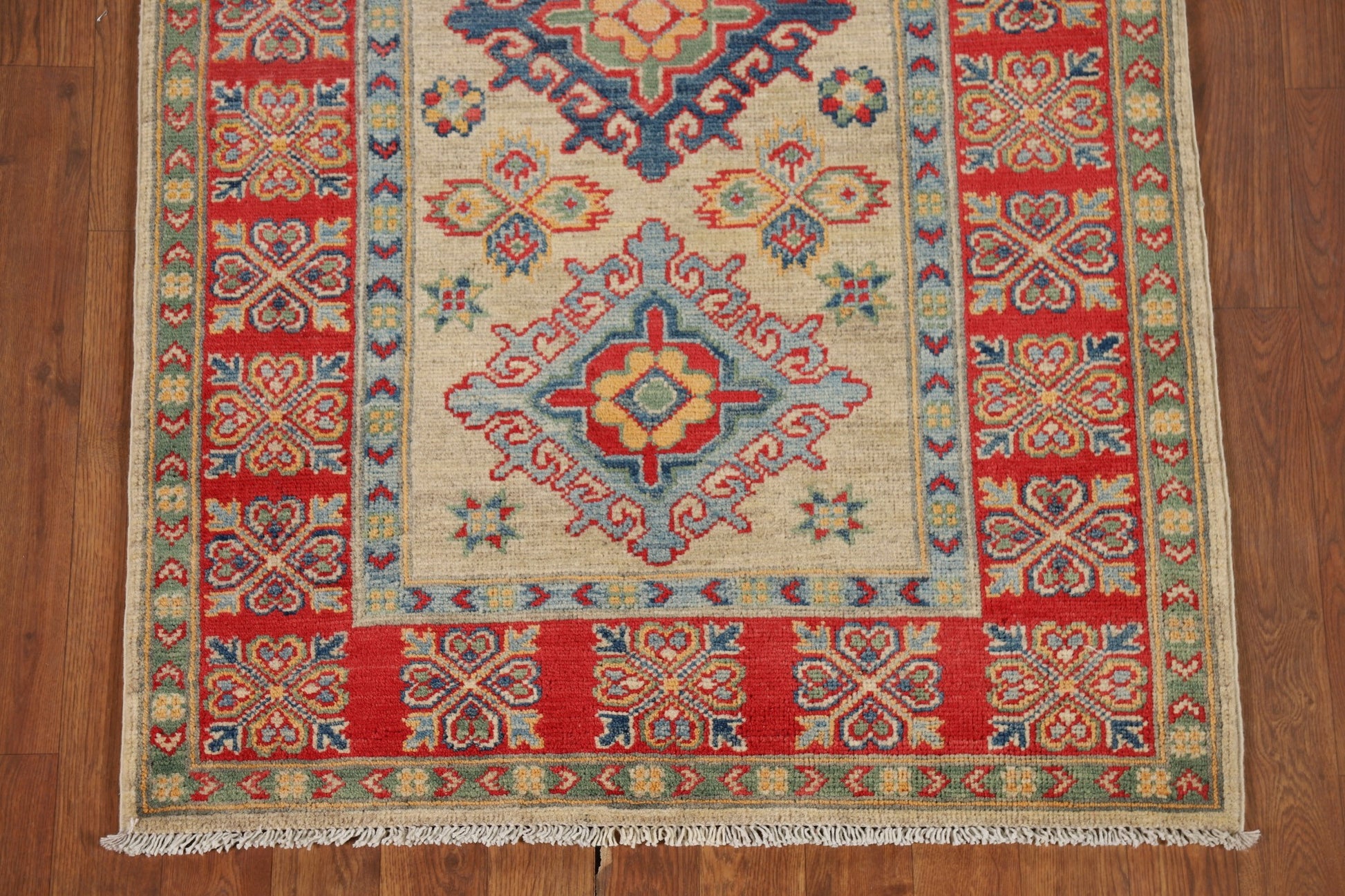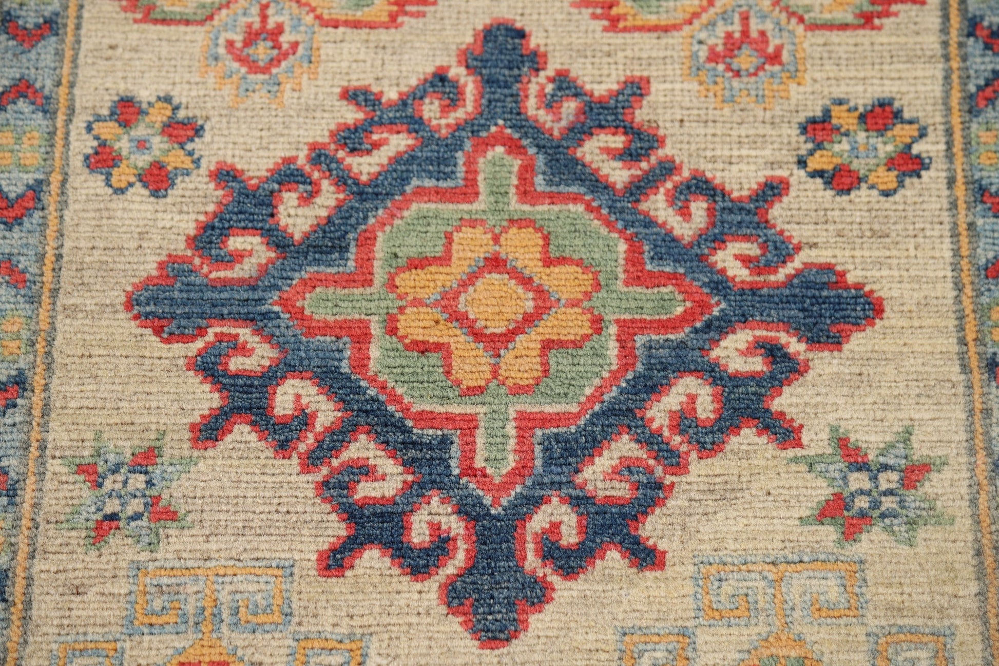 A Beautiful Genuine Pakistan Kazak rug is Hand Knotted by skillful weavers in Pakistan with 100% Wool Material. This rug is in New, First Quality condition. dimensions are 9' 7'' X 2' 10'' in foot and 292 X 86 in centimeter. the primary color is Beige & Ivories.