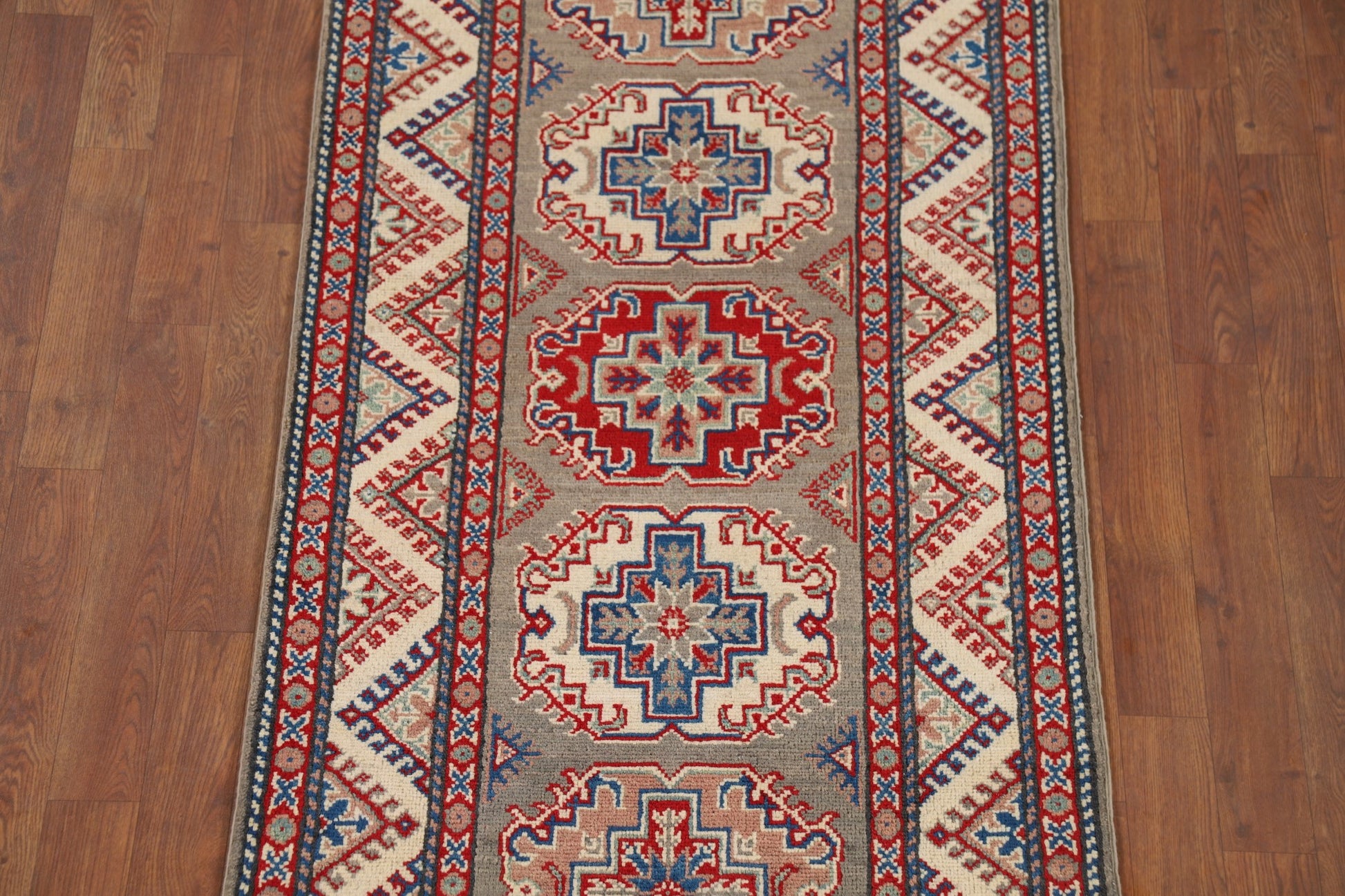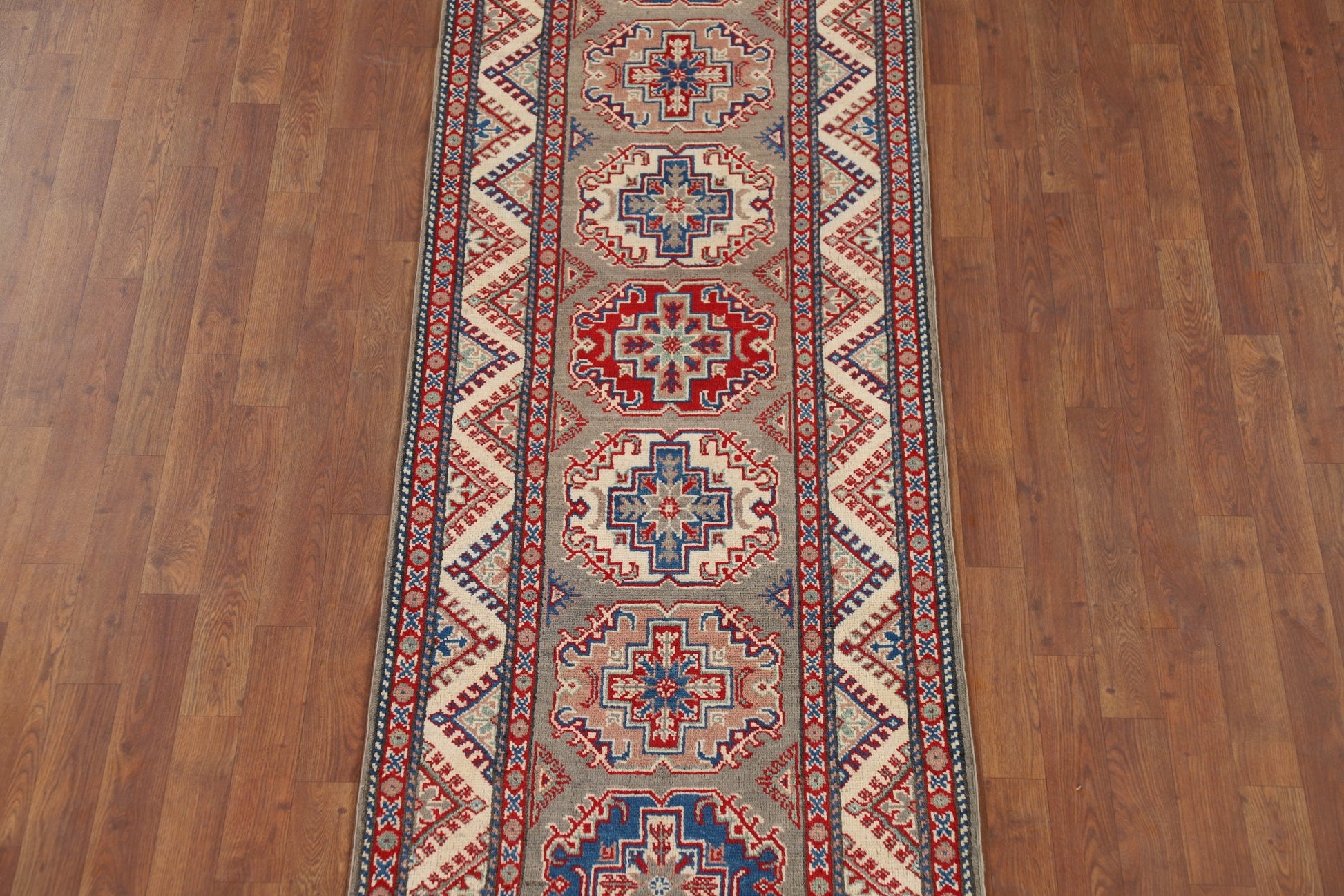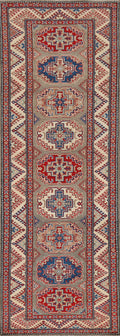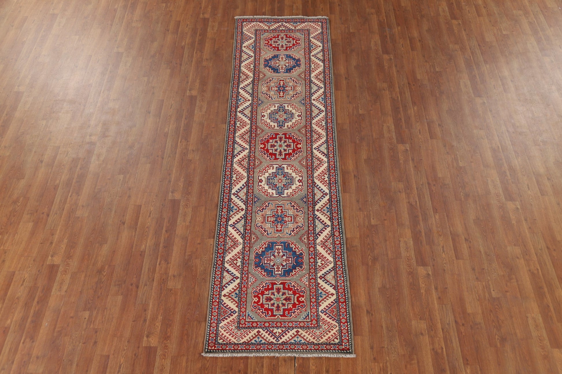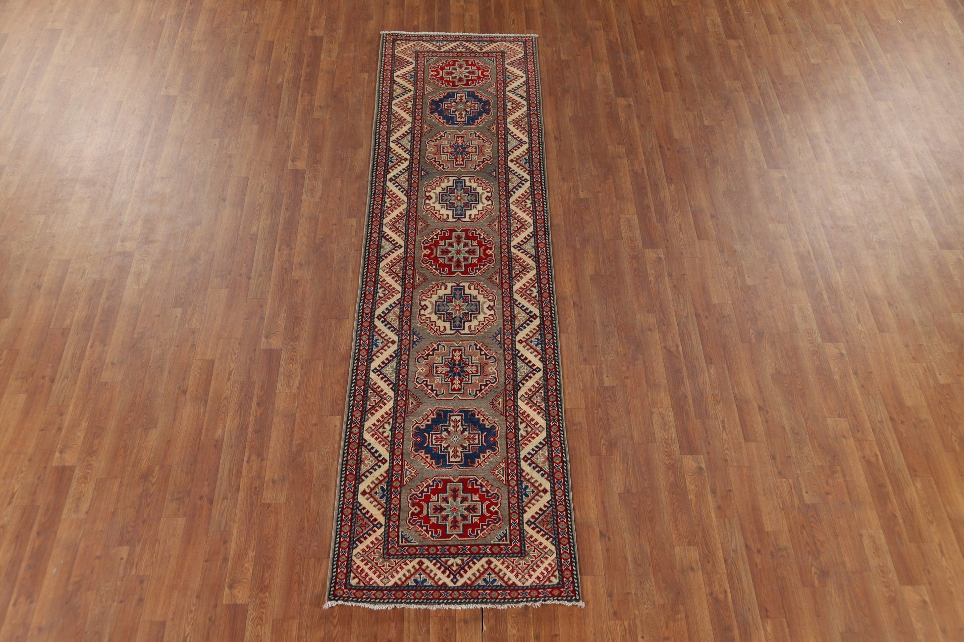 A Beautiful Genuine Pakistan Kazak rug is Hand Knotted by skillful weavers in Pakistan with 100% Wool Material. This rug is in New, First Quality condition. dimensions are 9' 11'' X 2' 8'' in foot and 302 X 81 in centimeter. the primary color is Brown.