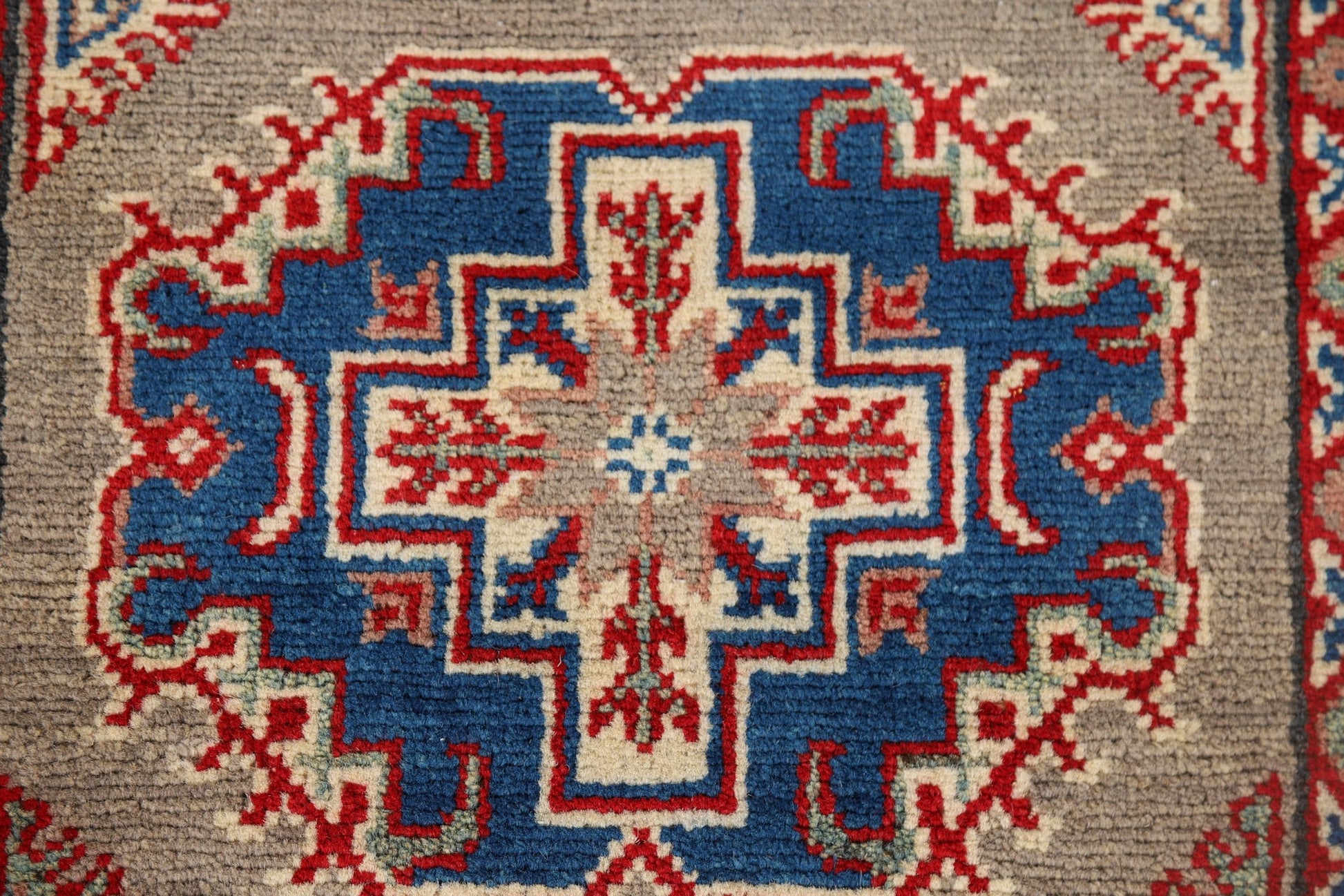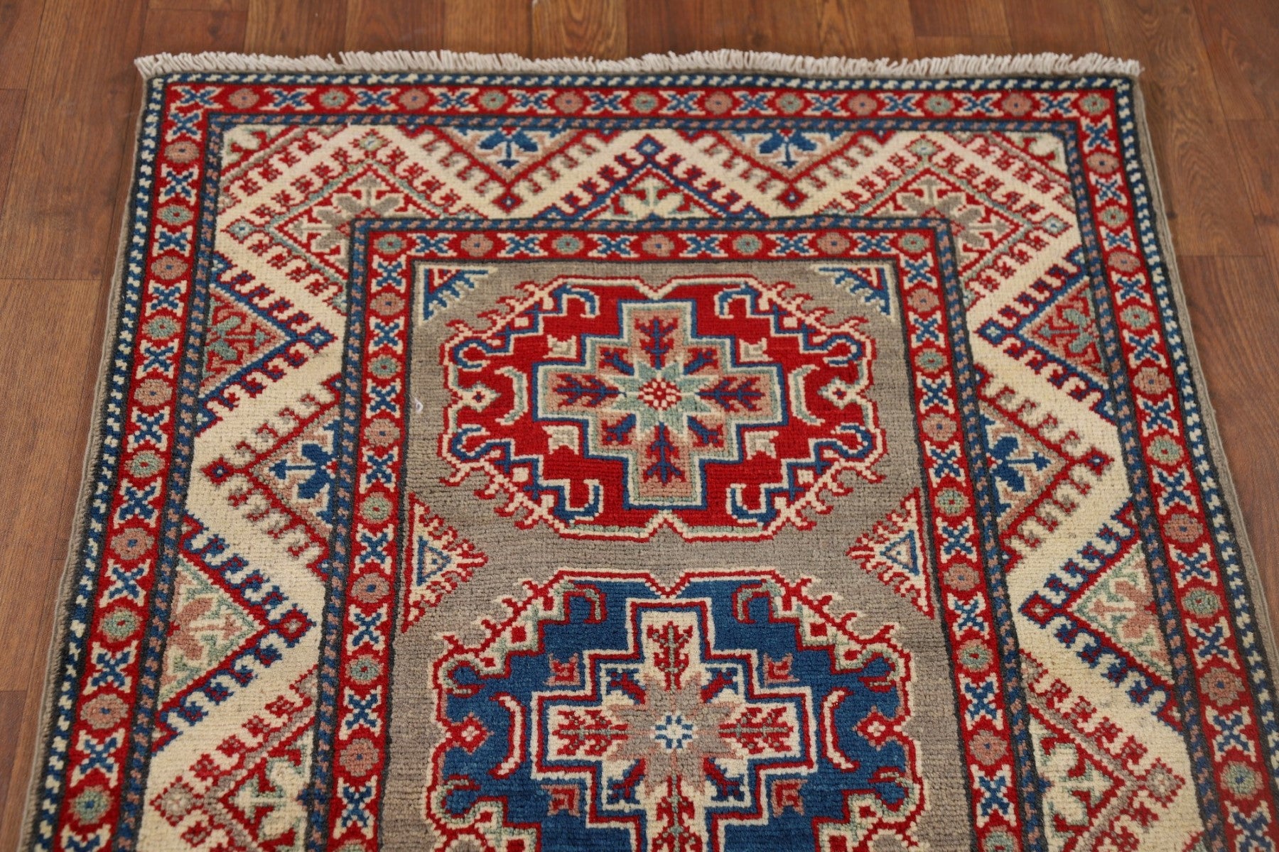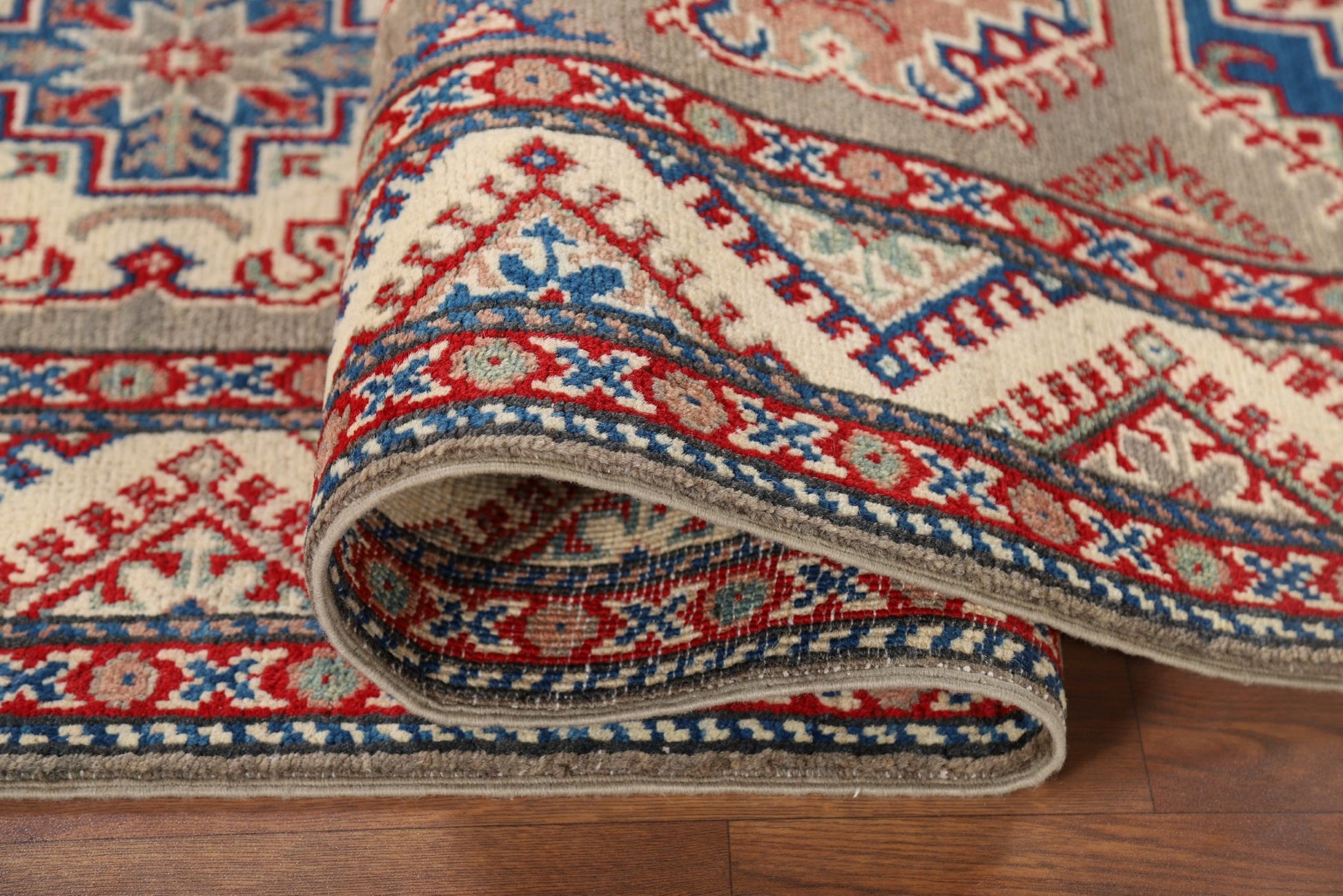 A Beautiful Genuine Pakistan Kazak rug is Hand Knotted by skillful weavers in Pakistan with 100% Wool Material. This rug is in New, First Quality condition. dimensions are 9' 11'' X 2' 8'' in foot and 302 X 81 in centimeter. the primary color is Brown.