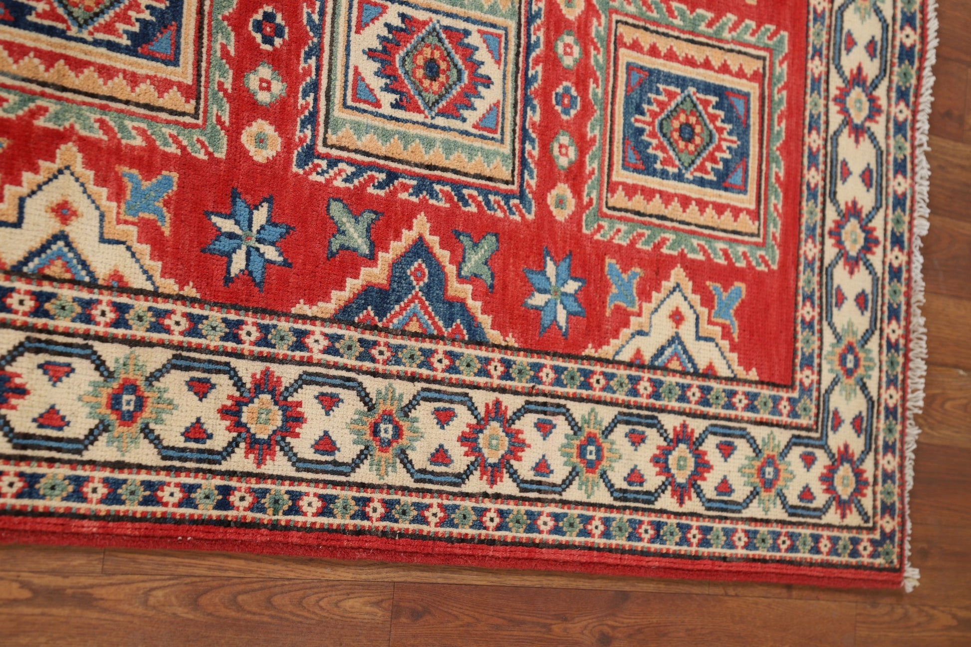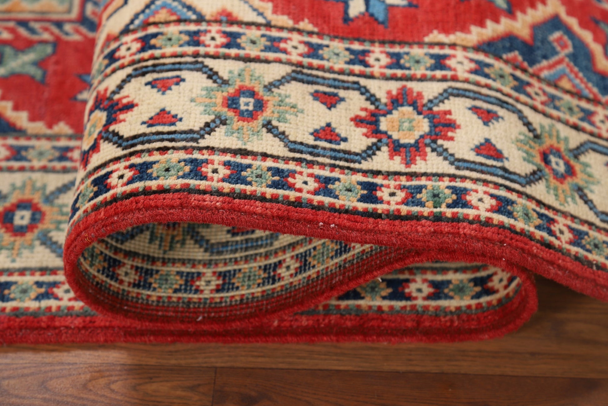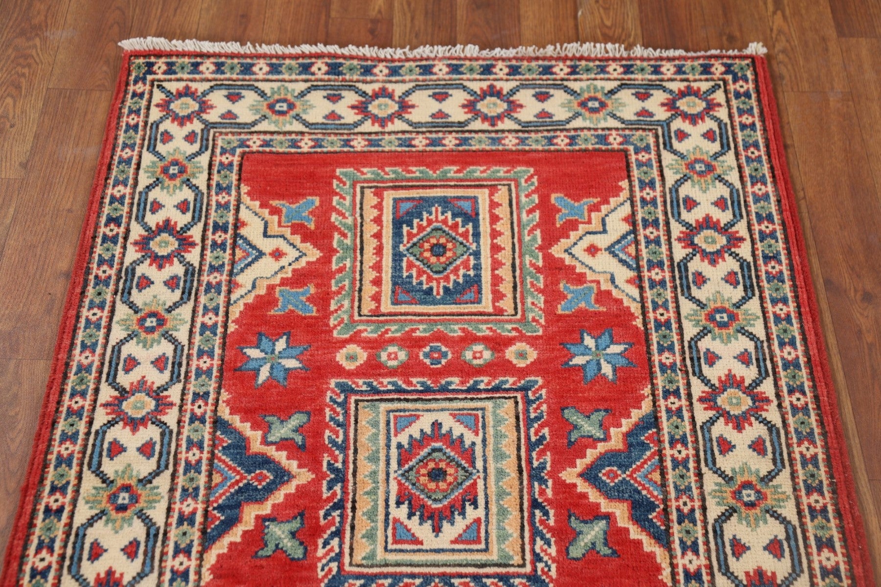 A Beautiful Genuine Pakistan Kazak rug is Hand Knotted by skillful weavers in Pakistan with 100% Wool Material. This rug is in New, First Quality condition. dimensions are 10' 1'' X 2' 8'' in foot and 307 X 81 in centimeter. the primary color is Red.