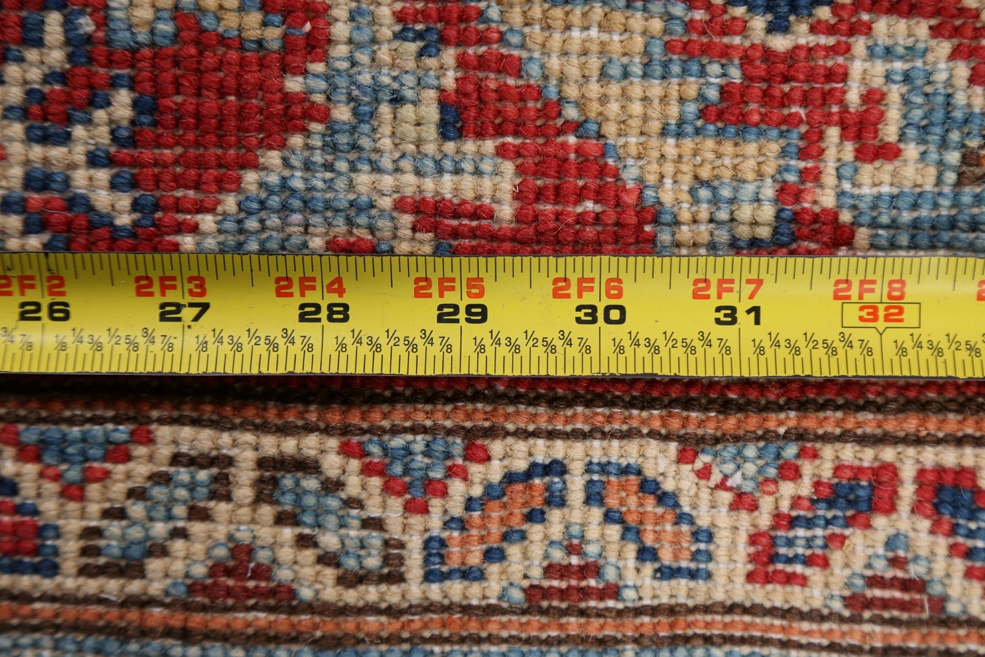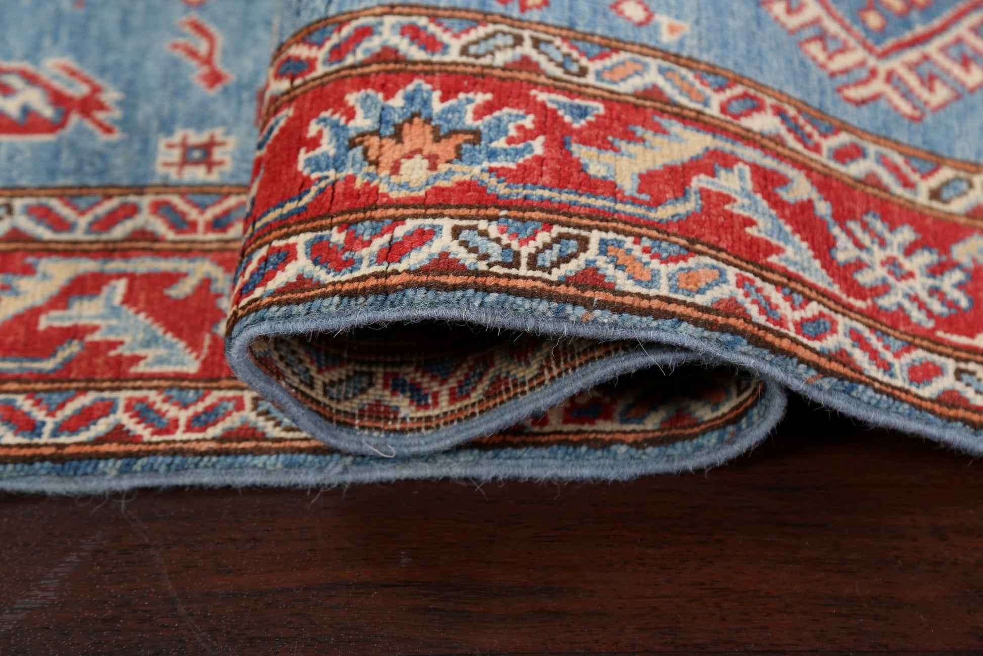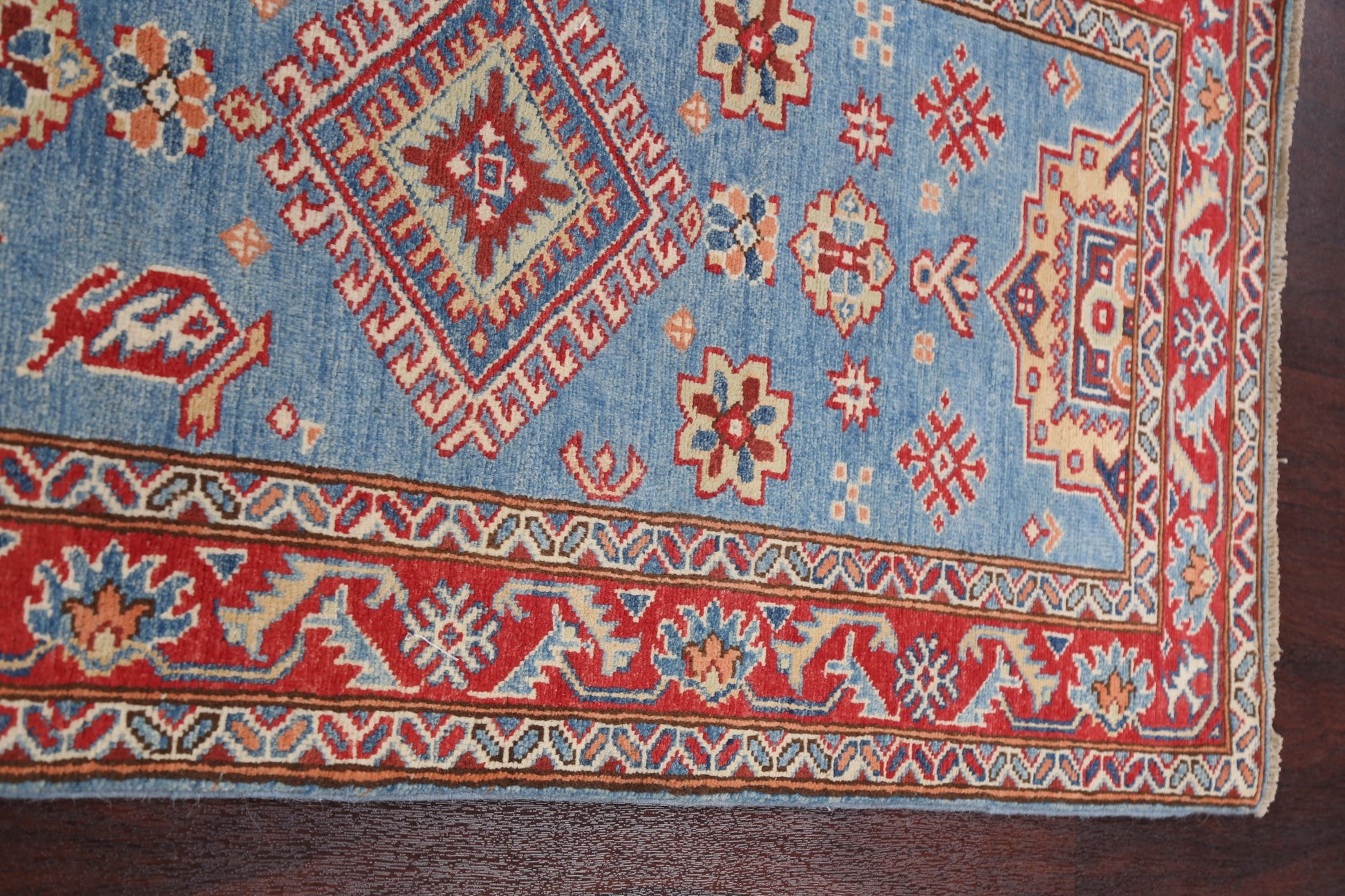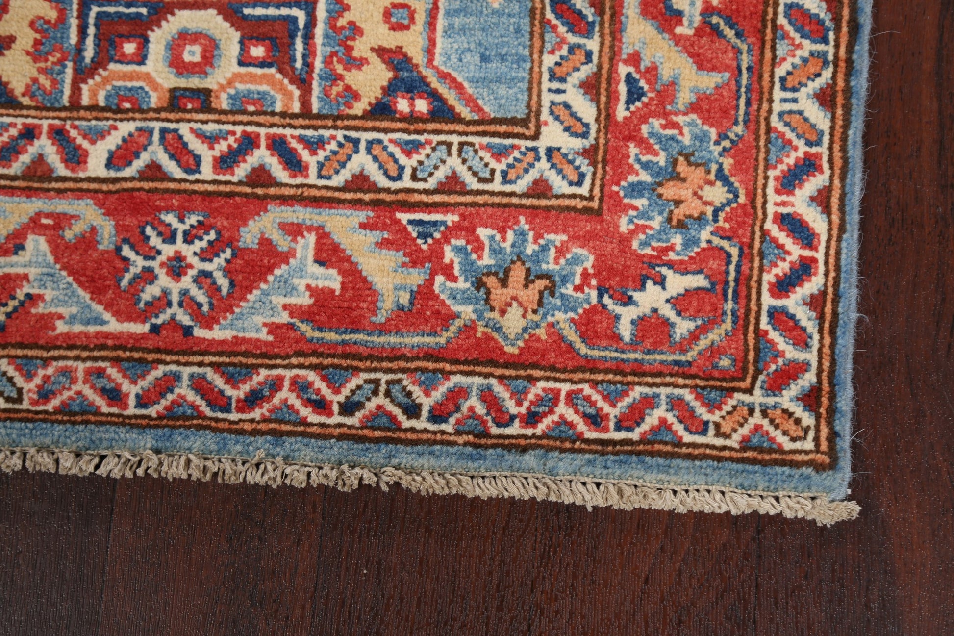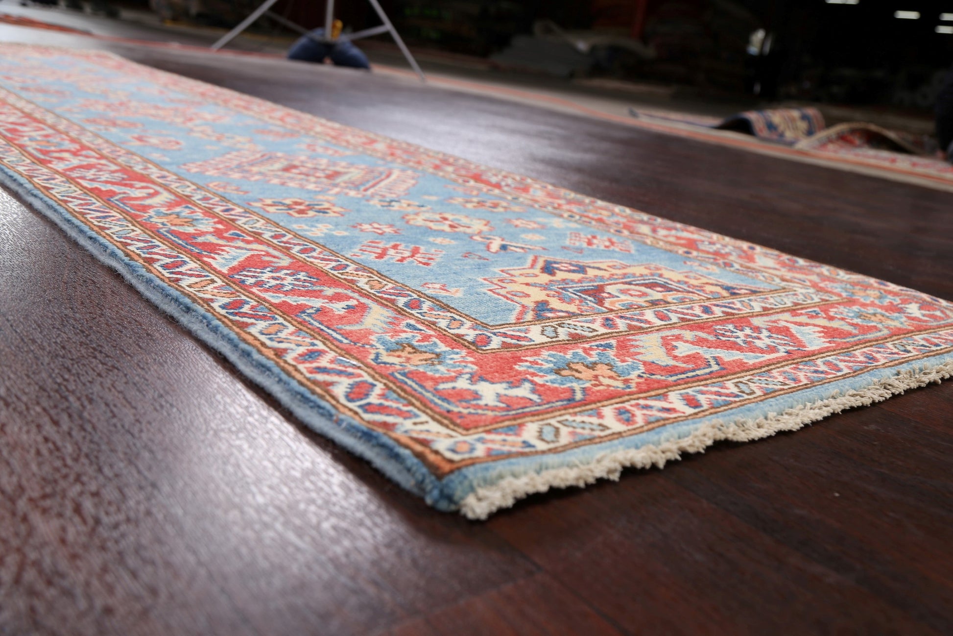 A Beautiful Genuine Pakistan Kazak rug is Hand Knotted by skillful weavers in Pakistan with 100% Wool Material. This rug is in New, First Quality condition. dimensions are 9' 6'' X 2' 8'' in foot and 290 X 81 in centimeter. the primary color is Navy Blue & Blues.