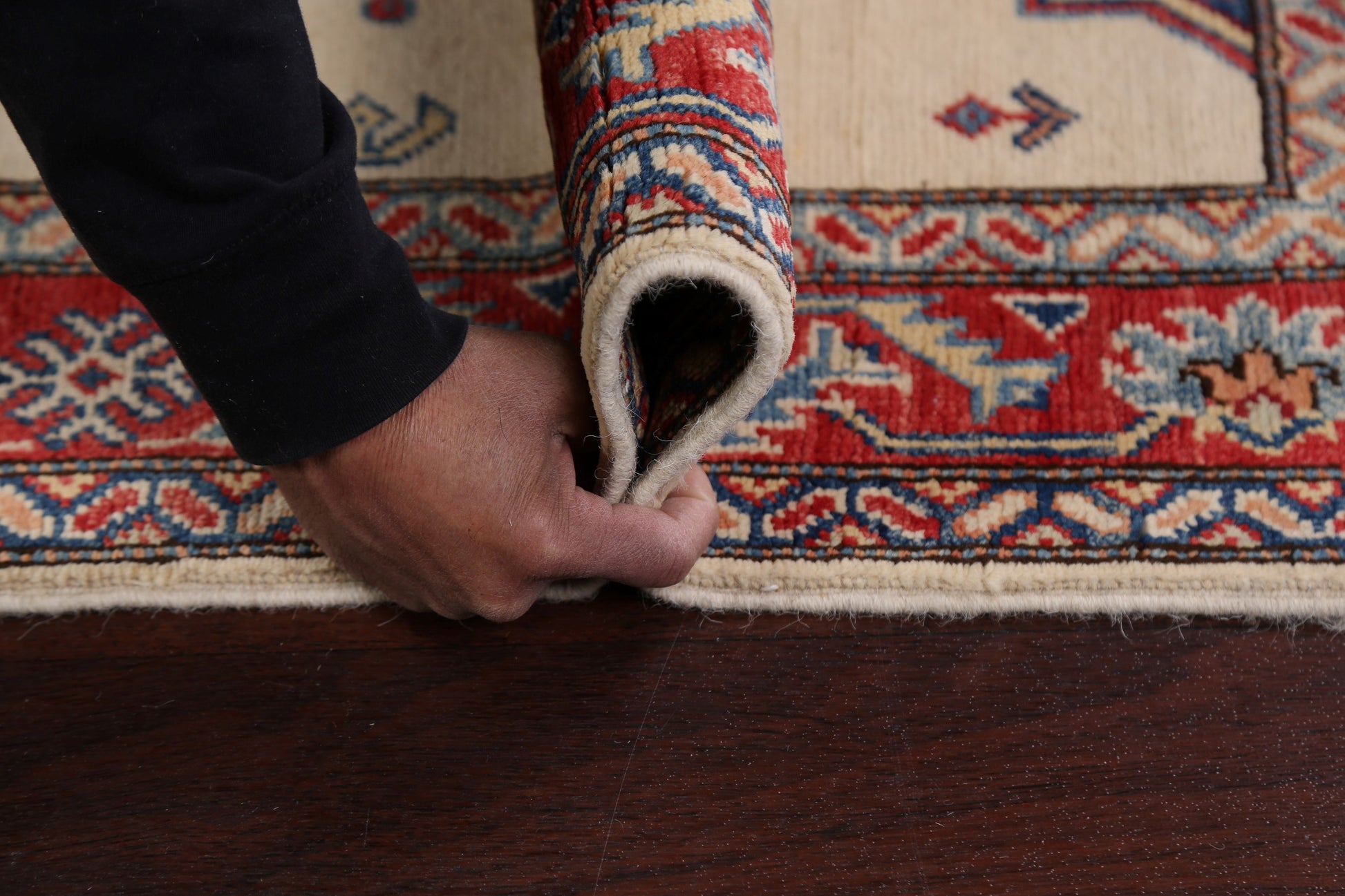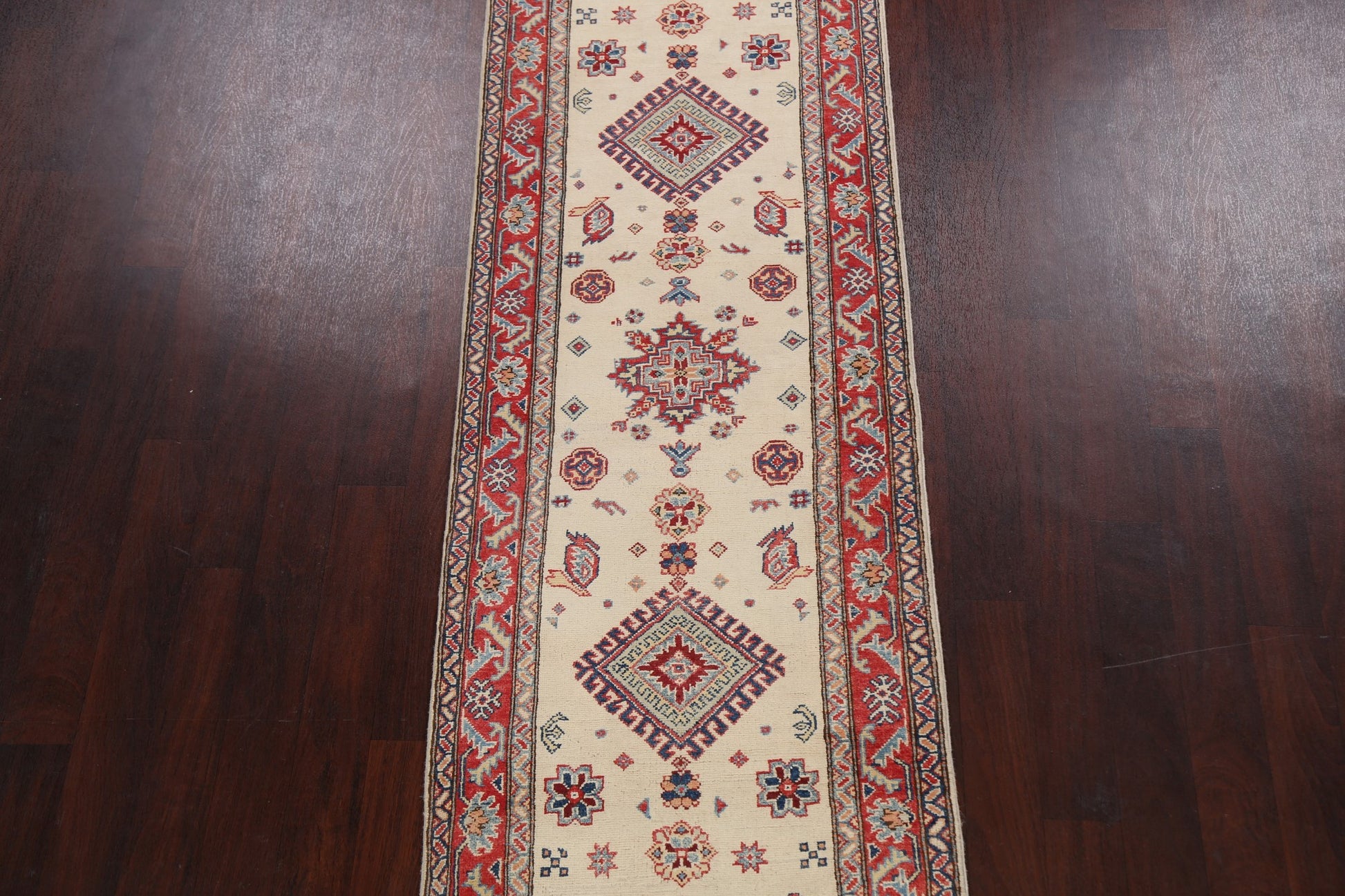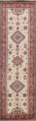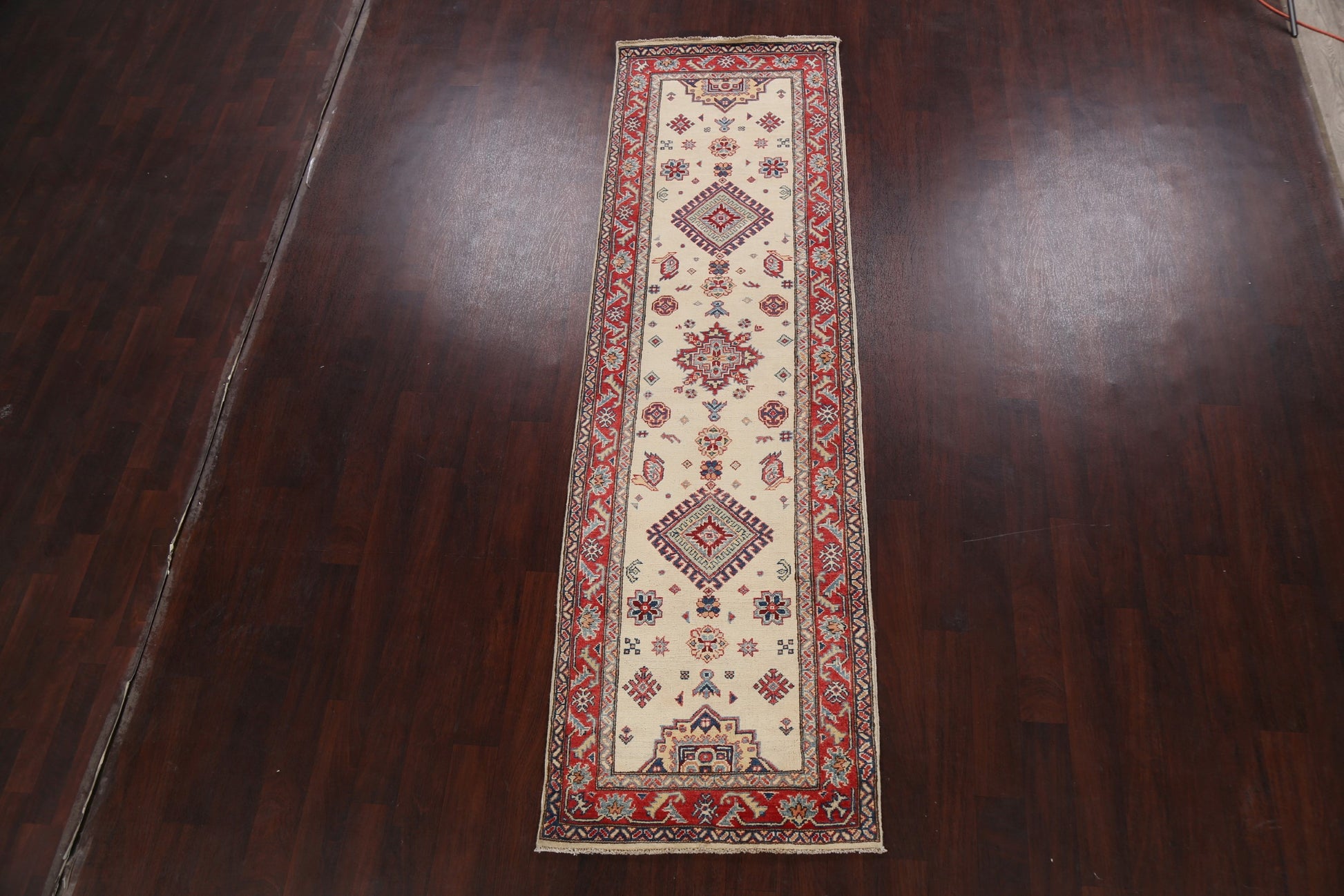 A Beautiful Genuine Pakistan Kazak rug is Hand Knotted by skillful weavers in Pakistan with 100% Wool Material. This rug is in New, First Quality condition. dimensions are 9' 8'' X 2' 10'' in foot and 295 X 86 in centimeter. the primary color is Beige & Ivories.