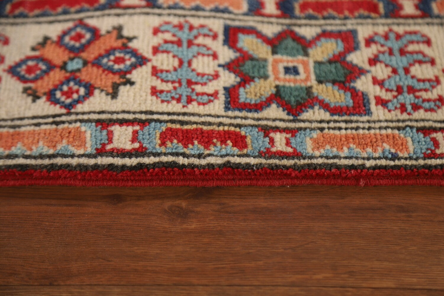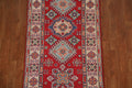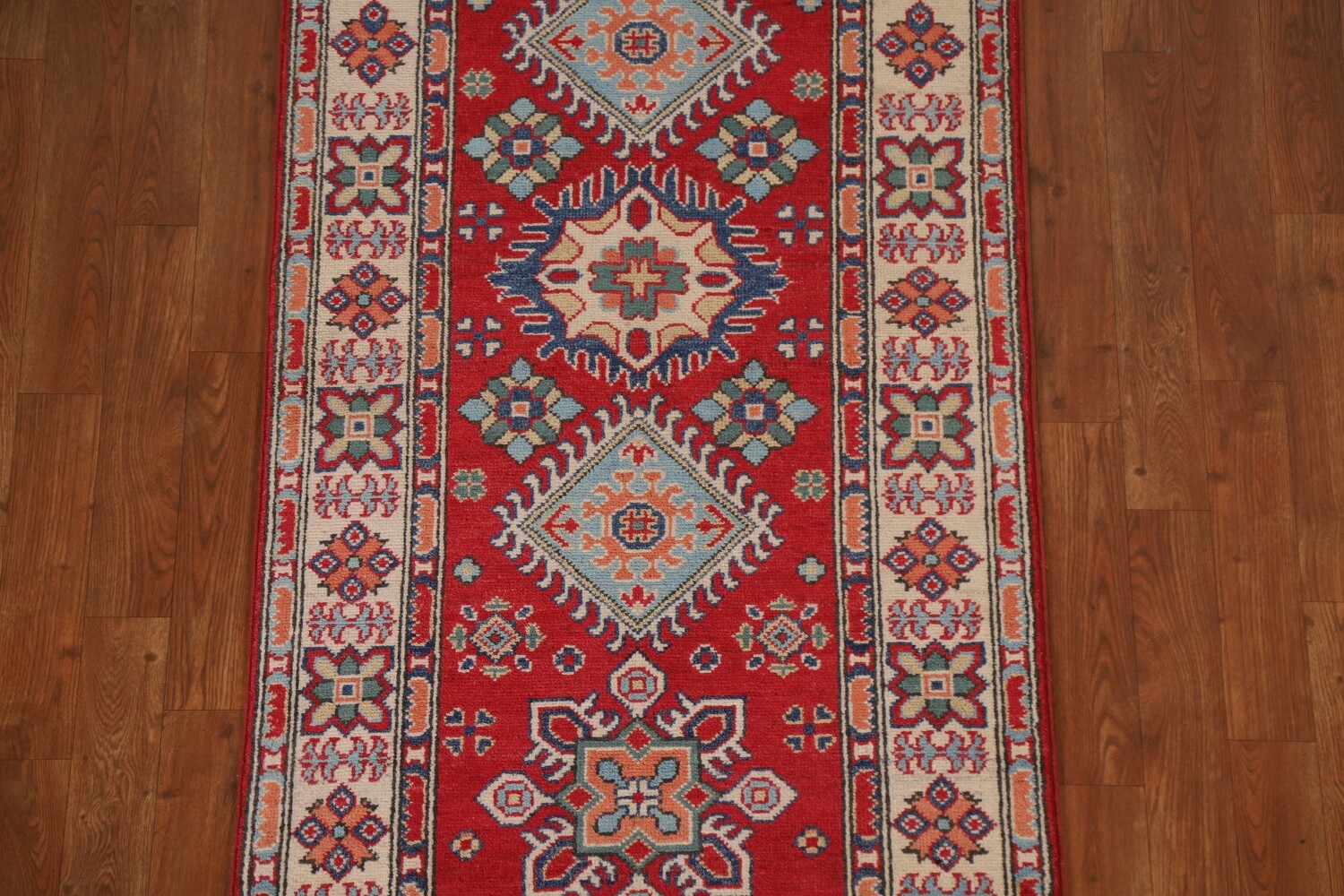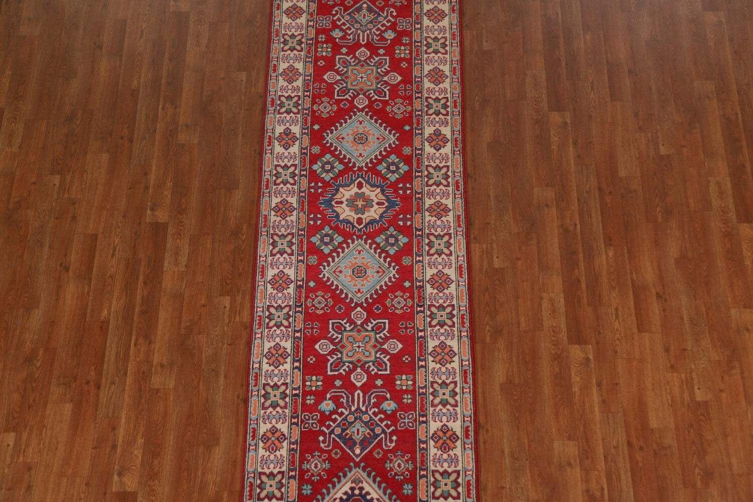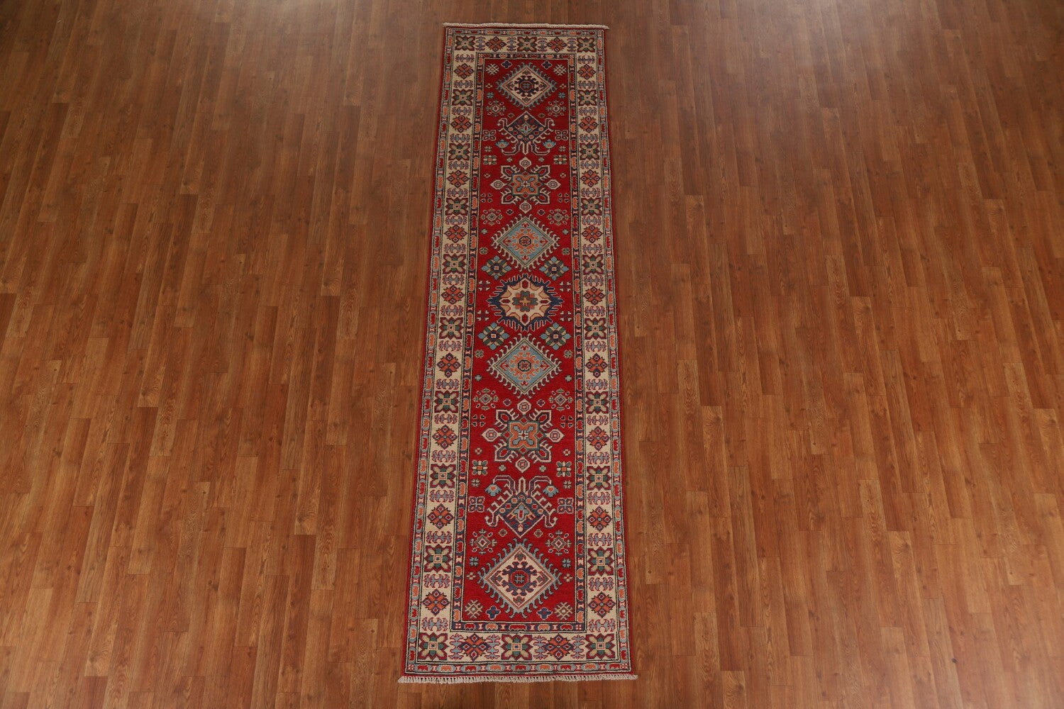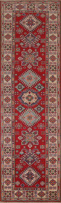 A Beautiful Genuine Pakistan Kazak rug is Hand Knotted by skillful weavers in Pakistan with 100% Wool Material. This rug is in New, First Quality condition. dimensions are 9' 9'' X 2' 7'' in foot and 297 X 79 in centimeter. the primary color is Red.