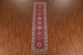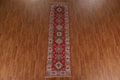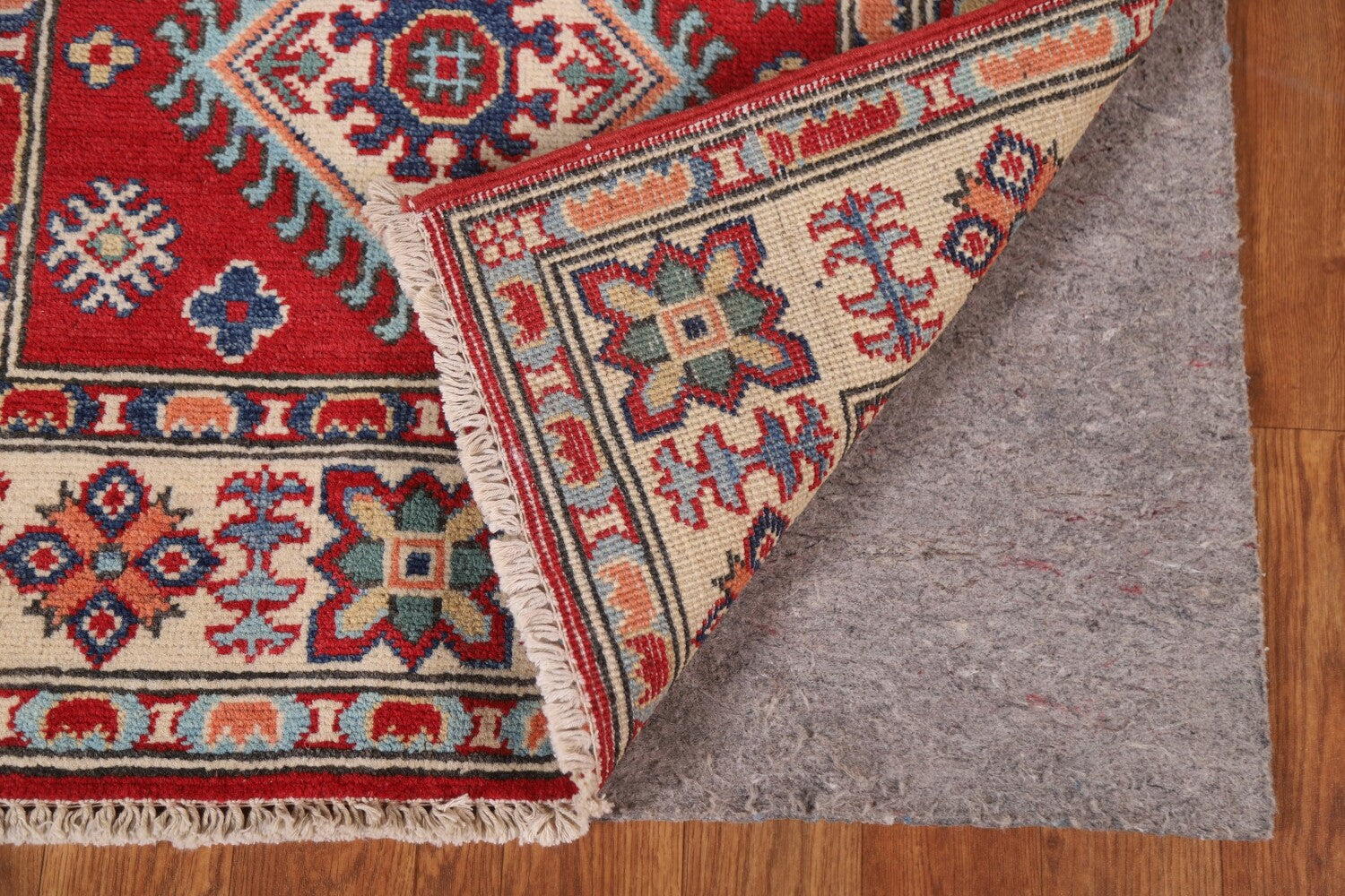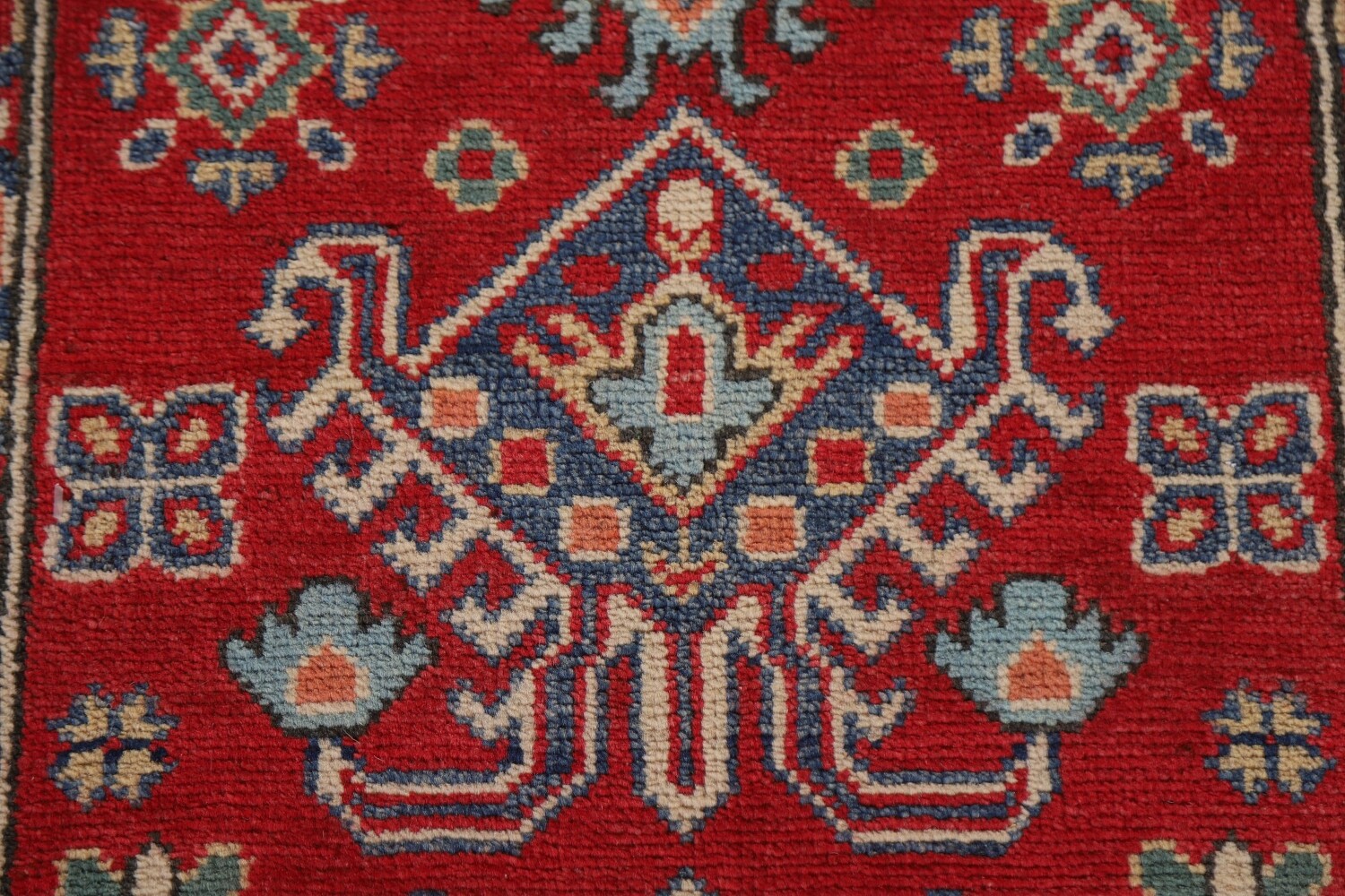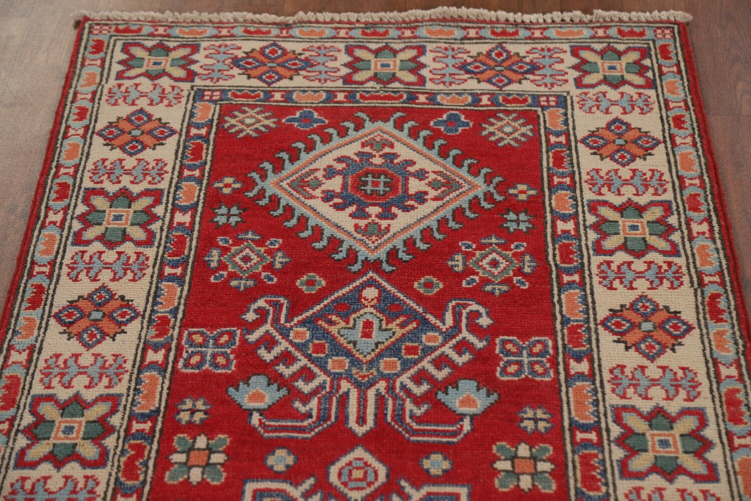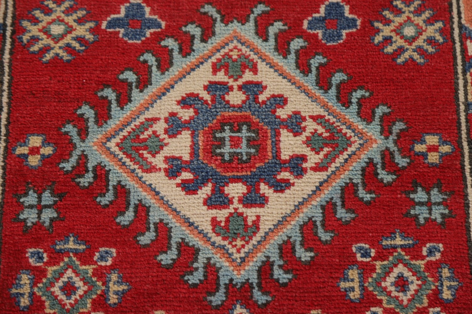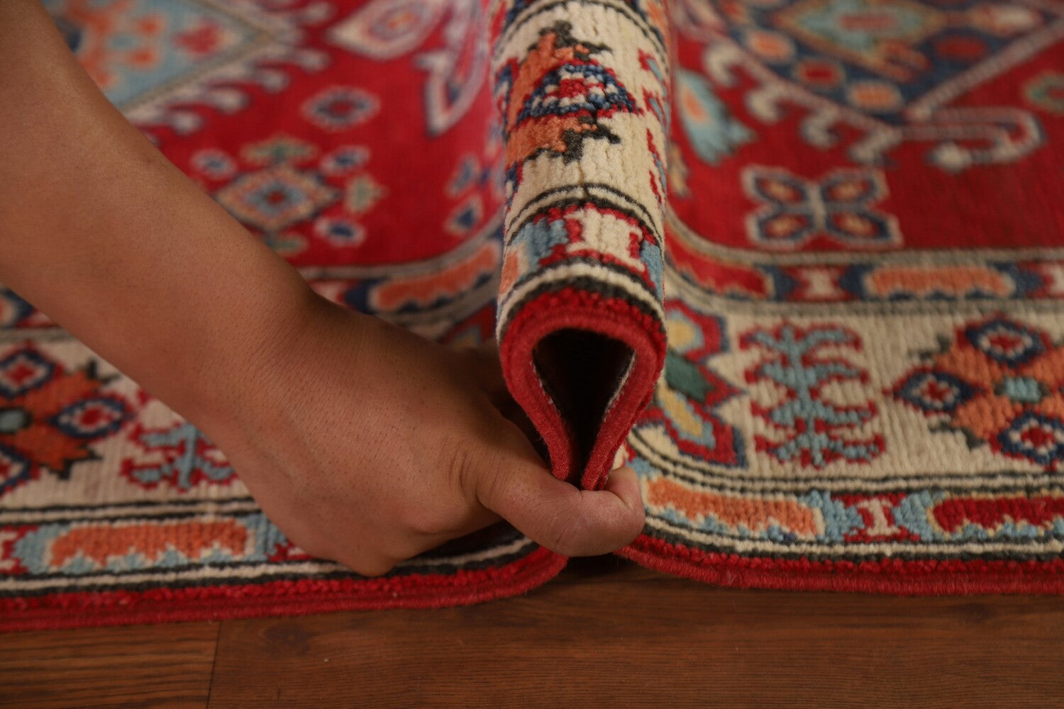 A Beautiful Genuine Pakistan Kazak rug is Hand Knotted by skillful weavers in Pakistan with 100% Wool Material. This rug is in New, First Quality condition. dimensions are 9' 9'' X 2' 7'' in foot and 297 X 79 in centimeter. the primary color is Red.
