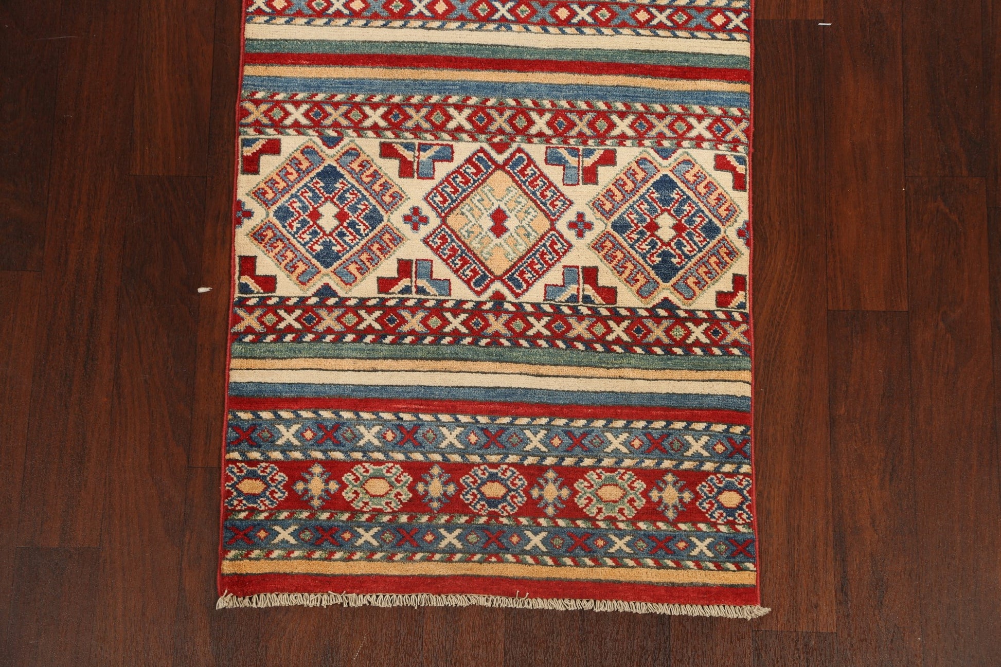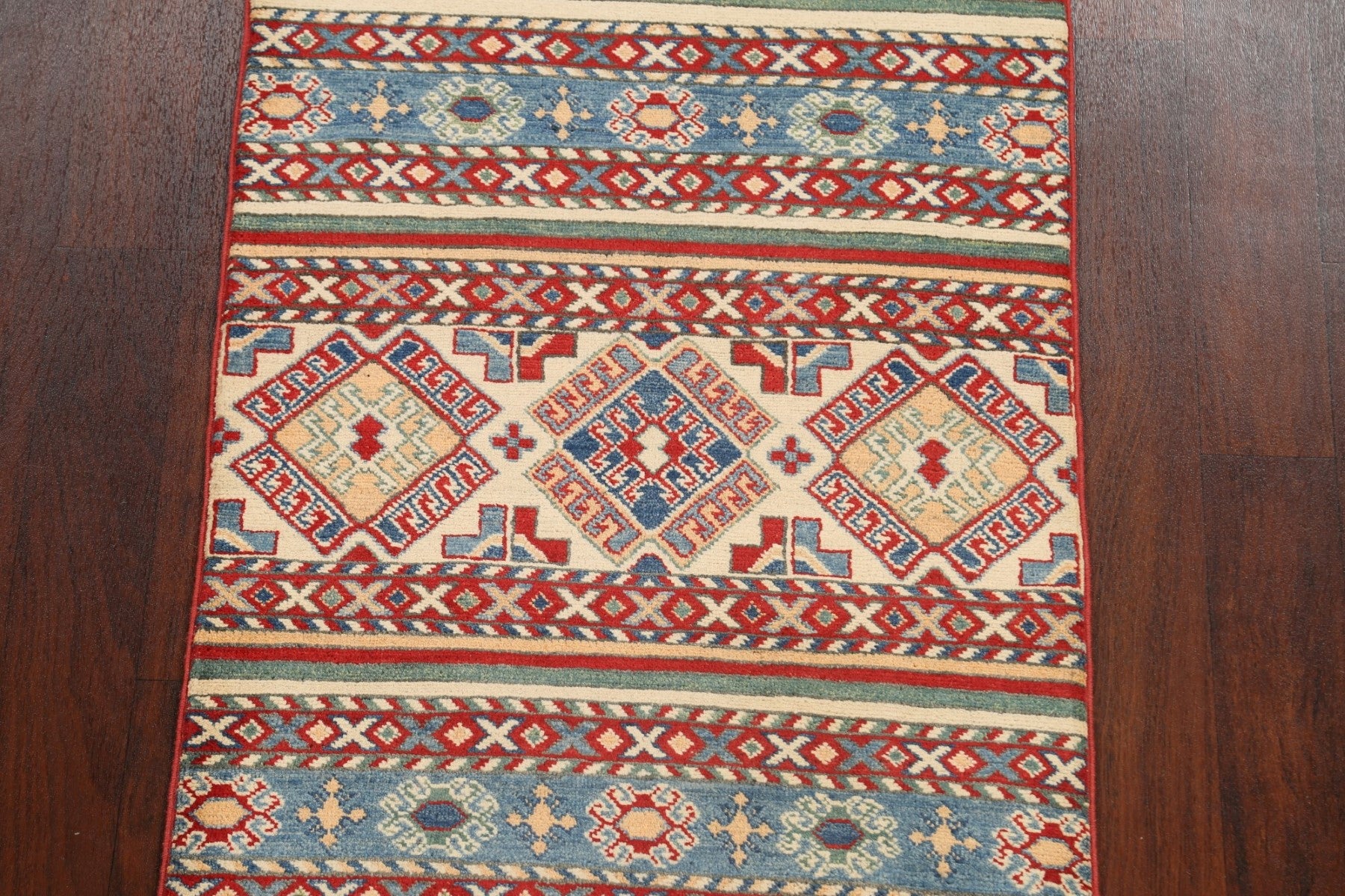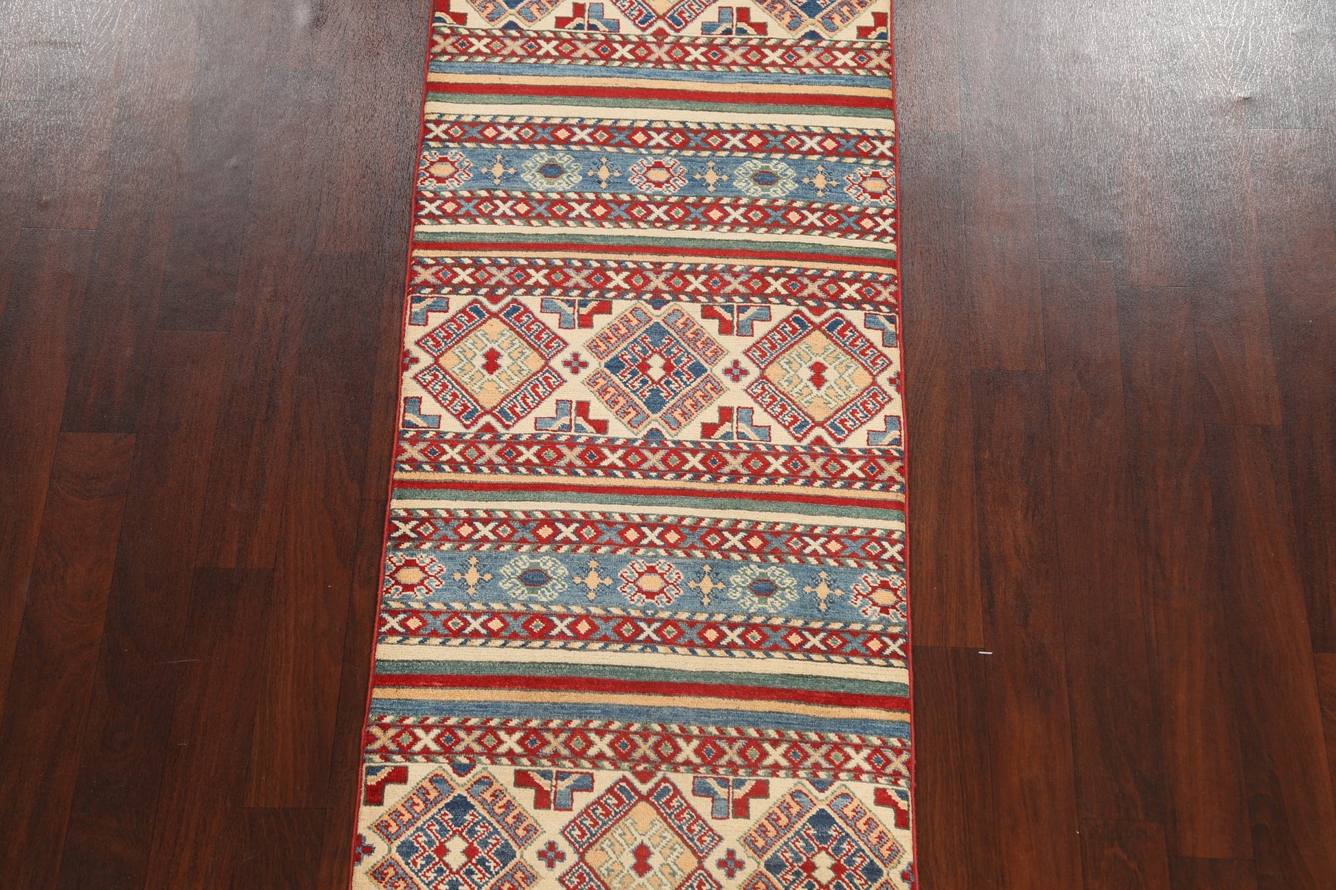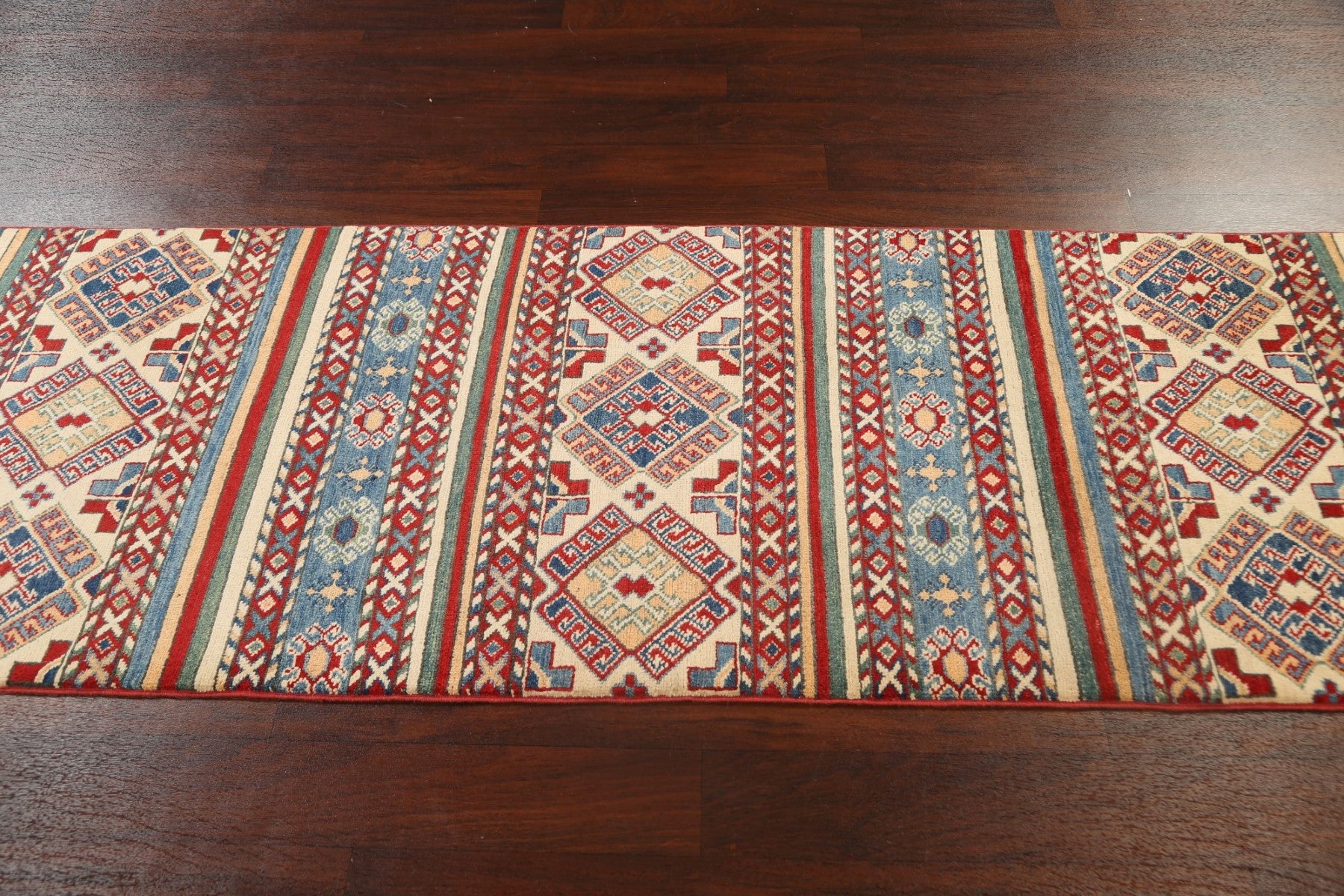 A Beautiful Genuine Pakistan Kazak rug is Hand Knotted by skillful weavers in Pakistan with 100% Wool Material. This rug is in New, First Quality condition. dimensions are 9' 7'' X 2' 9'' in foot and 292 X 84 in centimeter. the primary color is Multi-Colored.