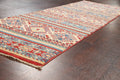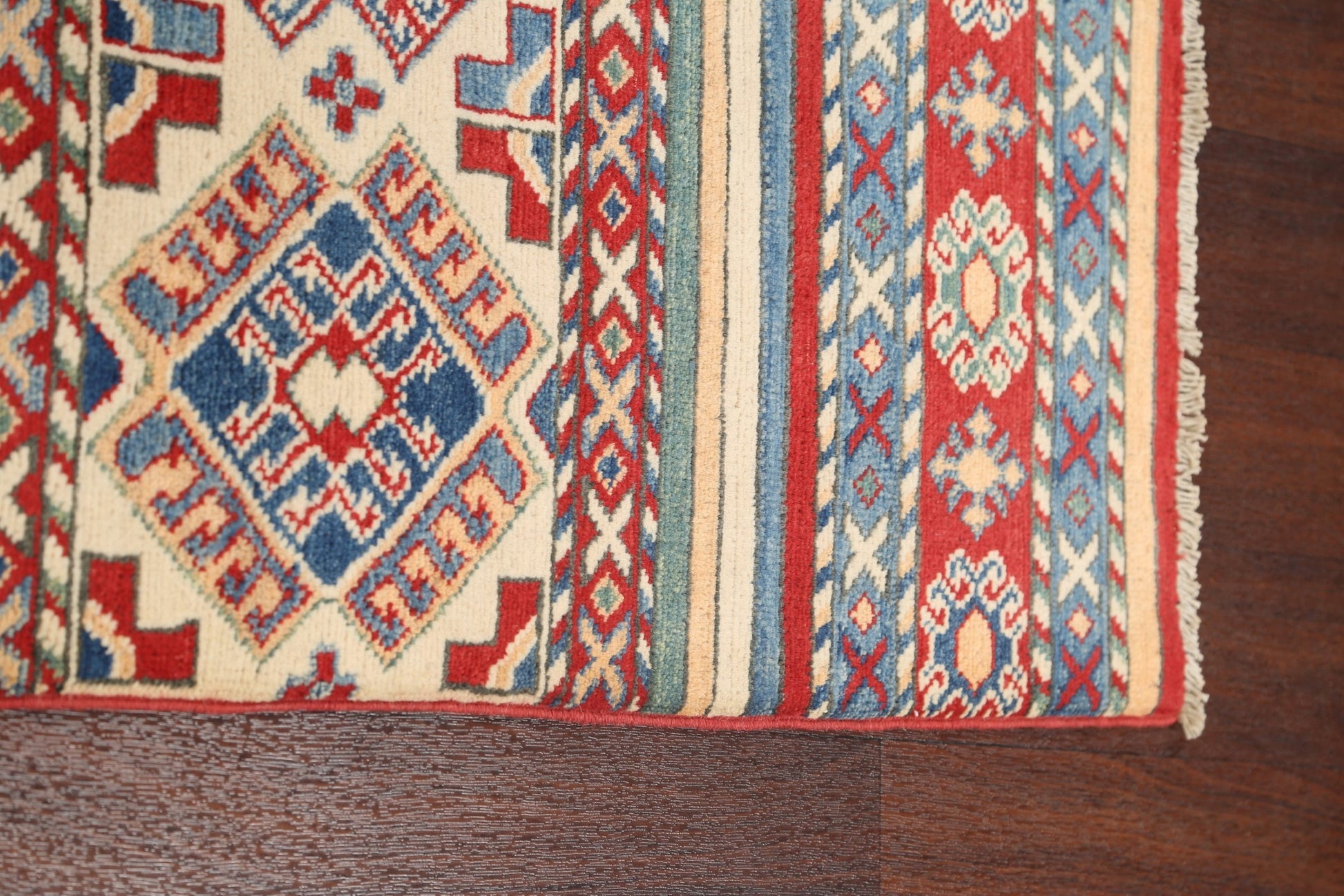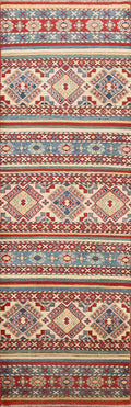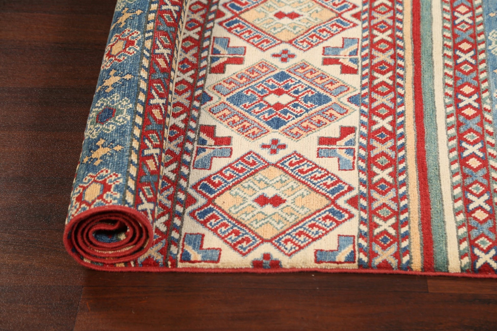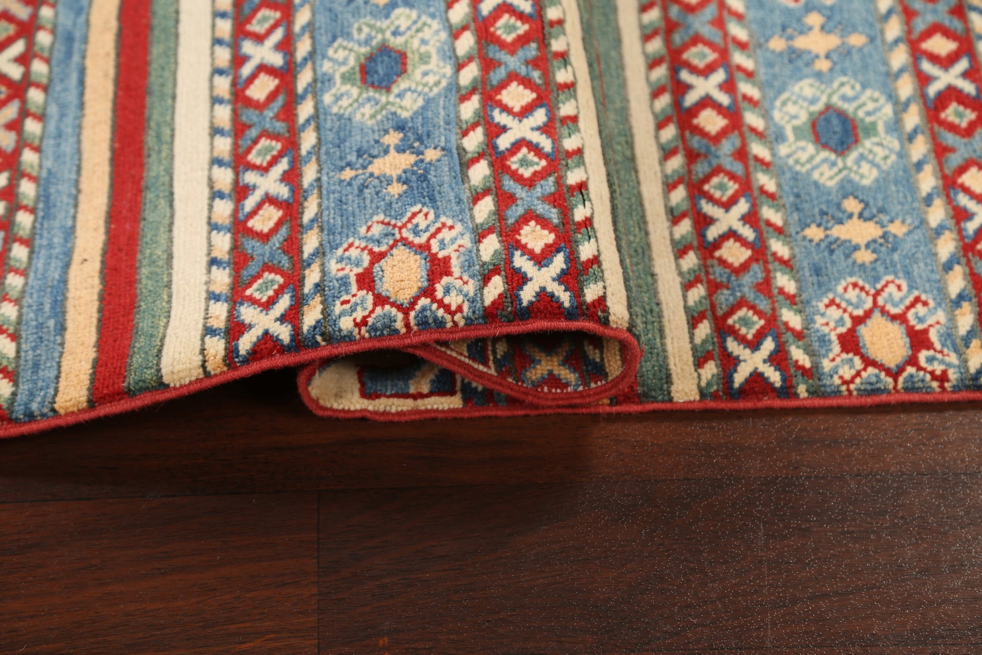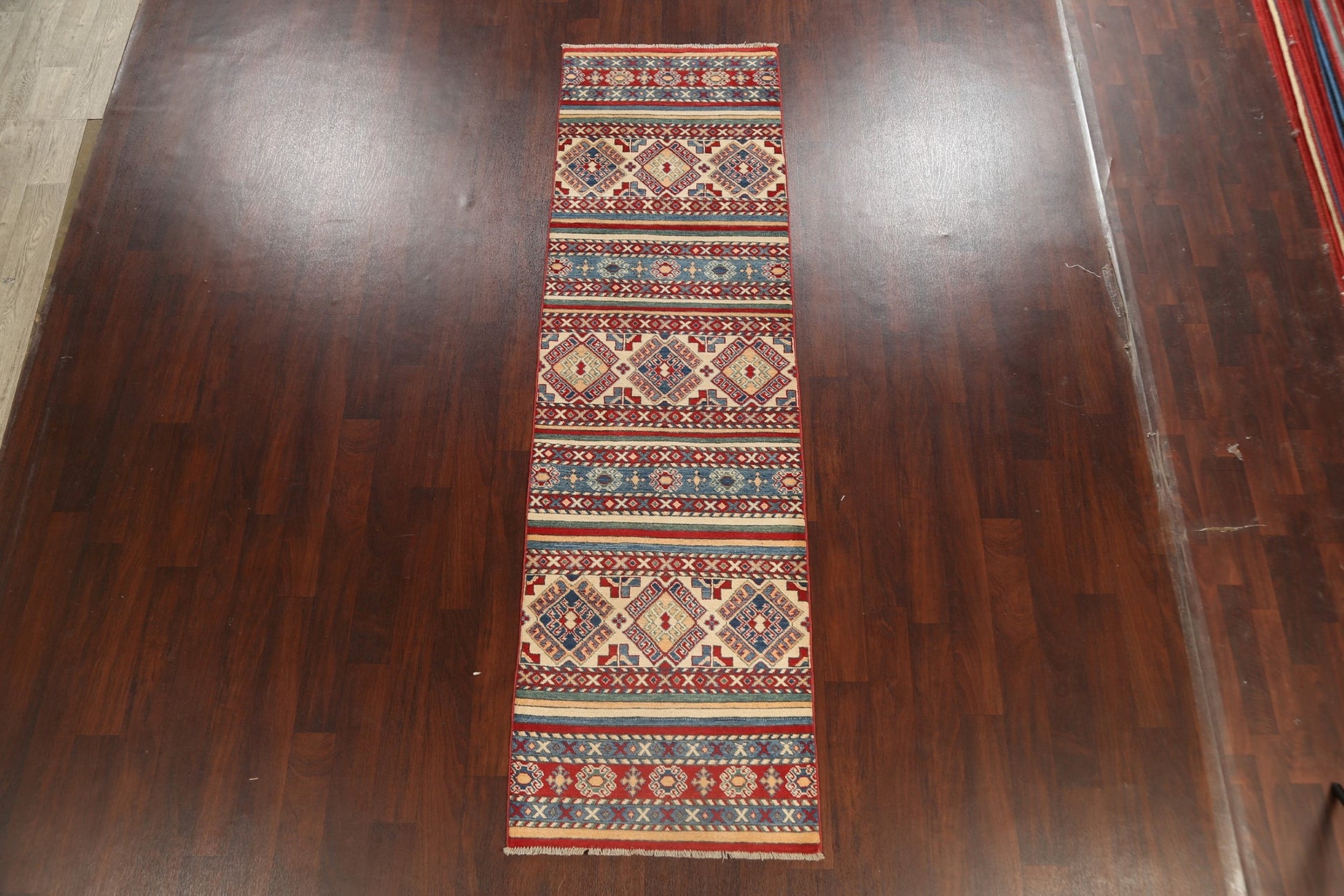 A Beautiful Genuine Pakistan Kazak rug is Hand Knotted by skillful weavers in Pakistan with 100% Wool Material. This rug is in New, First Quality condition. dimensions are 9' 7'' X 2' 9'' in foot and 292 X 84 in centimeter. the primary color is Multi-Colored.
