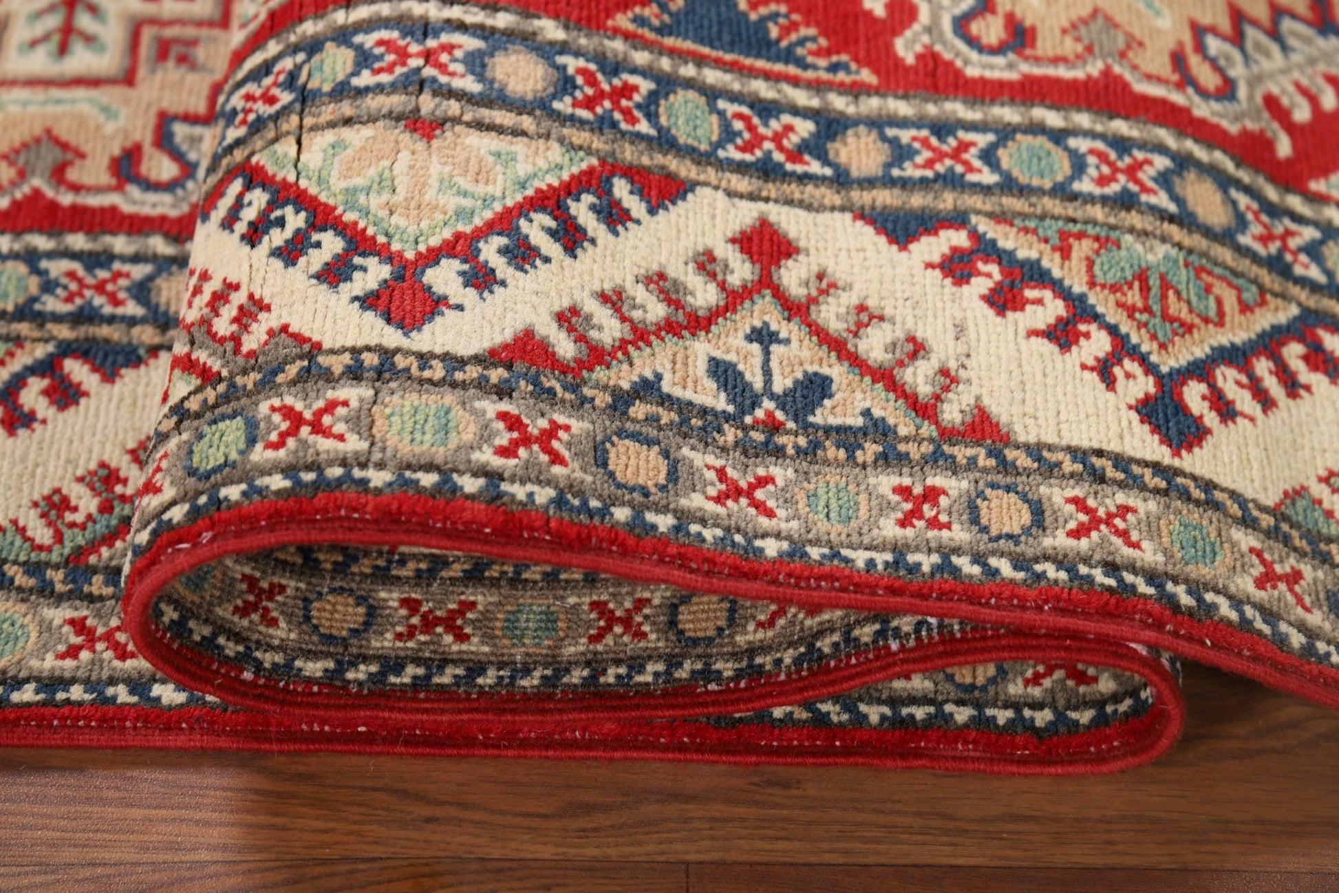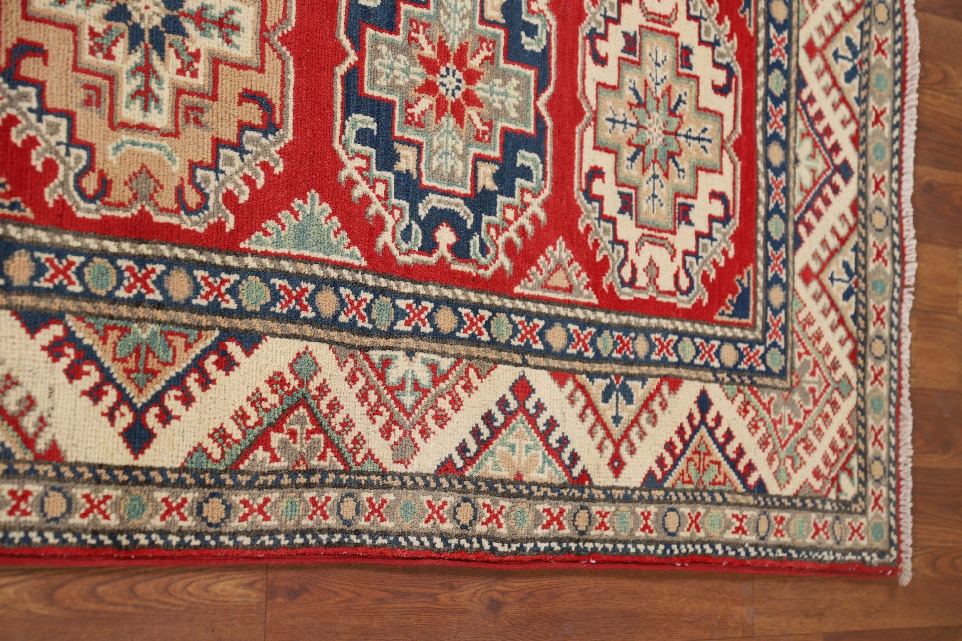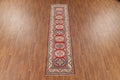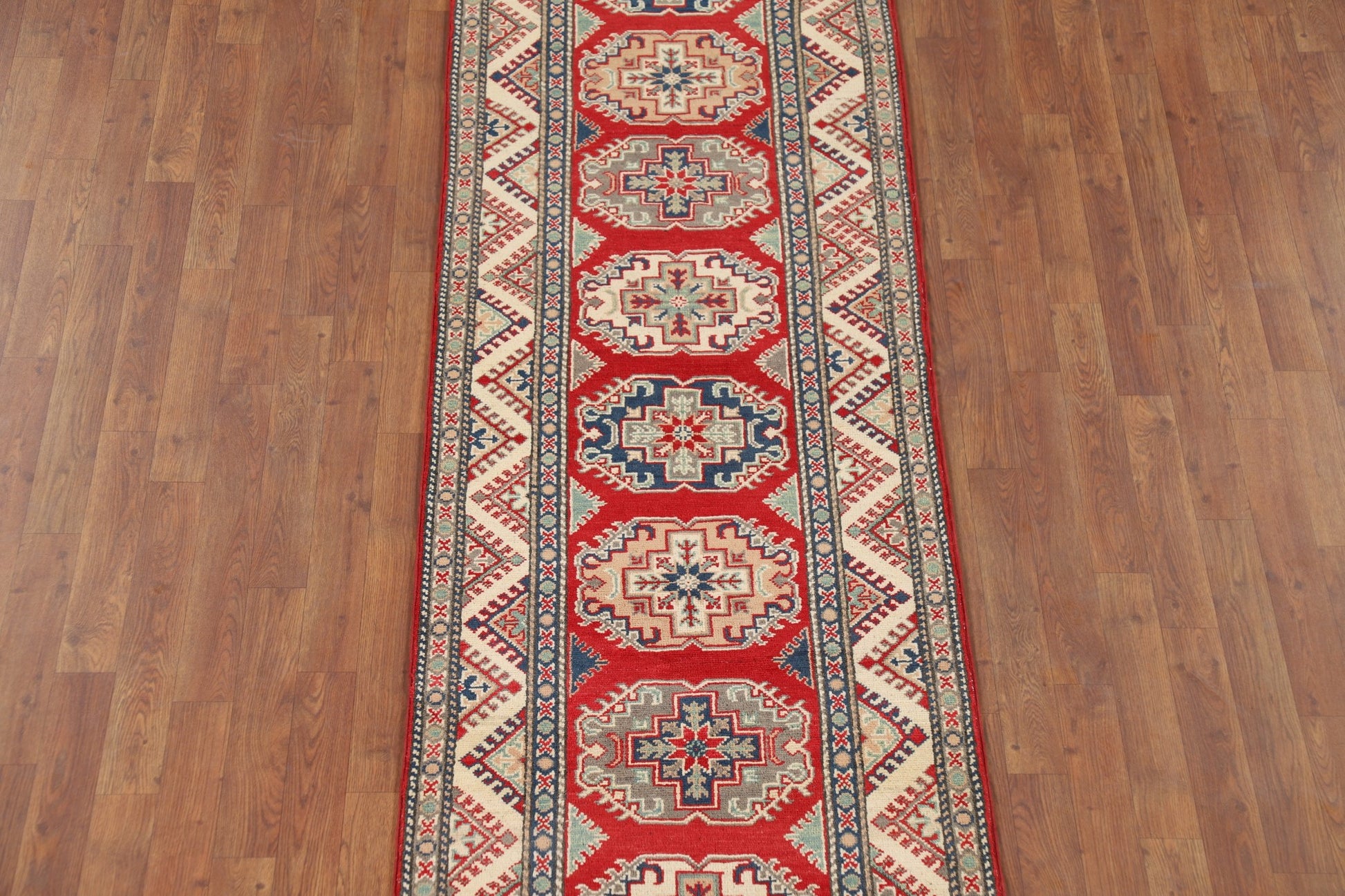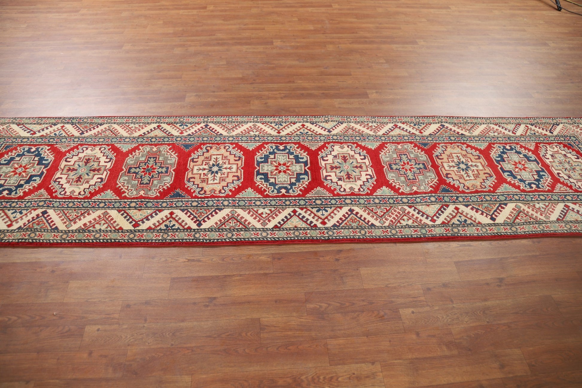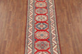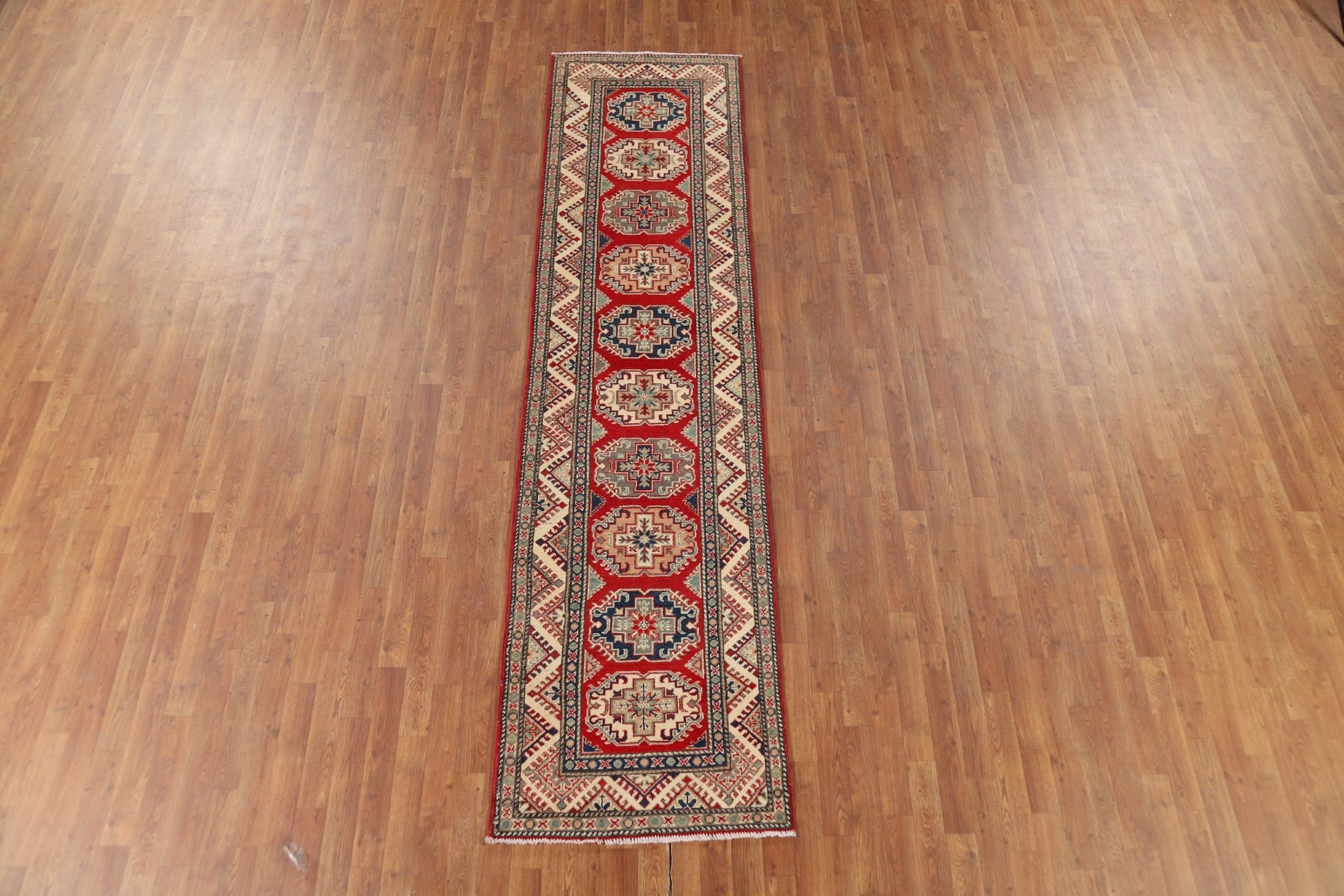 A Beautiful Genuine Pakistan Kazak rug is Hand Knotted by skillful weavers in Pakistan with 100% Wool Material. This rug is in New, First Quality condition. dimensions are 10' 7'' X 2' 7'' in foot and 323 X 79 in centimeter. the primary color is Red.