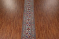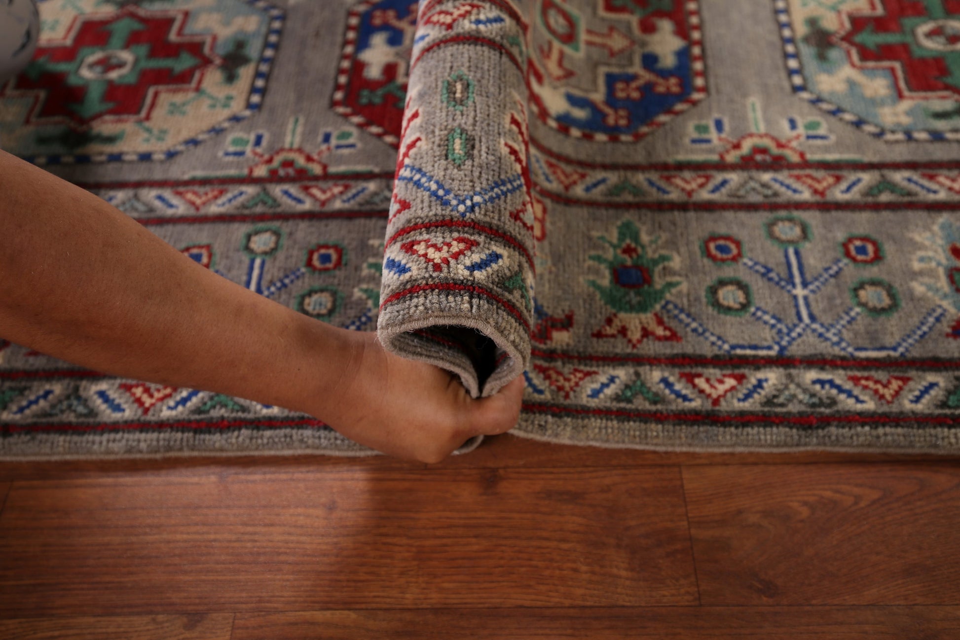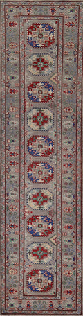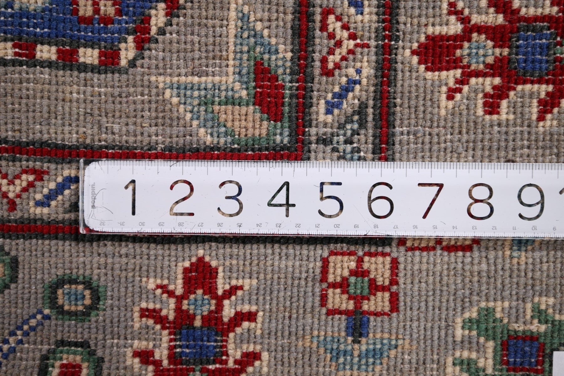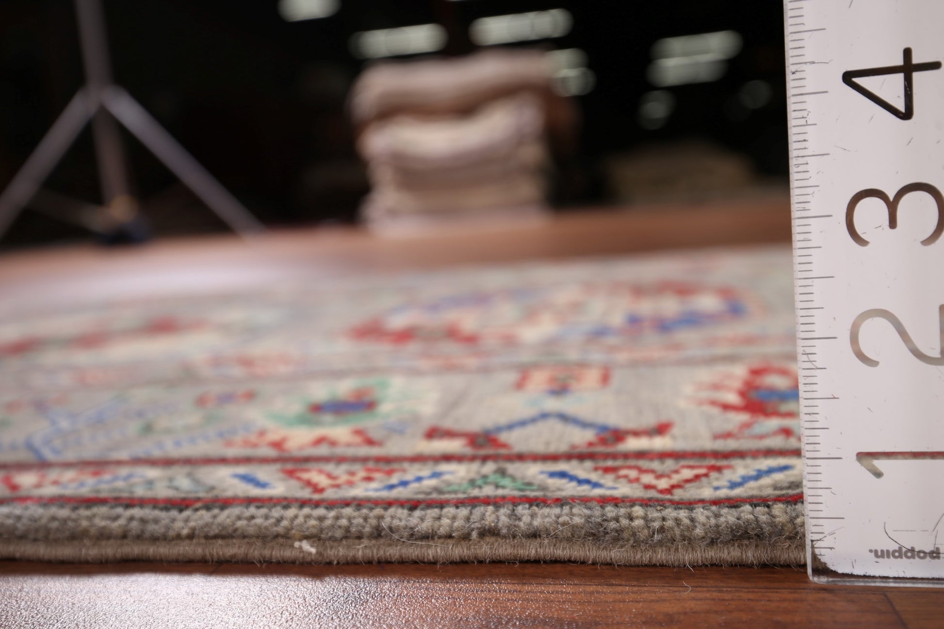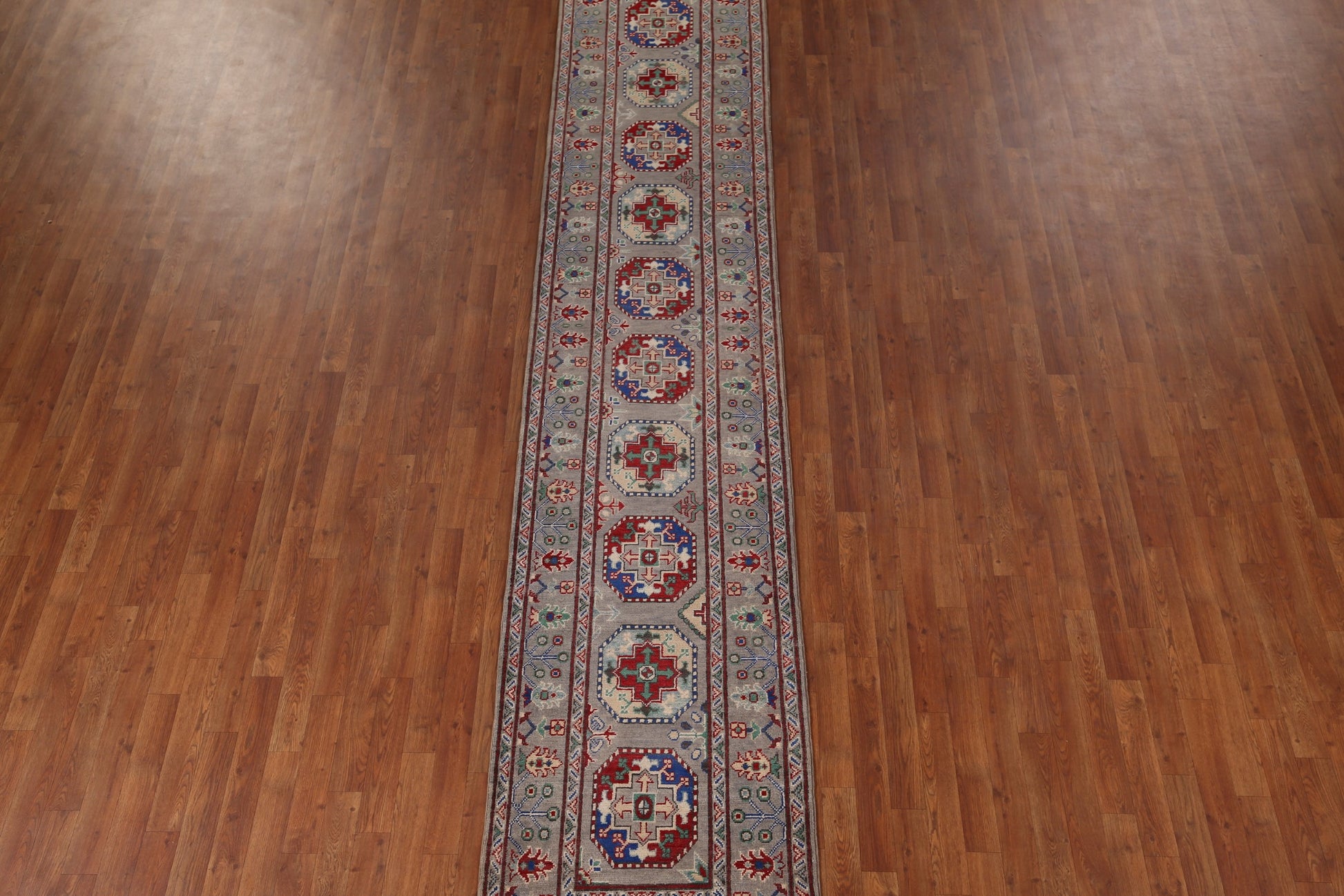 A Beautiful Genuine Pakistan Kazak rug is Hand Knotted by skillful weavers in Pakistan with 100% Wool Material. This rug is in New, First Quality condition. dimensions are 12' 10'' X 2' 7'' in foot and 391 X 79 in centimeter. the primary color is Greys & Charcoal.