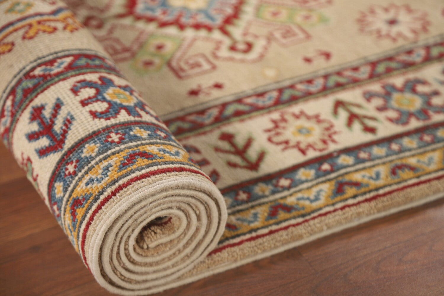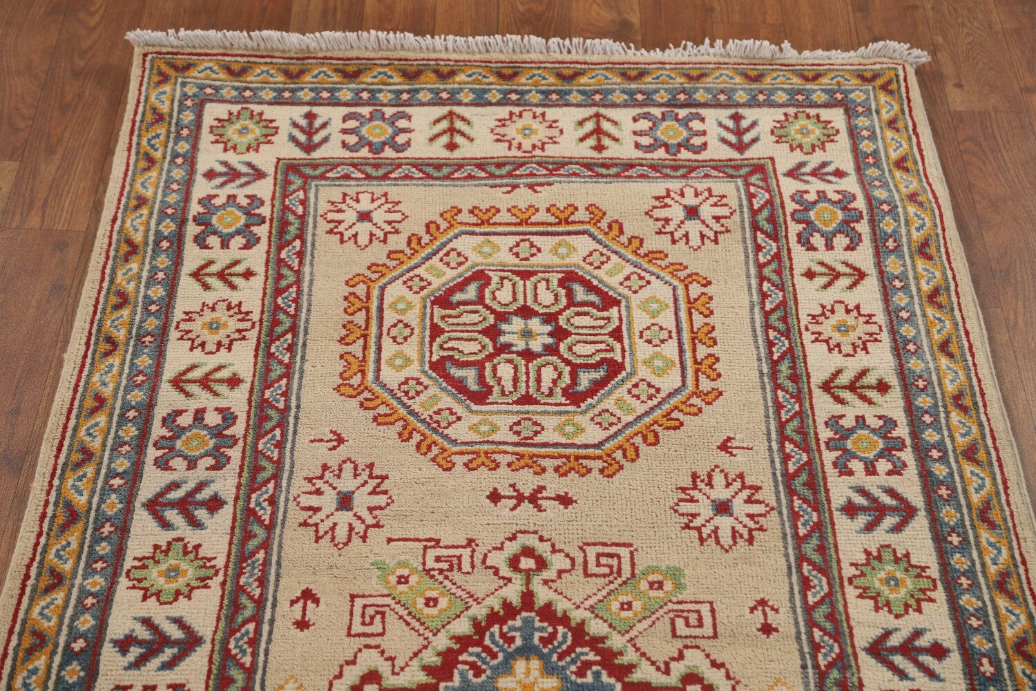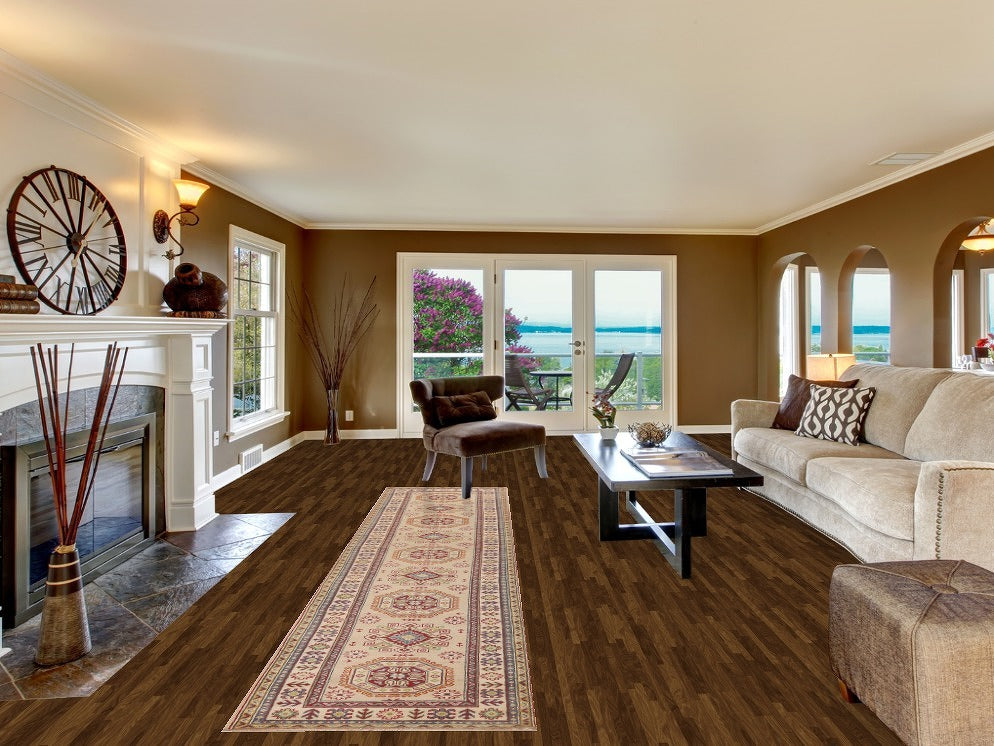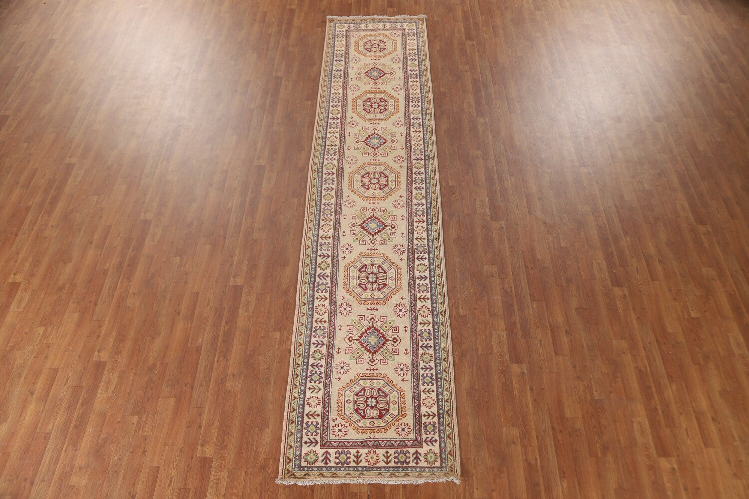 A Beautiful Genuine Pakistan Kazak rug is Hand Knotted by skillful weavers in Pakistan with 100% Wool Material. This rug is in New, First Quality condition. dimensions are 13' 0'' X 2' 10'' in foot and 396 X 86 in centimeter. the primary color is Beige & Ivories.