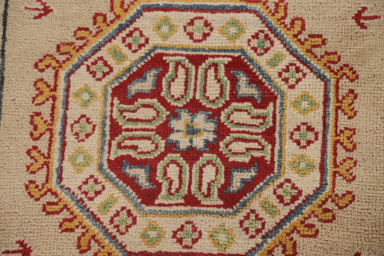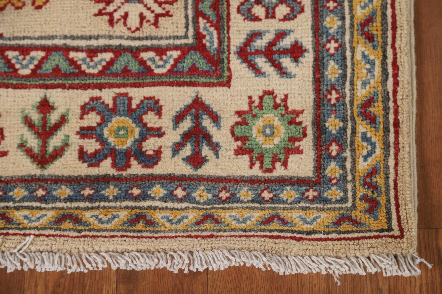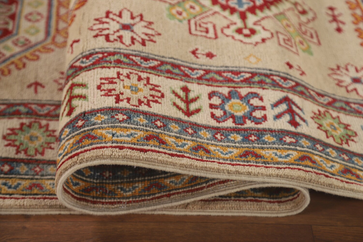 A Beautiful Genuine Pakistan Kazak rug is Hand Knotted by skillful weavers in Pakistan with 100% Wool Material. This rug is in New, First Quality condition. dimensions are 13' 0'' X 2' 10'' in foot and 396 X 86 in centimeter. the primary color is Beige & Ivories.
