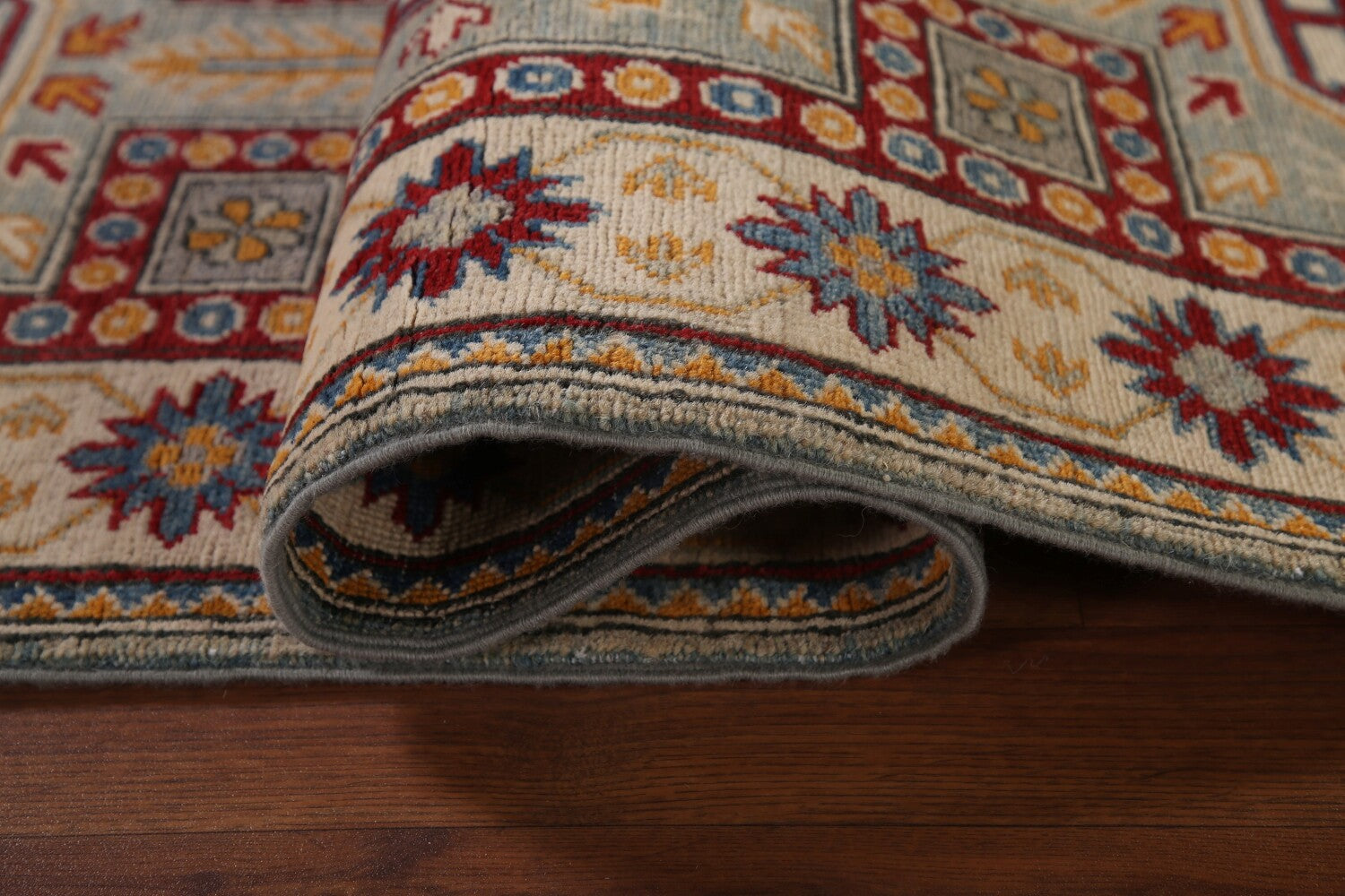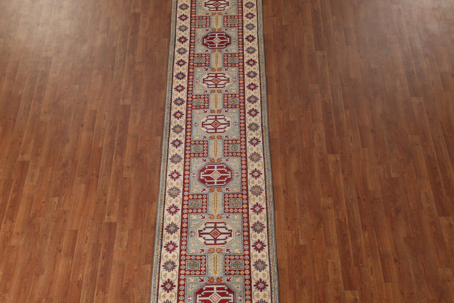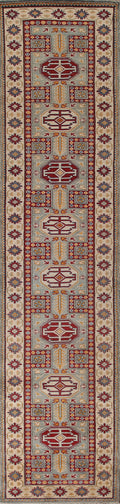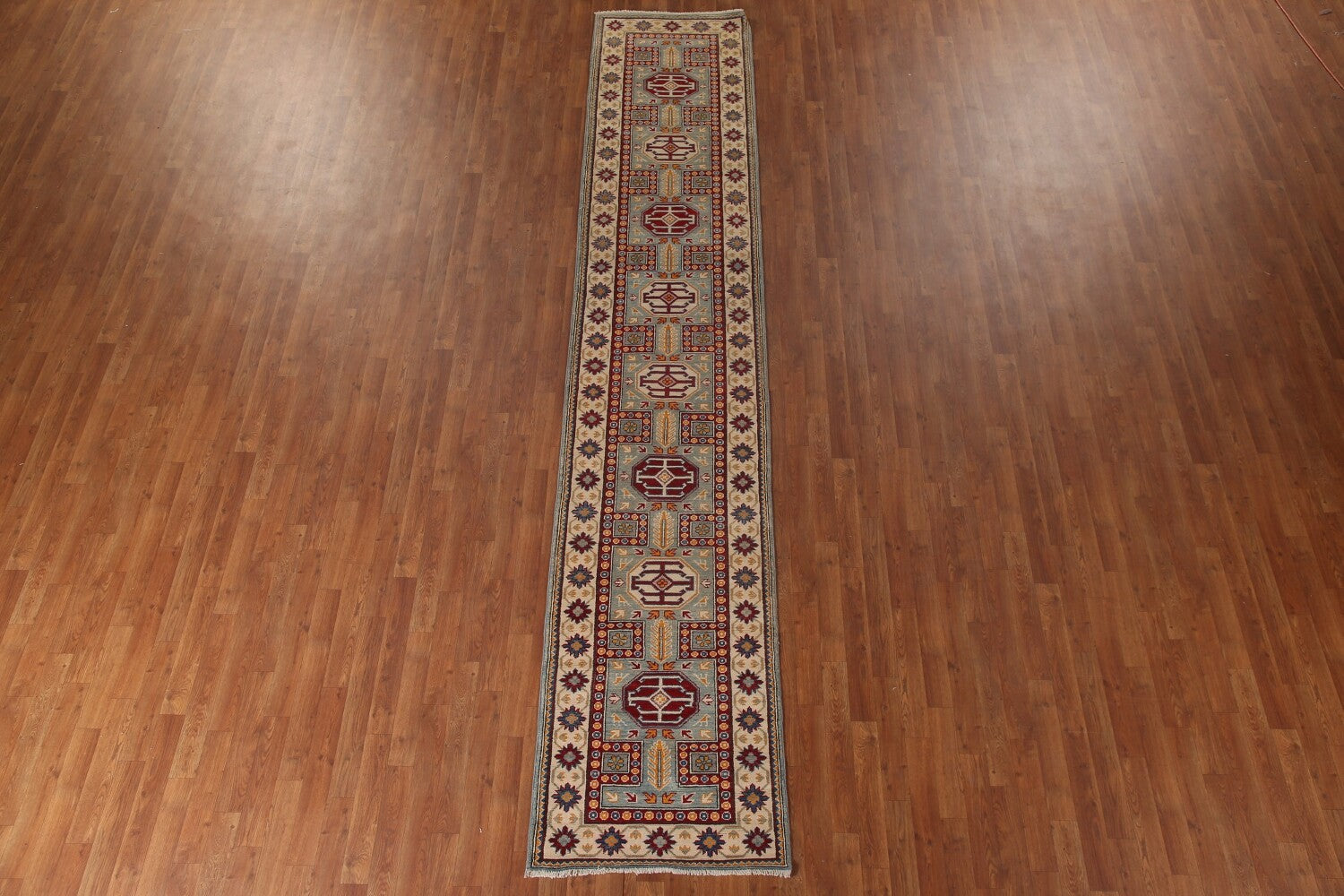 A Beautiful Genuine Pakistan Kazak rug is Hand Knotted by skillful weavers in Pakistan with 100% Wool Material. This rug is in New, First Quality condition. dimensions are 13' 5'' X 2' 6'' in foot and 409 X 76 in centimeter. the primary color is Navy Blue & Blues.