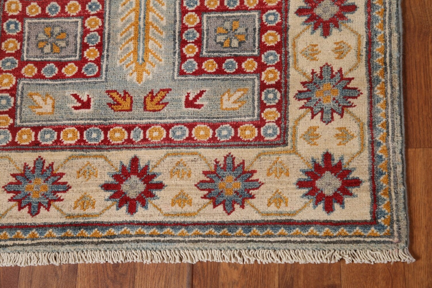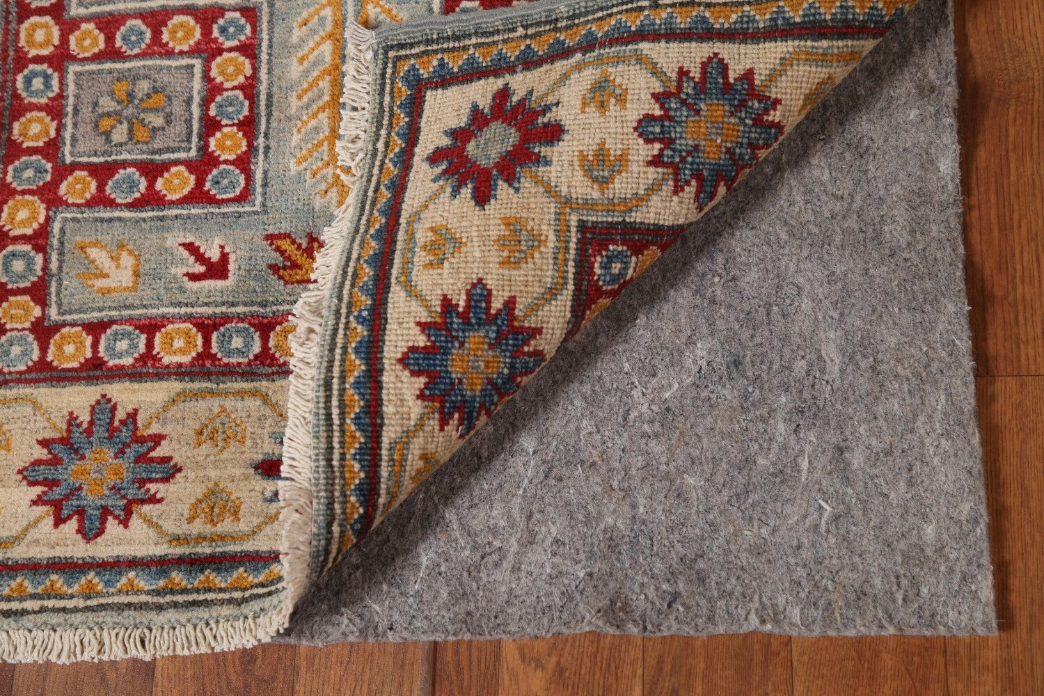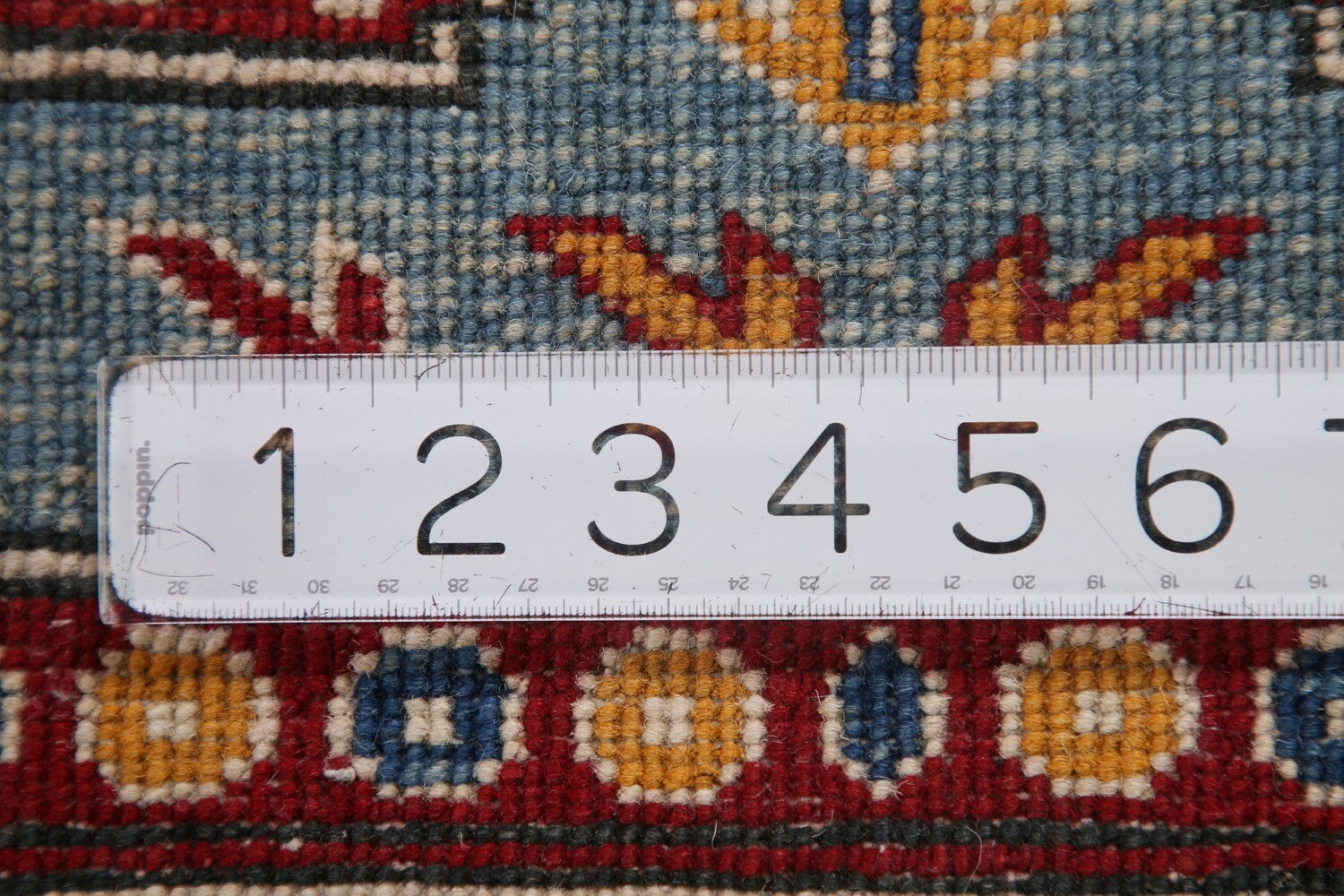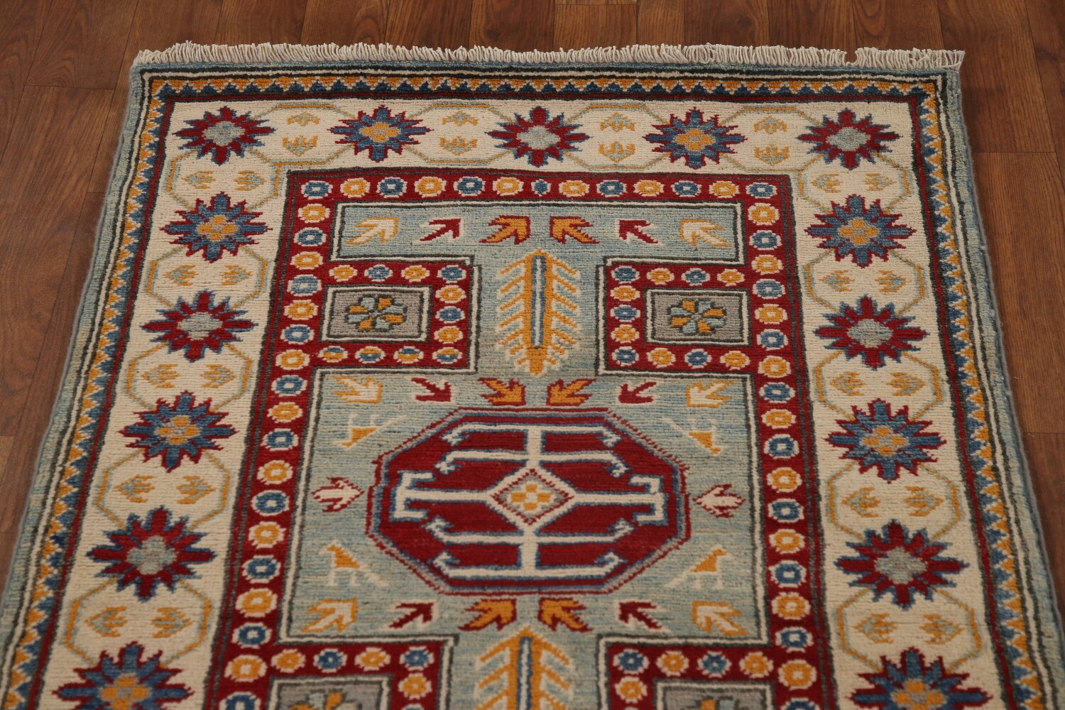 A Beautiful Genuine Pakistan Kazak rug is Hand Knotted by skillful weavers in Pakistan with 100% Wool Material. This rug is in New, First Quality condition. dimensions are 13' 5'' X 2' 6'' in foot and 409 X 76 in centimeter. the primary color is Navy Blue & Blues.