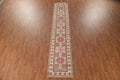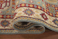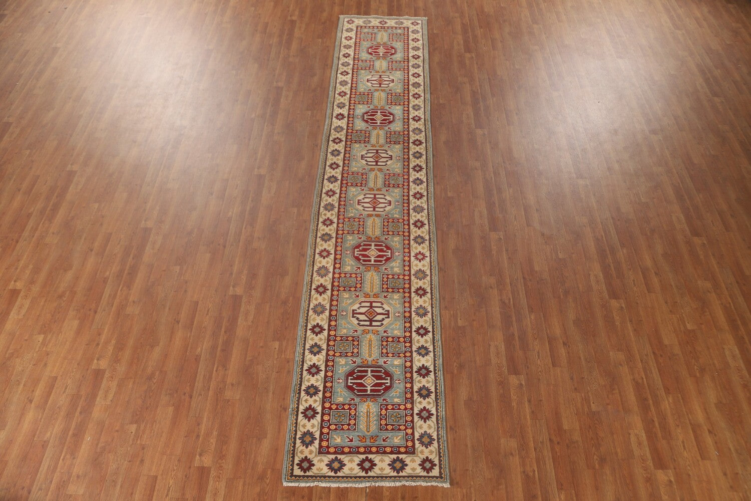 A Beautiful Genuine Pakistan Kazak rug is Hand Knotted by skillful weavers in Pakistan with 100% Wool Material. This rug is in New, First Quality condition. dimensions are 13' 6'' X 2' 8'' in foot and 411 X 81 in centimeter. the primary color is Navy Blue & Blues.
