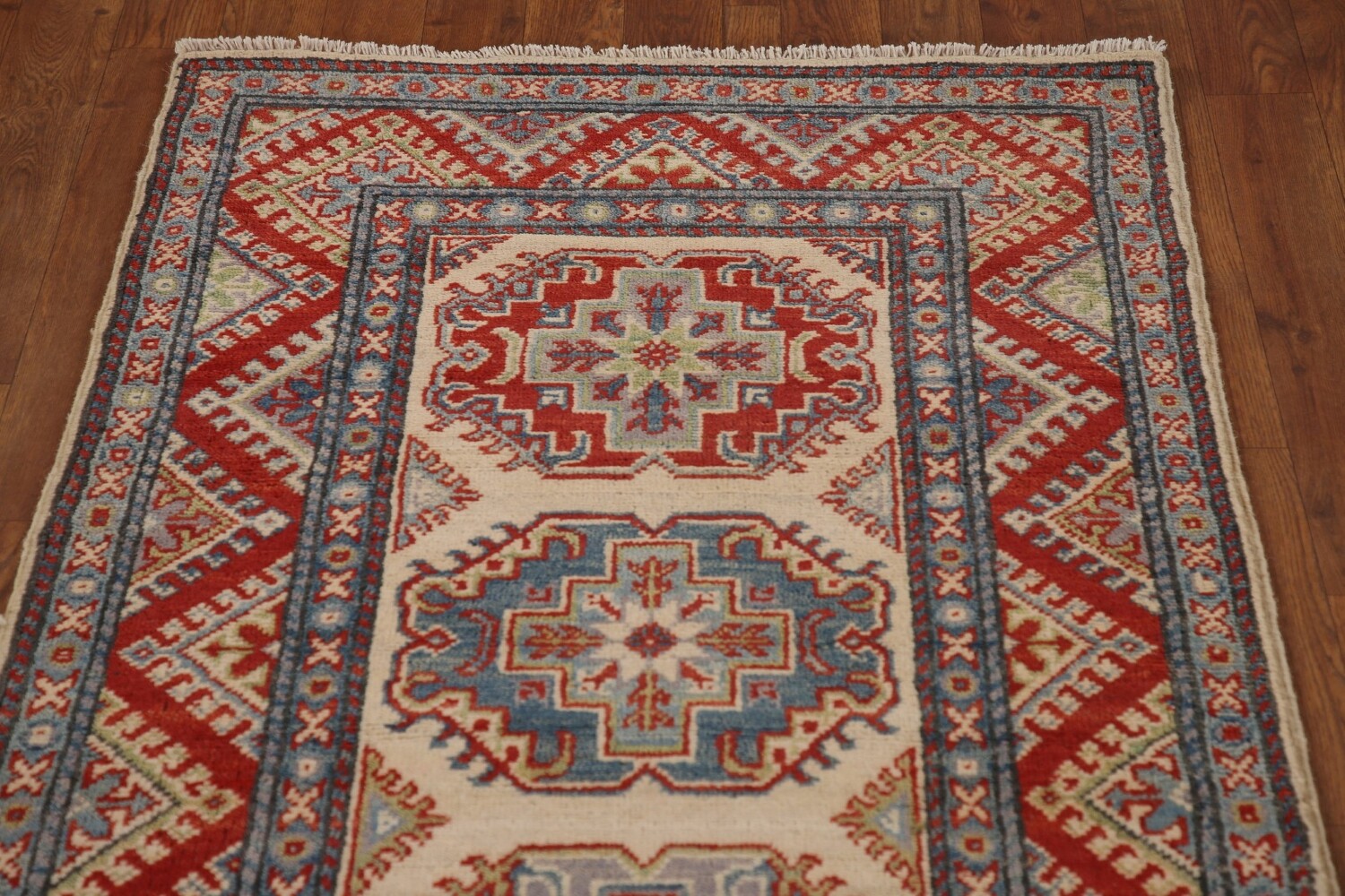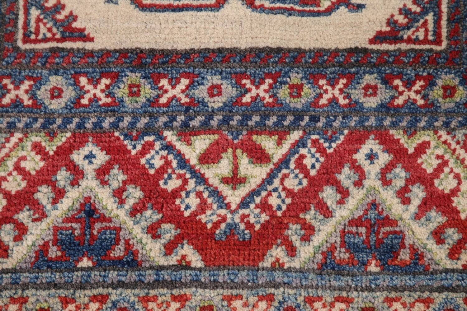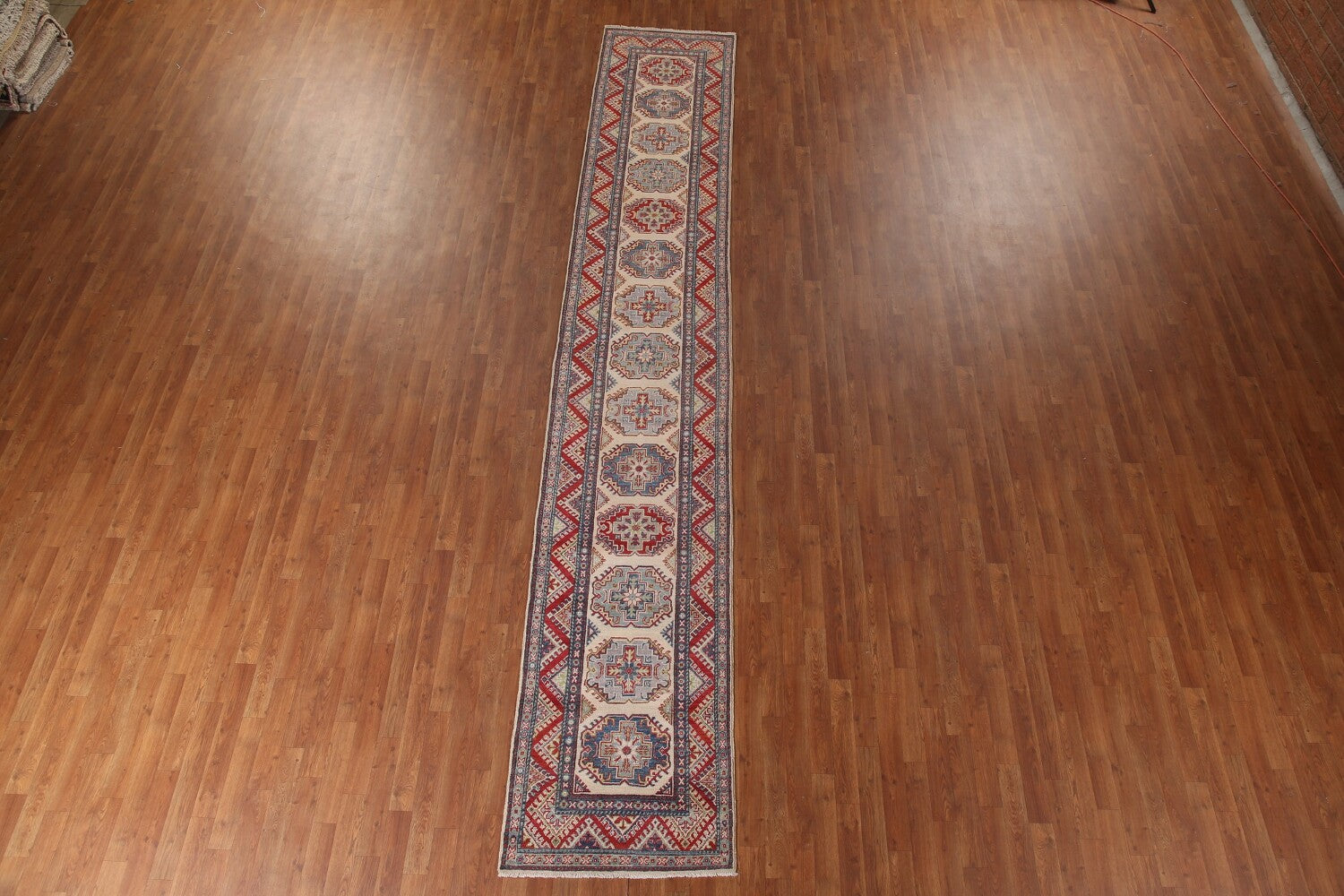 A Beautiful Genuine Pakistan Kazak rug is Hand Knotted by skillful weavers in Pakistan with 100% Wool Material. This rug is in New, First Quality condition. dimensions are 15' 5'' X 2' 7'' in foot and 470 X 79 in centimeter. the primary color is Beige & Ivories.