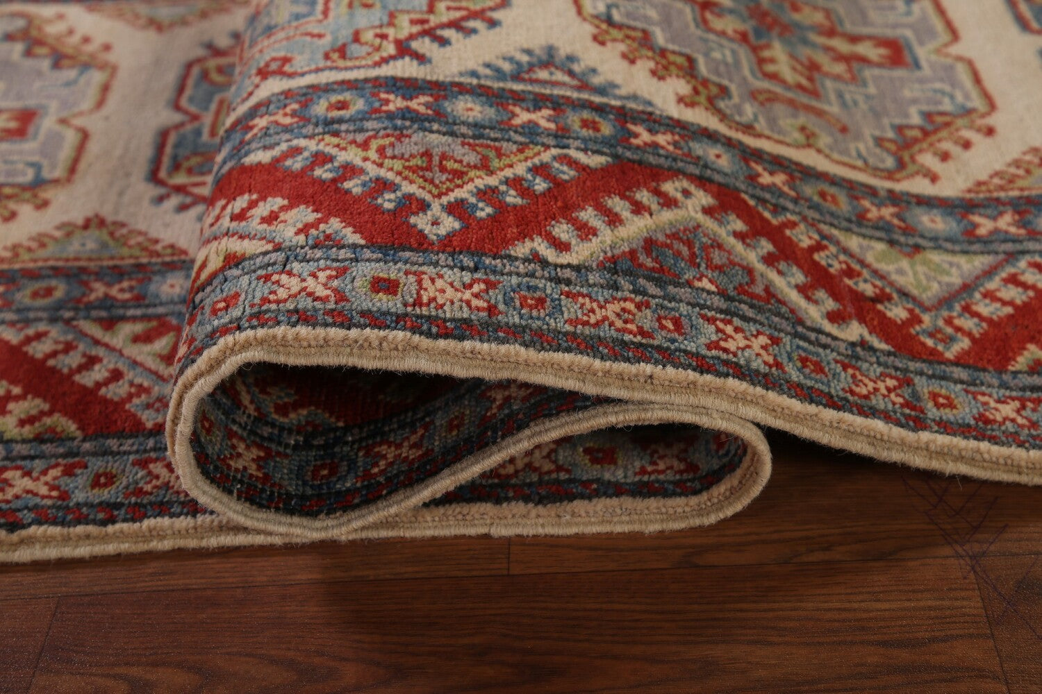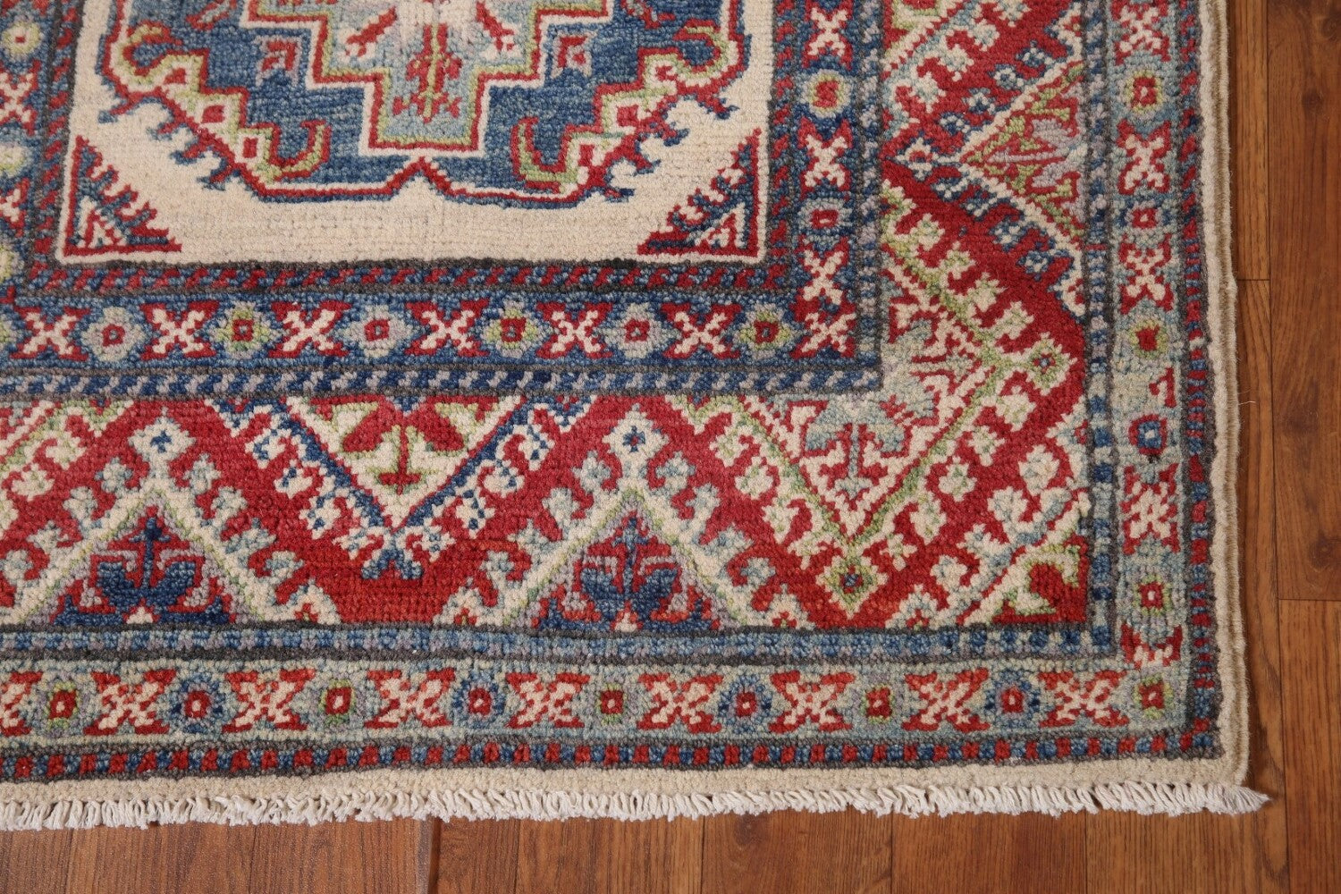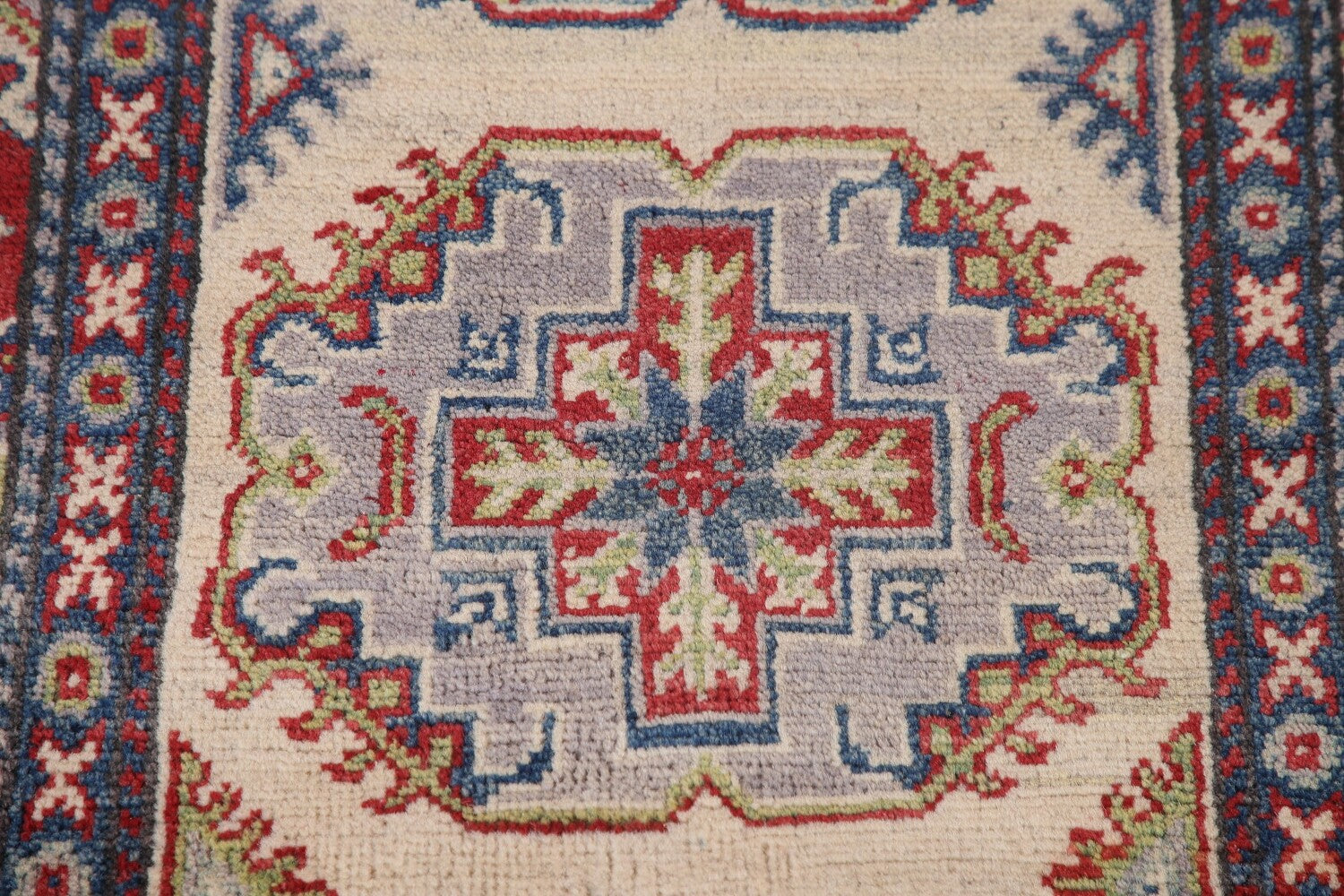 A Beautiful Genuine Pakistan Kazak rug is Hand Knotted by skillful weavers in Pakistan with 100% Wool Material. This rug is in New, First Quality condition. dimensions are 15' 5'' X 2' 7'' in foot and 470 X 79 in centimeter. the primary color is Beige & Ivories.