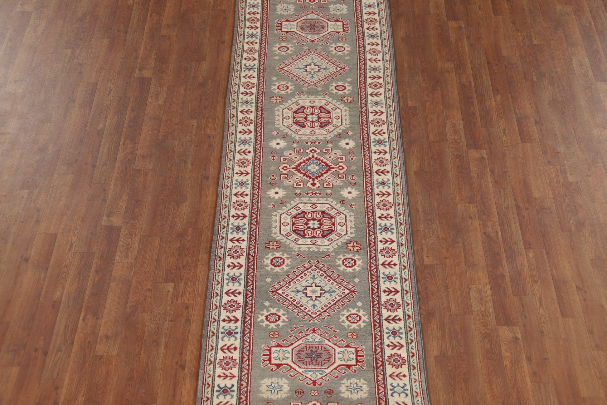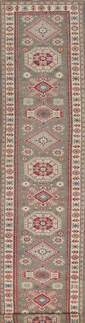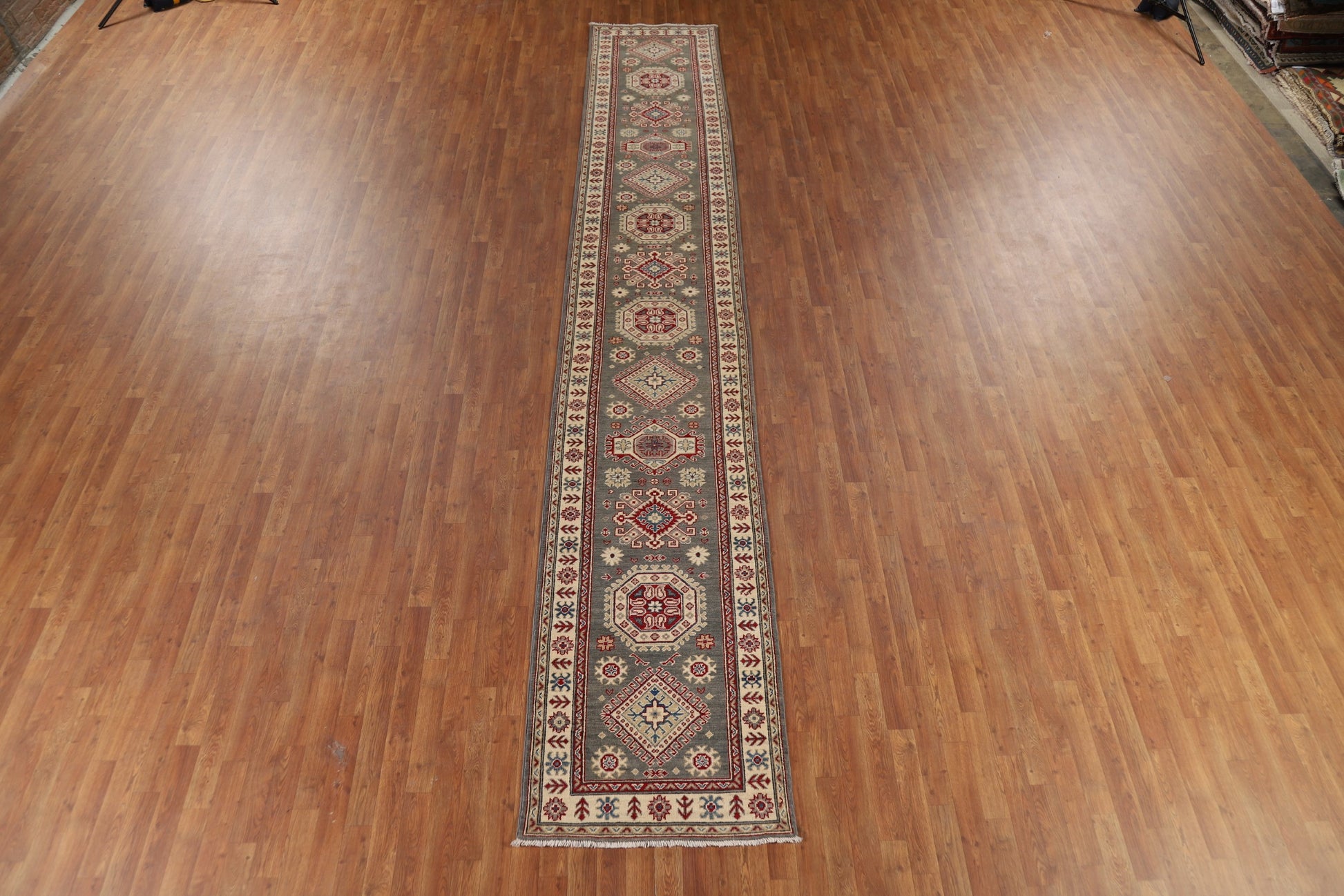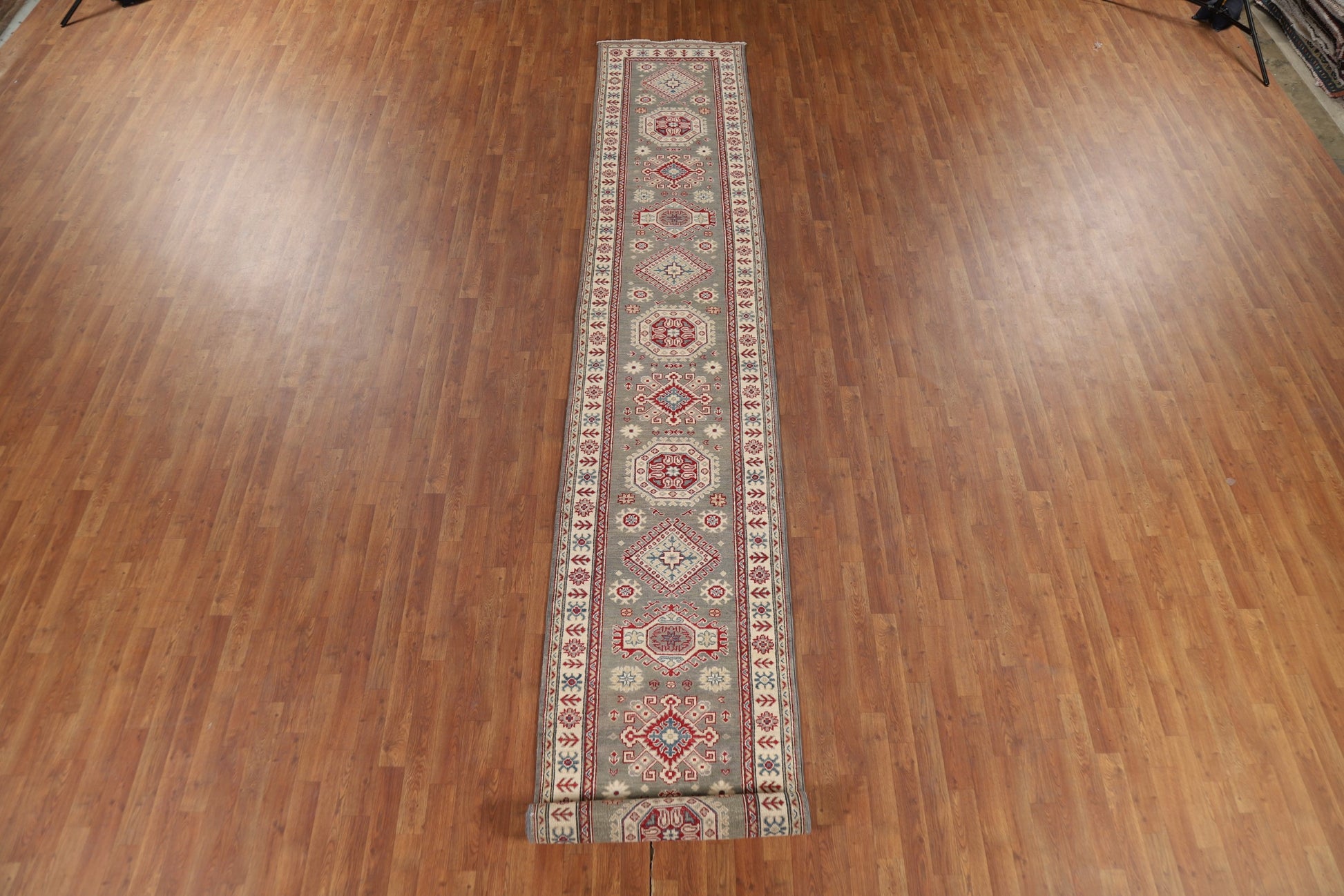 A Beautiful Genuine Pakistan Kazak rug is Hand Knotted by skillful weavers in Pakistan with 100% Wool Material. This rug is in New, First Quality condition. dimensions are 16' 4'' X 2' 8'' in foot and 498 X 81 in centimeter. the primary color is Greys & Charcoal.