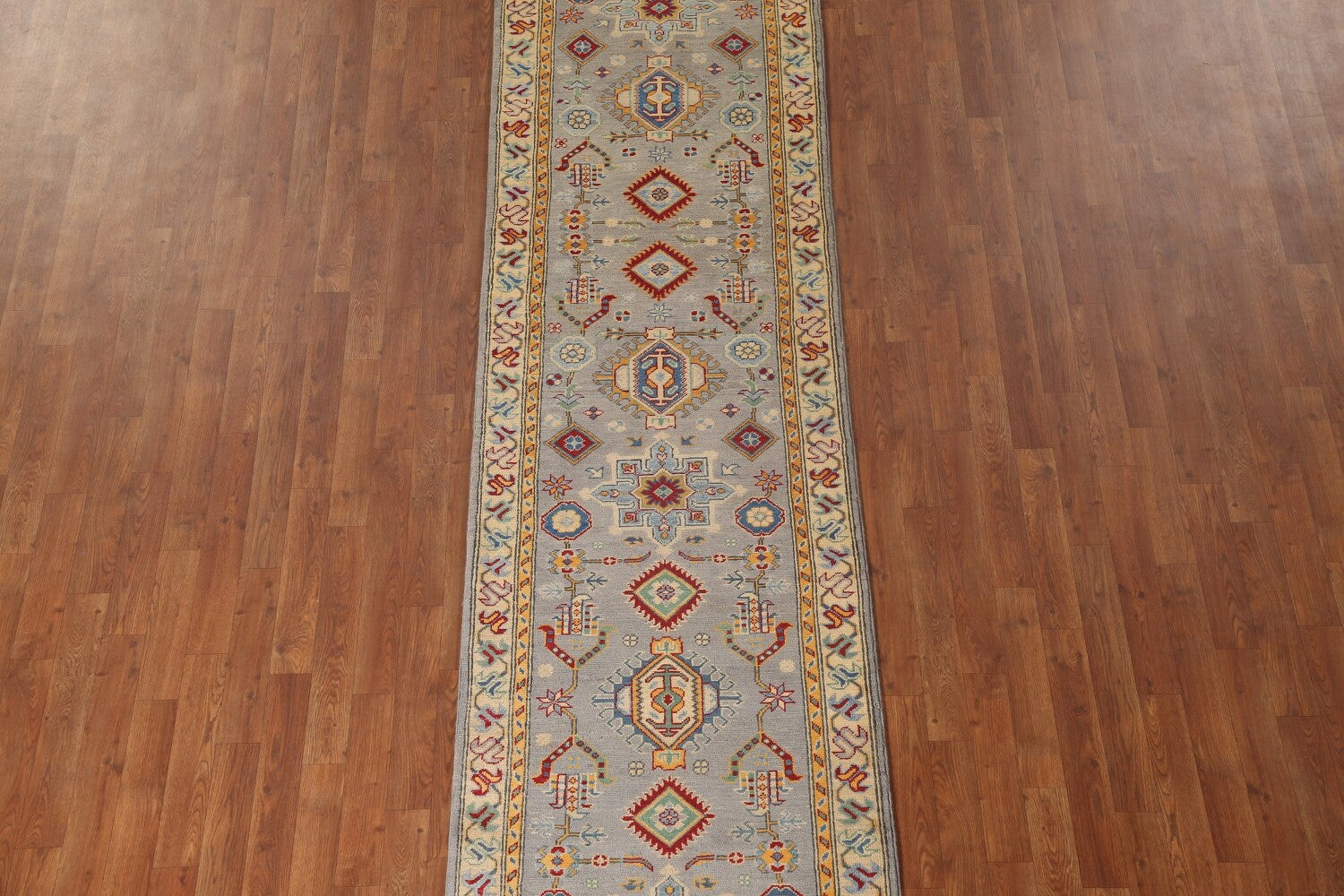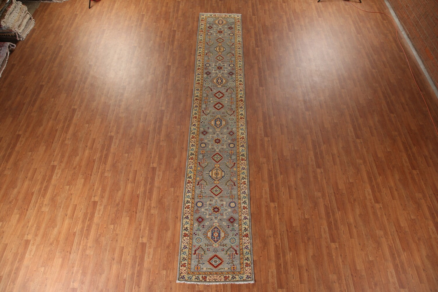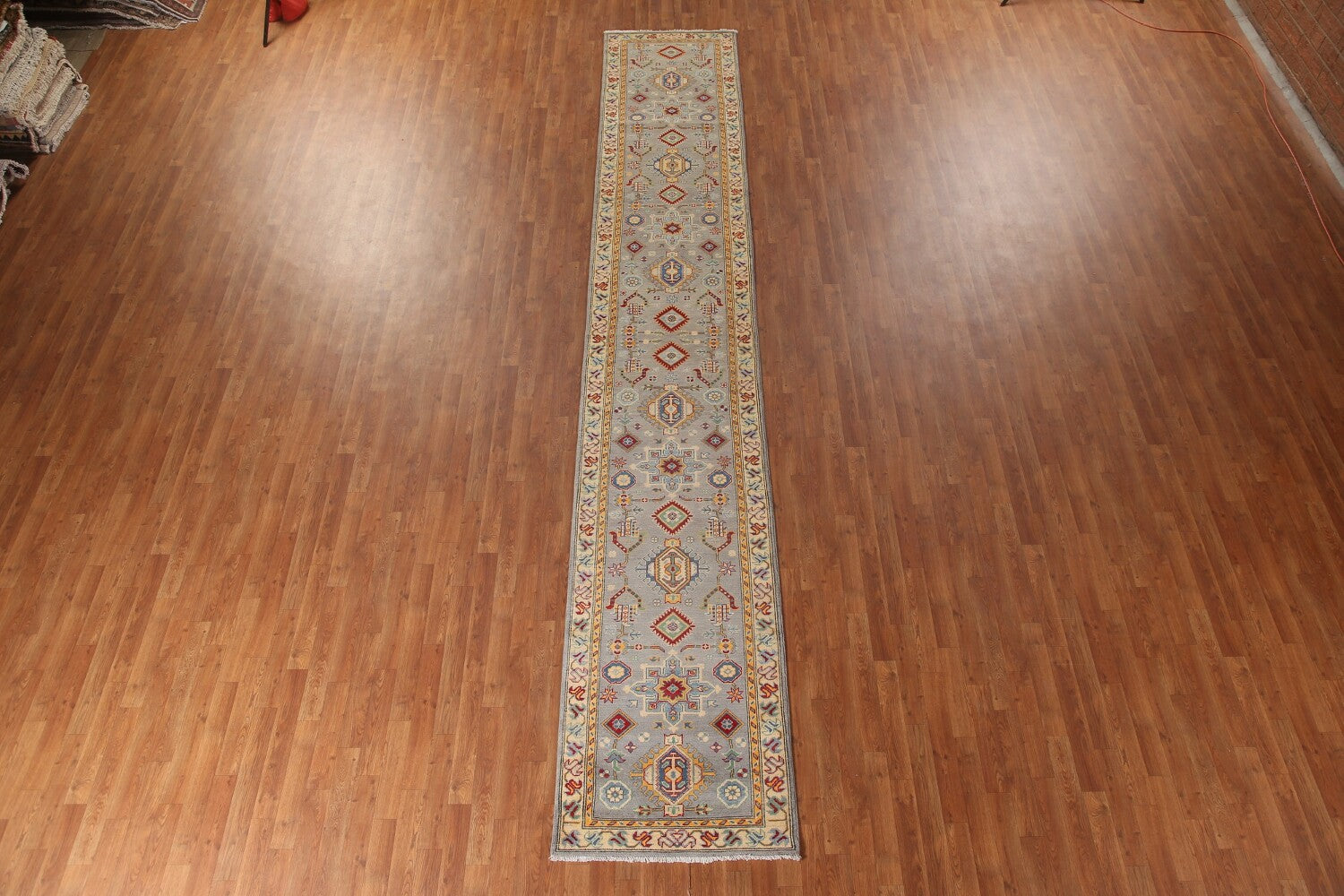 A Beautiful Genuine Pakistan Kazak rug is Hand Knotted by skillful weavers in Pakistan with 100% Wool Material. This rug is in New, First Quality condition. dimensions are 16' 3'' X 2' 8'' in foot and 495 X 81 in centimeter. the primary color is Greys & Charcoal.
