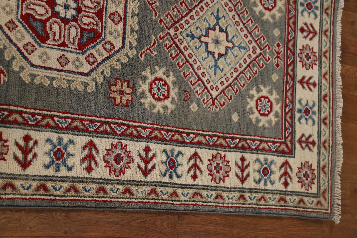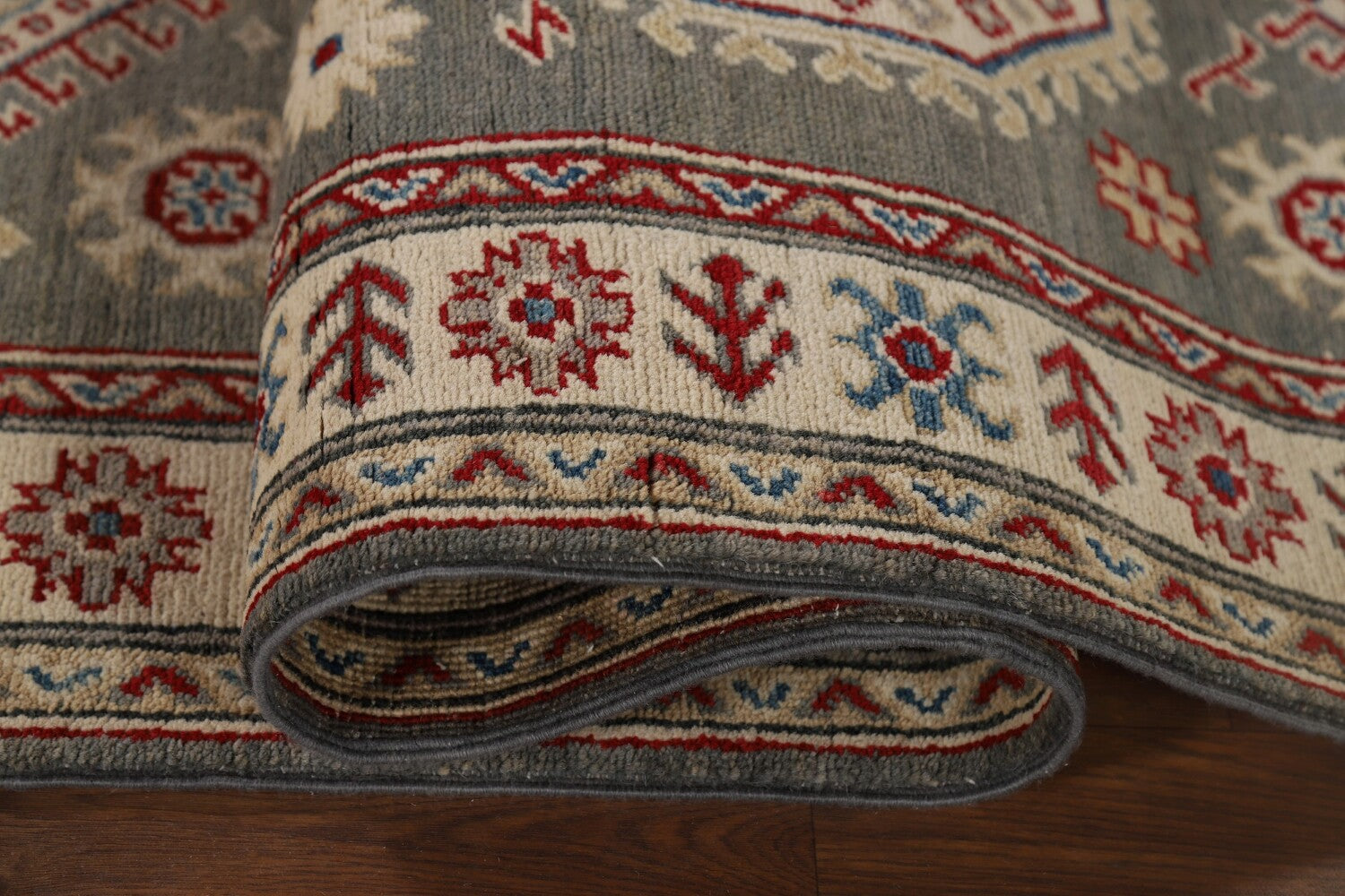 A Beautiful Genuine Pakistan Kazak rug is Hand Knotted by skillful weavers in Pakistan with 100% Wool Material. This rug is in New, First Quality condition. dimensions are 16' 3'' X 2' 7'' in foot and 495 X 79 in centimeter. the primary color is Greys & Charcoal.
