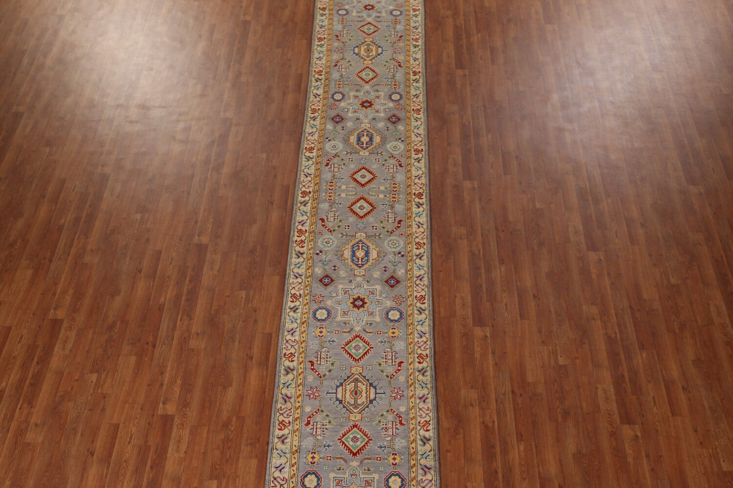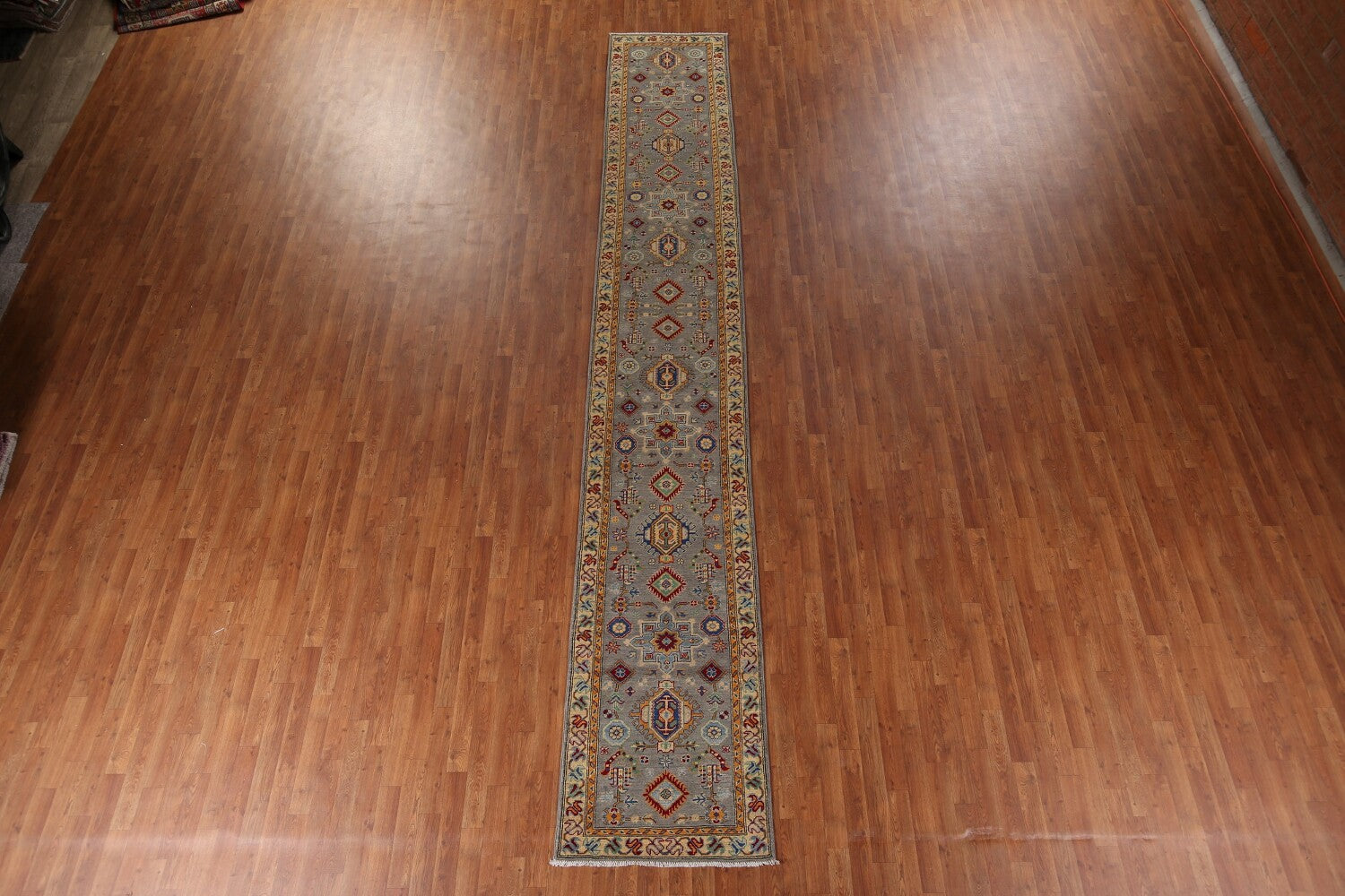 A Beautiful Genuine Pakistan Kazak rug is Hand Knotted by skillful weavers in Pakistan with 100% Wool Material. This rug is in New, First Quality condition. dimensions are 16' 3'' X 2' 7'' in foot and 495 X 79 in centimeter. the primary color is Greys & Charcoal.