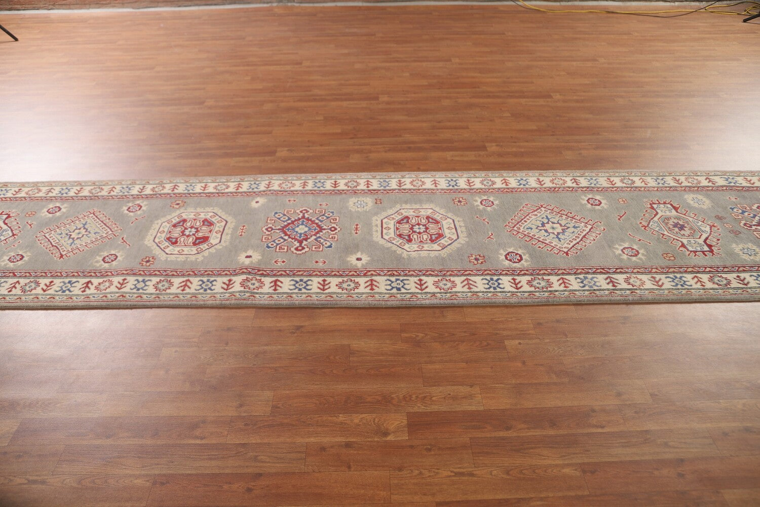 A Beautiful Genuine Pakistan Kazak rug is Hand Knotted by skillful weavers in Pakistan with 100% Wool Material. This rug is in New, First Quality condition. dimensions are 19' 7'' X 2' 10'' in foot and 597 X 86 in centimeter. the primary color is Greys & Charcoal.