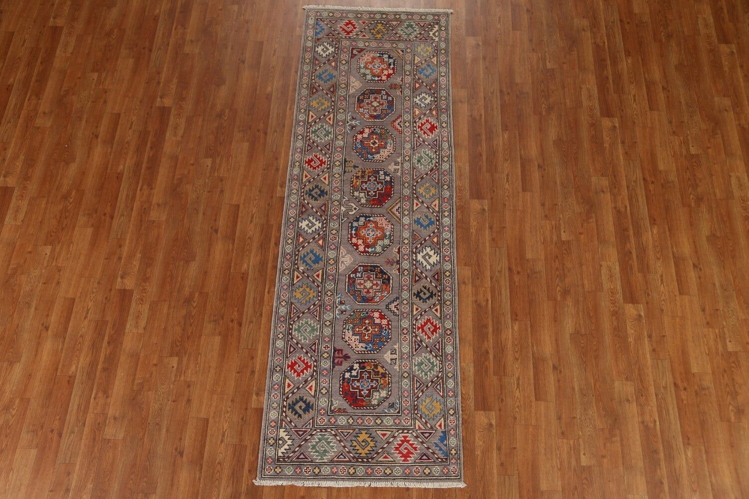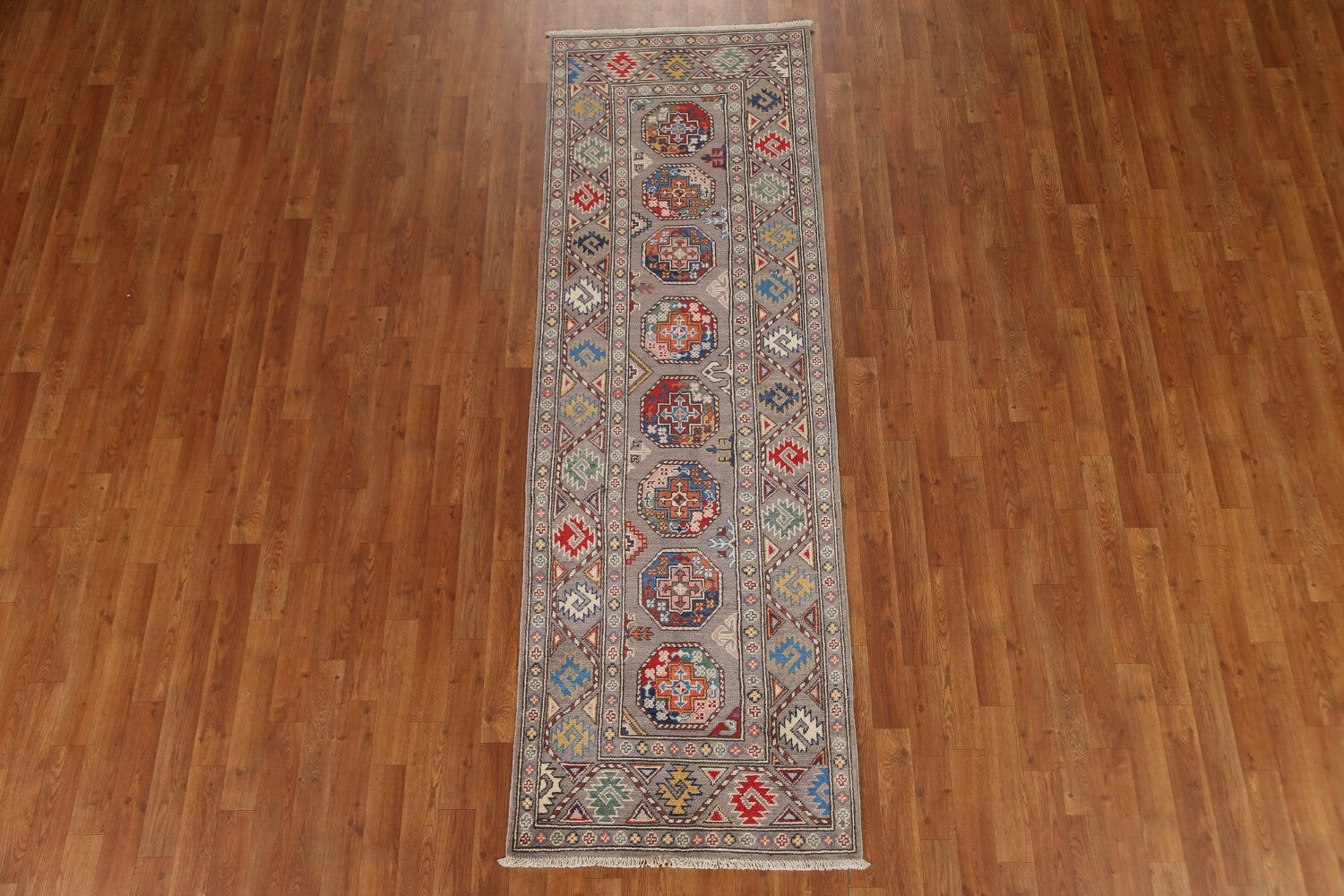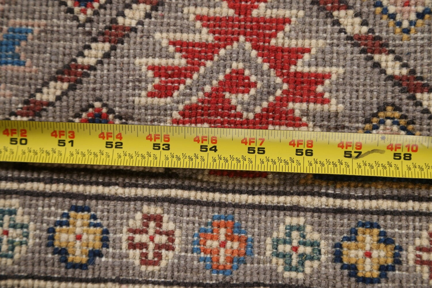 A Beautiful Genuine Pakistan Kazak rug is Hand Knotted by skillful weavers in Pakistan with 100% Wool Material. This rug is in Brand New-Excellent condition. dimensions are 8' 1'' X 2' 7'' in foot and 246 X 79 in centimeter. the primary color is Greys & Charcoal.