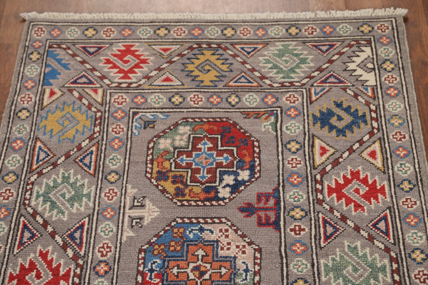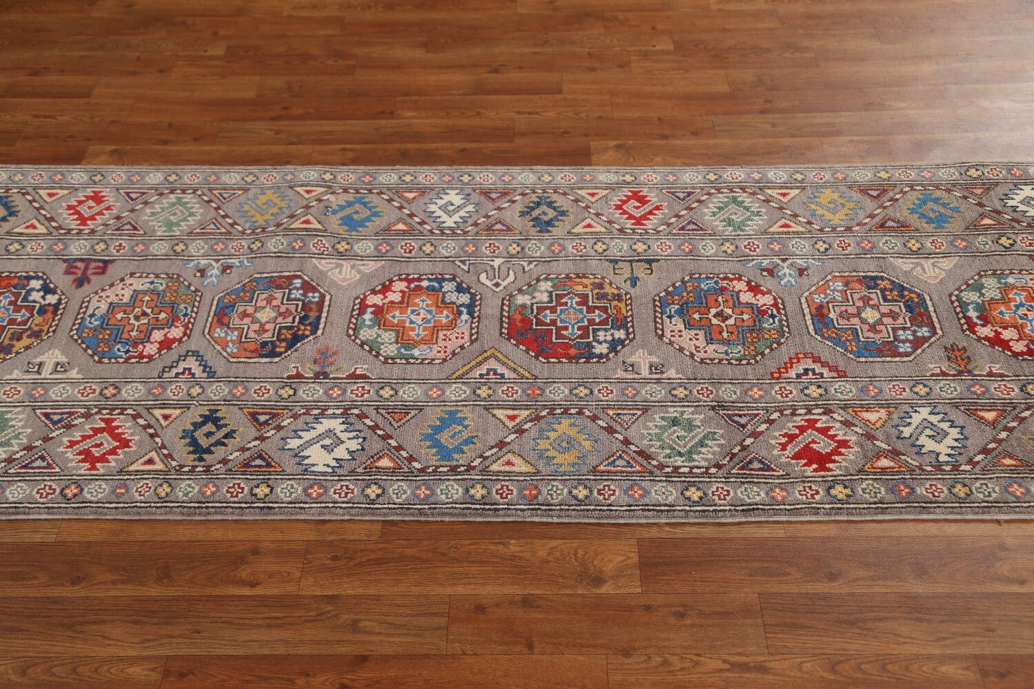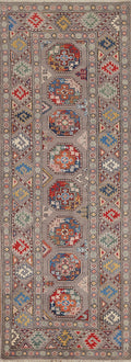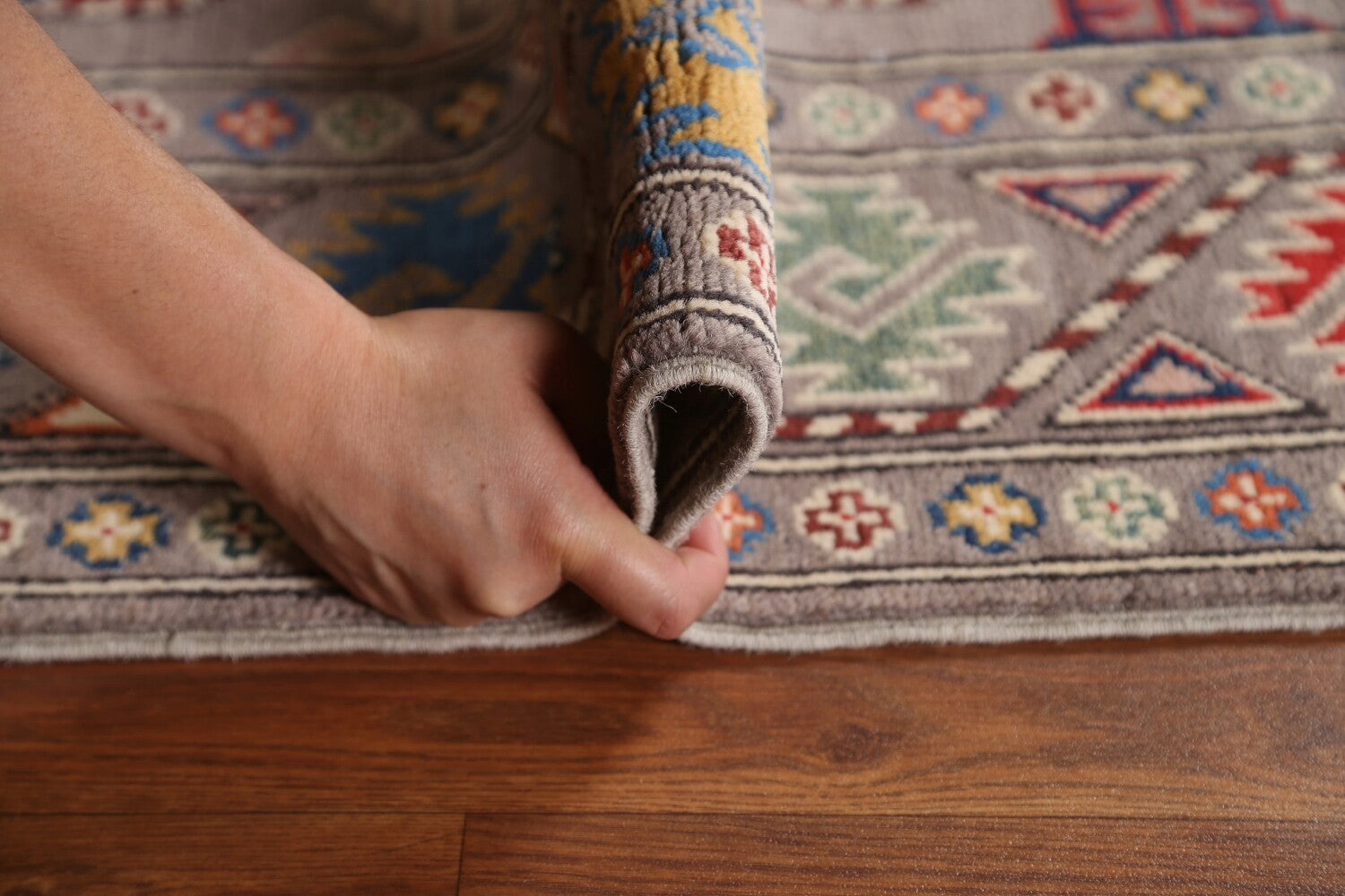 A Beautiful Genuine Pakistan Kazak rug is Hand Knotted by skillful weavers in Pakistan with 100% Wool Material. This rug is in Brand New-Excellent condition. dimensions are 8' 1'' X 2' 7'' in foot and 246 X 79 in centimeter. the primary color is Greys & Charcoal.