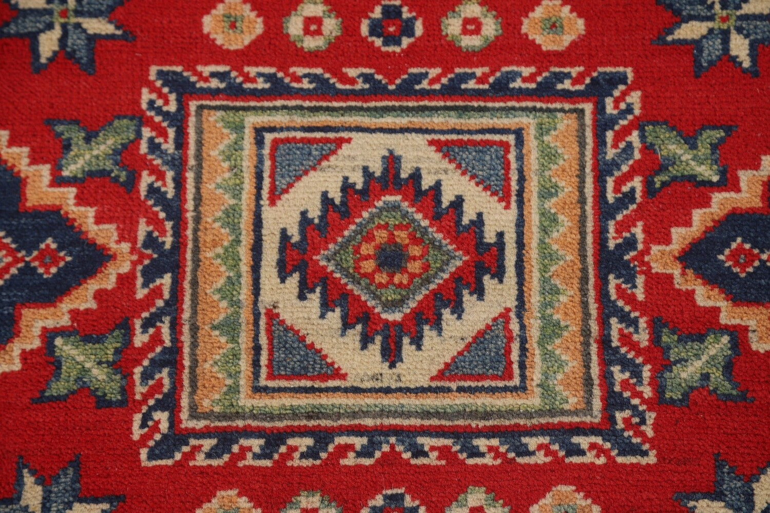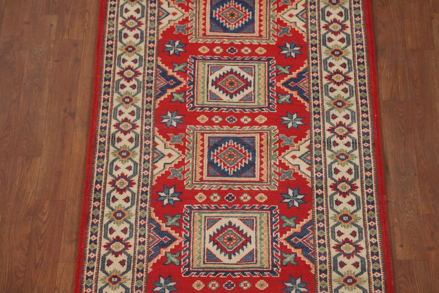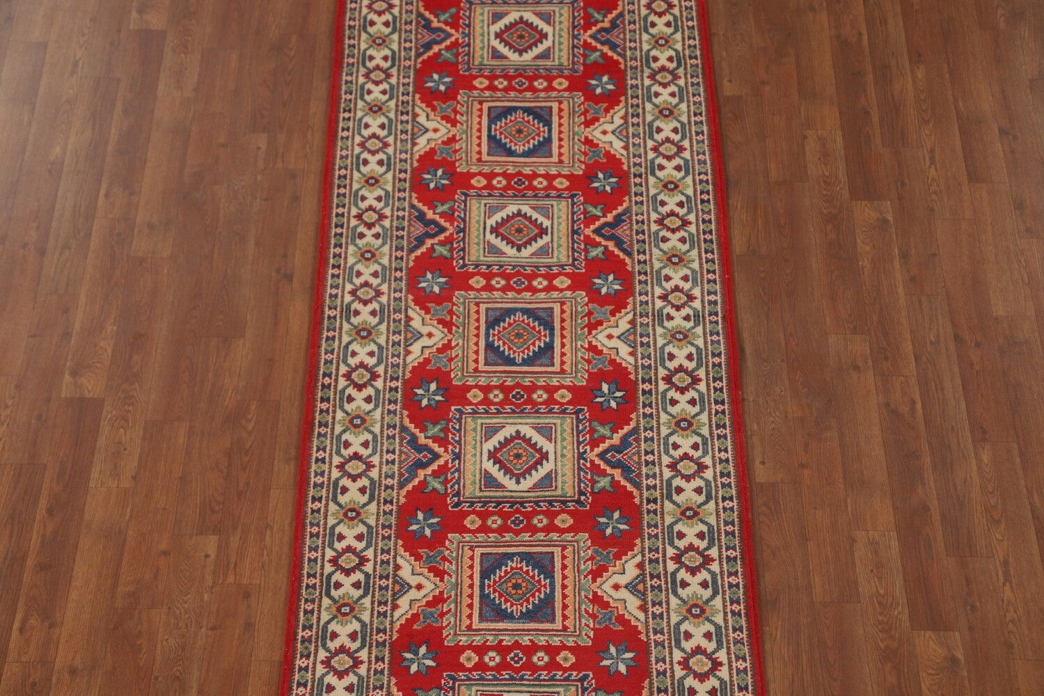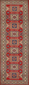 A Beautiful Genuine Pakistan Kazak rug is Hand Knotted by skillful weavers in Pakistan with 100% Wool Material. This rug is in New, First Quality condition. dimensions are 9' 4'' X 2' 9'' in foot and 284 X 84 in centimeter. the primary color is Red.