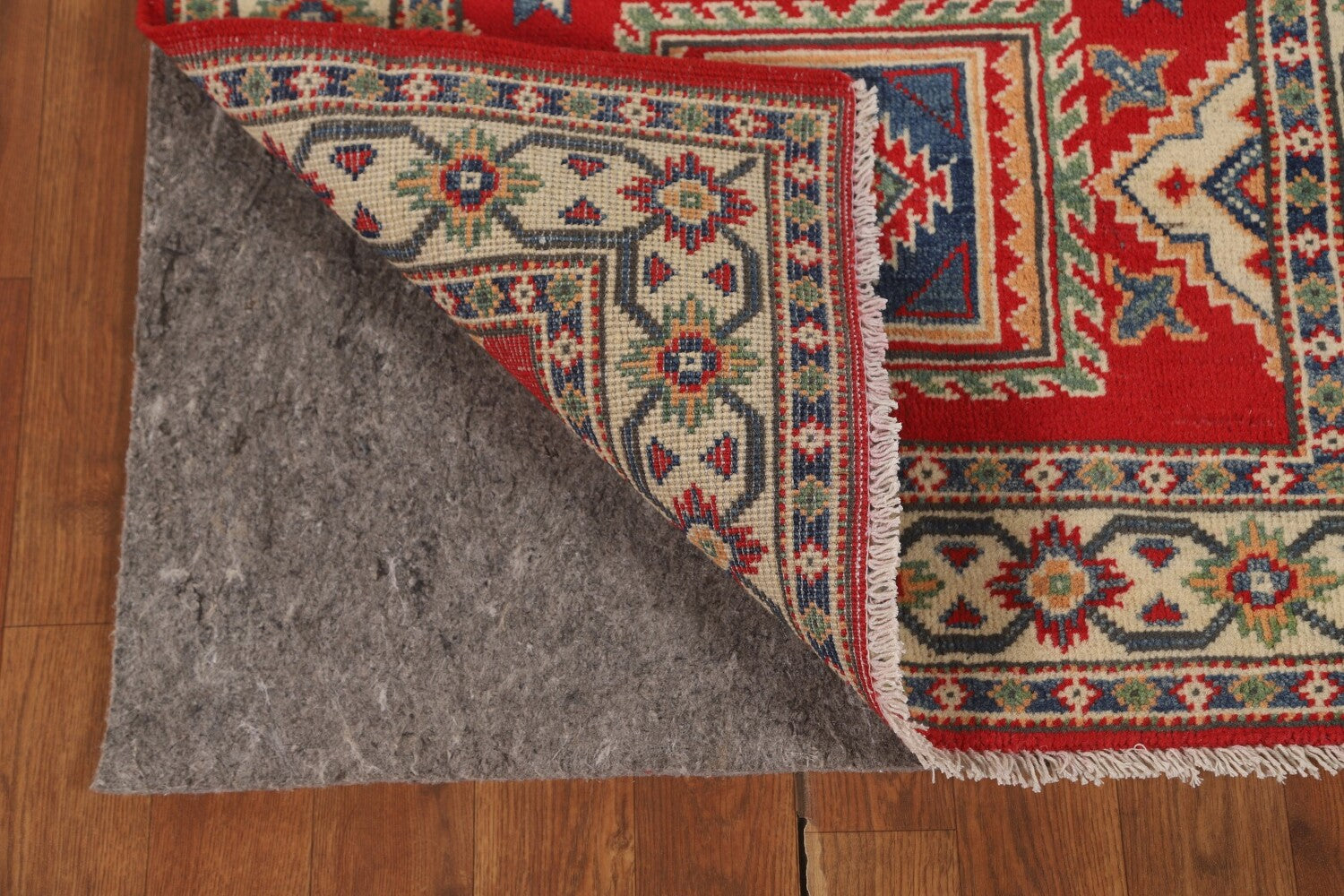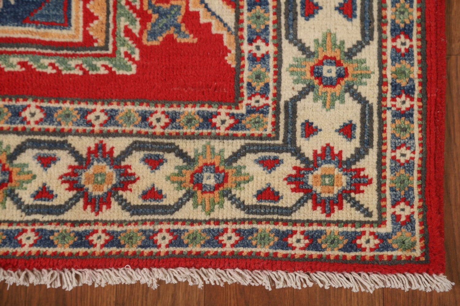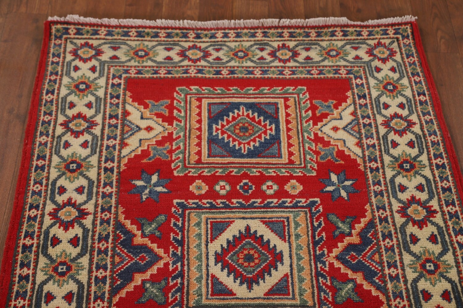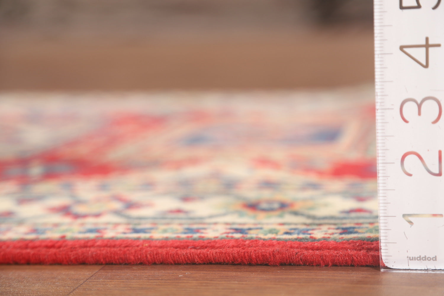 A Beautiful Genuine Pakistan Kazak rug is Hand Knotted by skillful weavers in Pakistan with 100% Wool Material. This rug is in New, First Quality condition. dimensions are 9' 4'' X 2' 9'' in foot and 284 X 84 in centimeter. the primary color is Red.