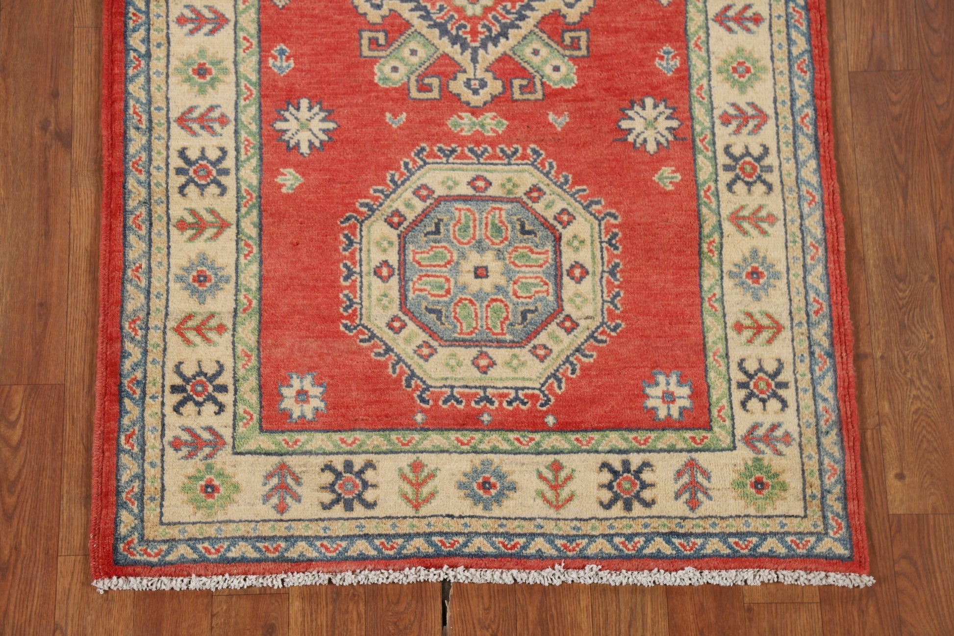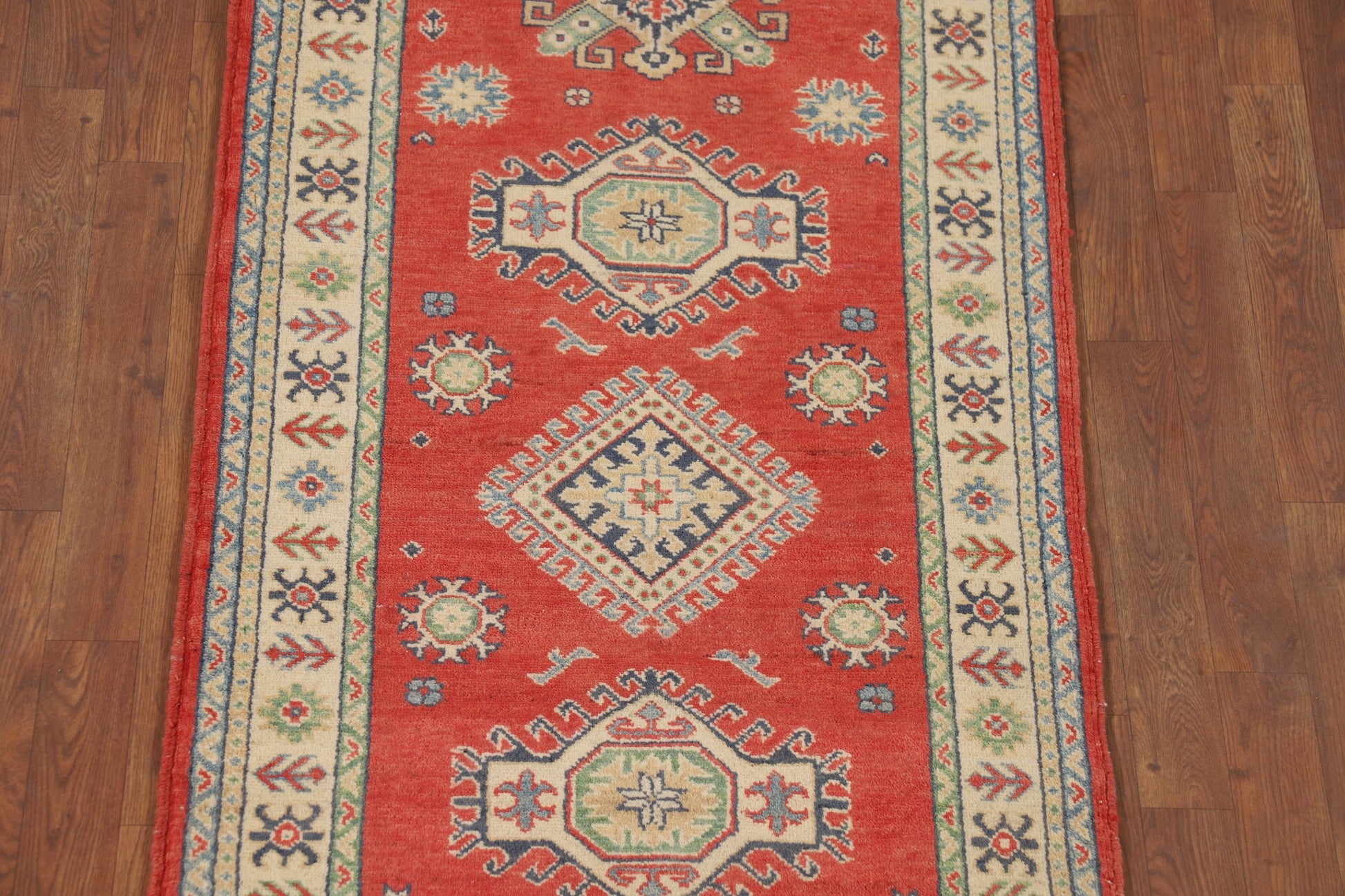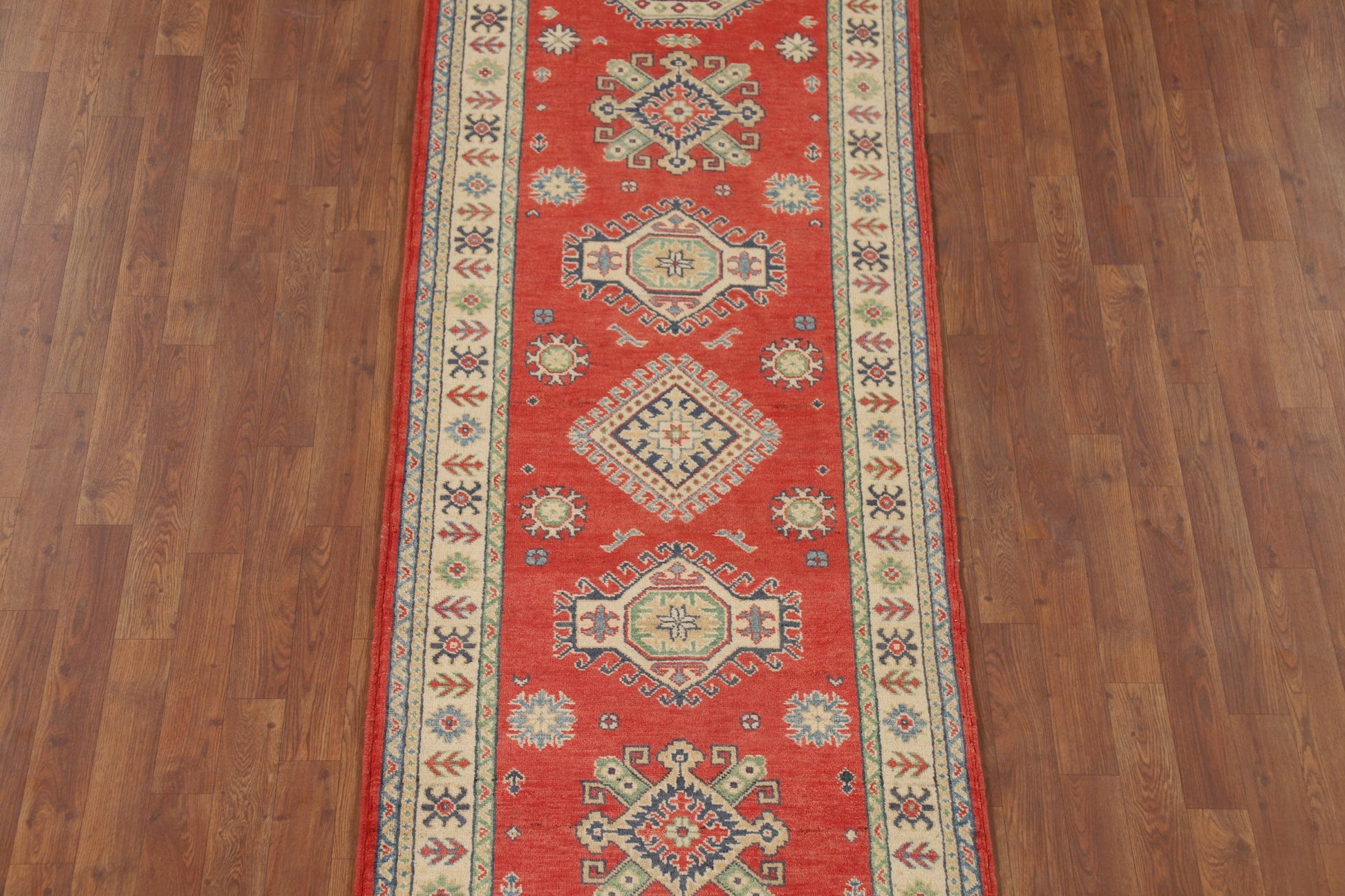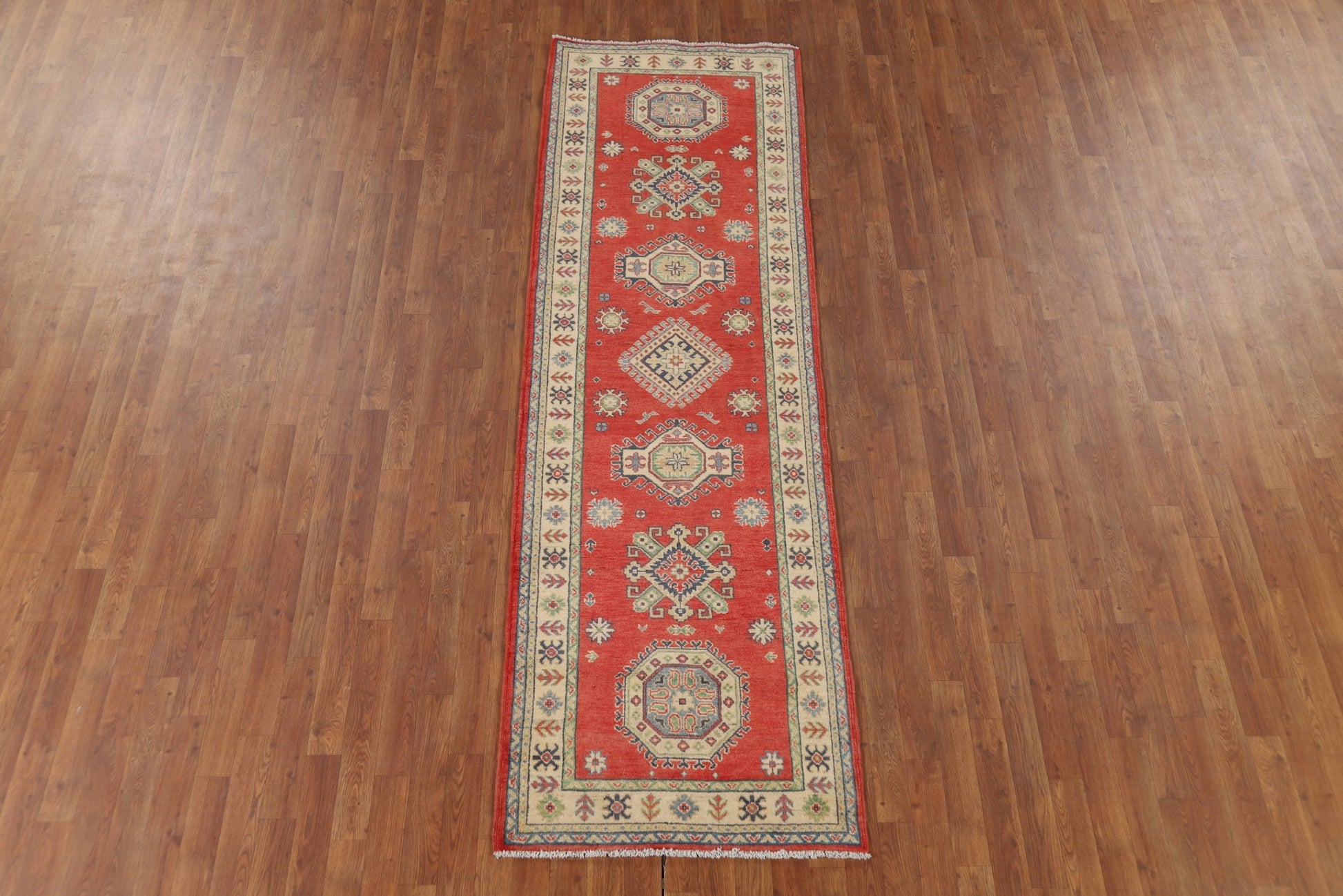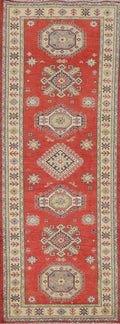 A Beautiful Genuine Pakistan Kazak rug is Hand Knotted by skillful weavers in Pakistan with 100% Wool Material. This rug is in New, First Quality condition. dimensions are 9' 1'' X 2' 10'' in foot and 277 X 86 in centimeter. the primary color is Oranges & Rust.