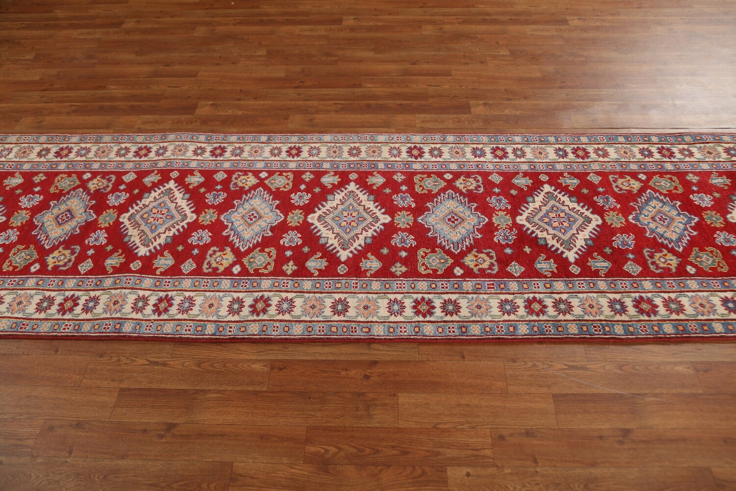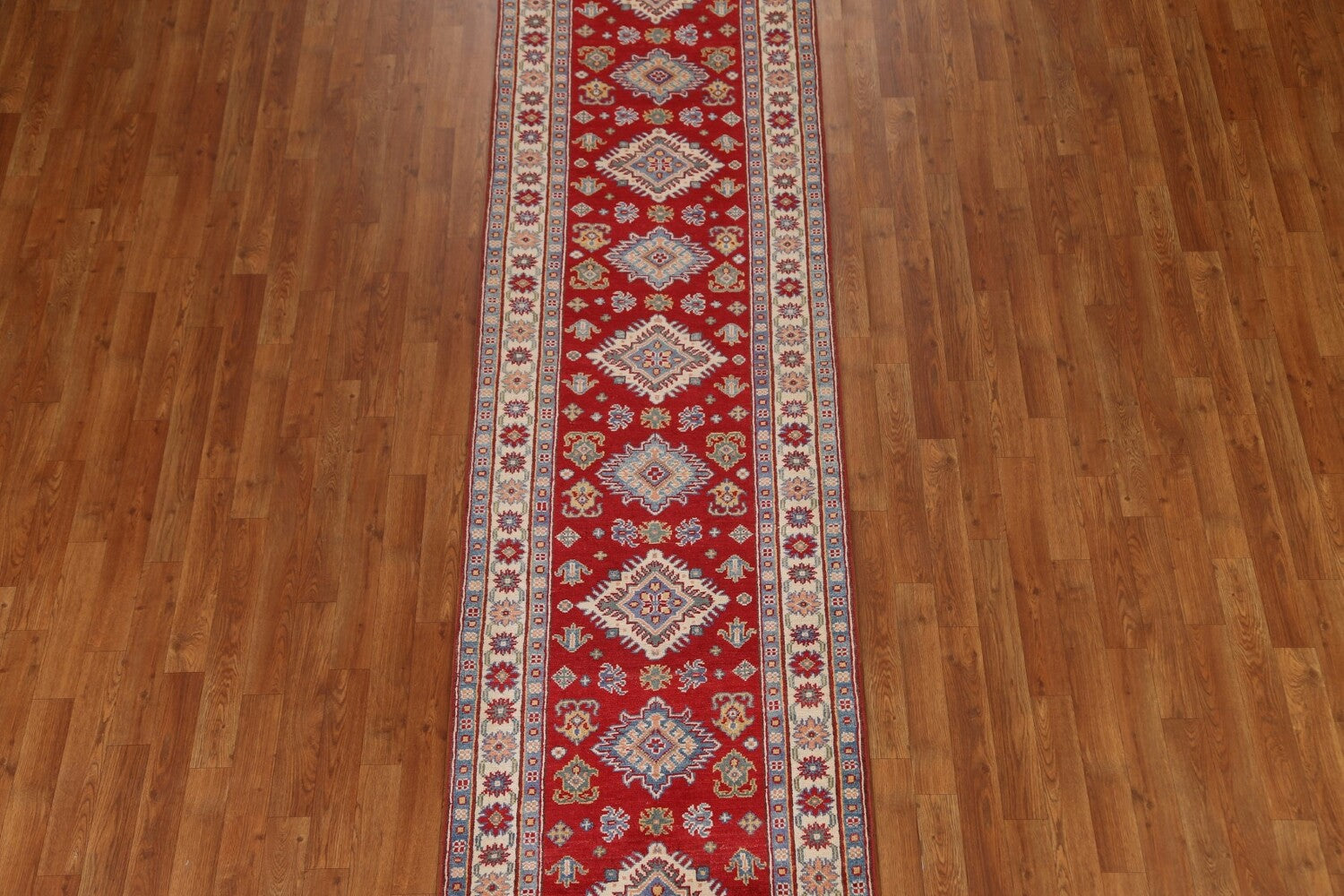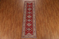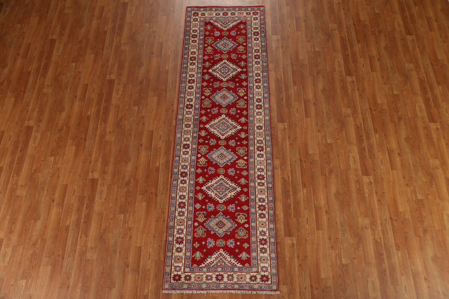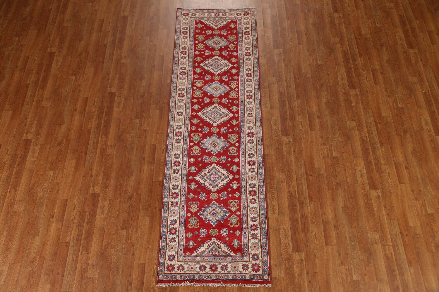 A Beautiful Genuine Pakistan Kazak rug is Hand Knotted by skillful weavers in Pakistan with 100% Wool Material. This rug is in condition. dimensions are 9' 1'' X 2' 8'' in foot and 277 X 81 in centimeter. the primary color is Red.