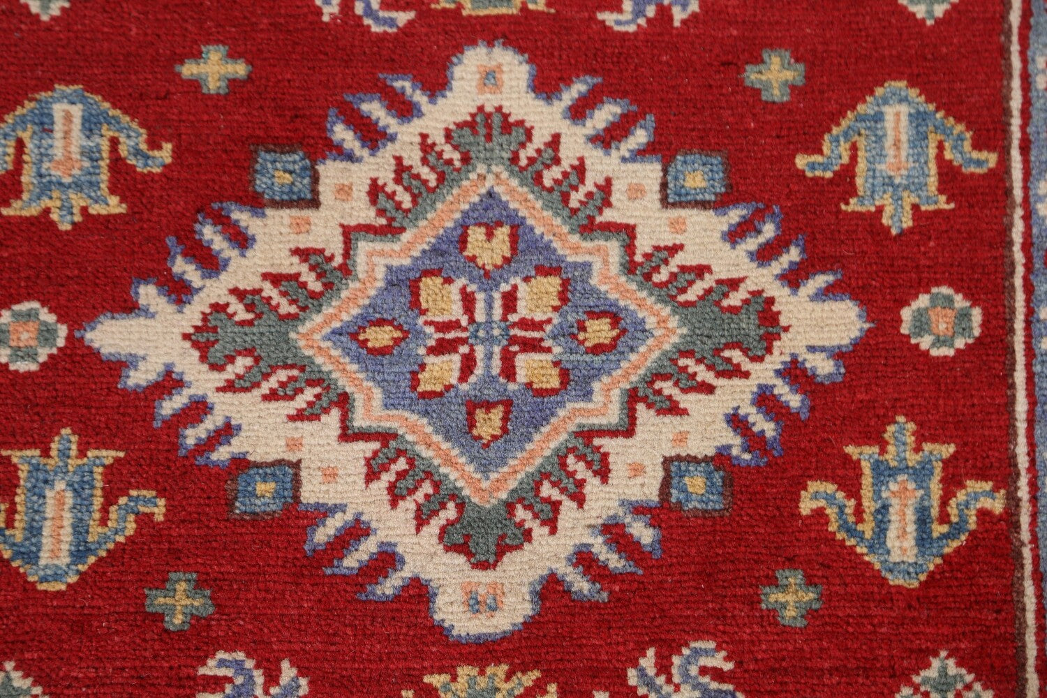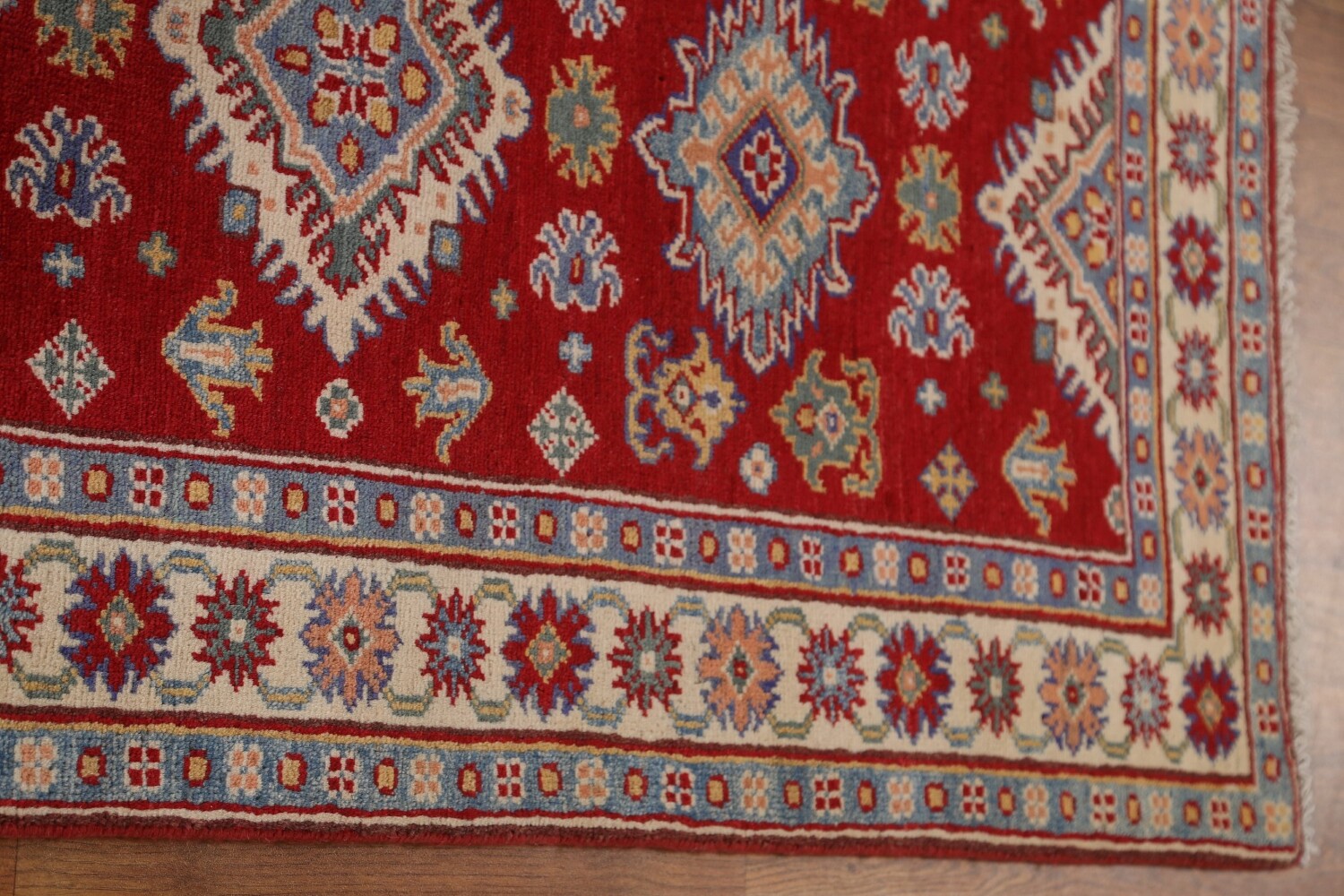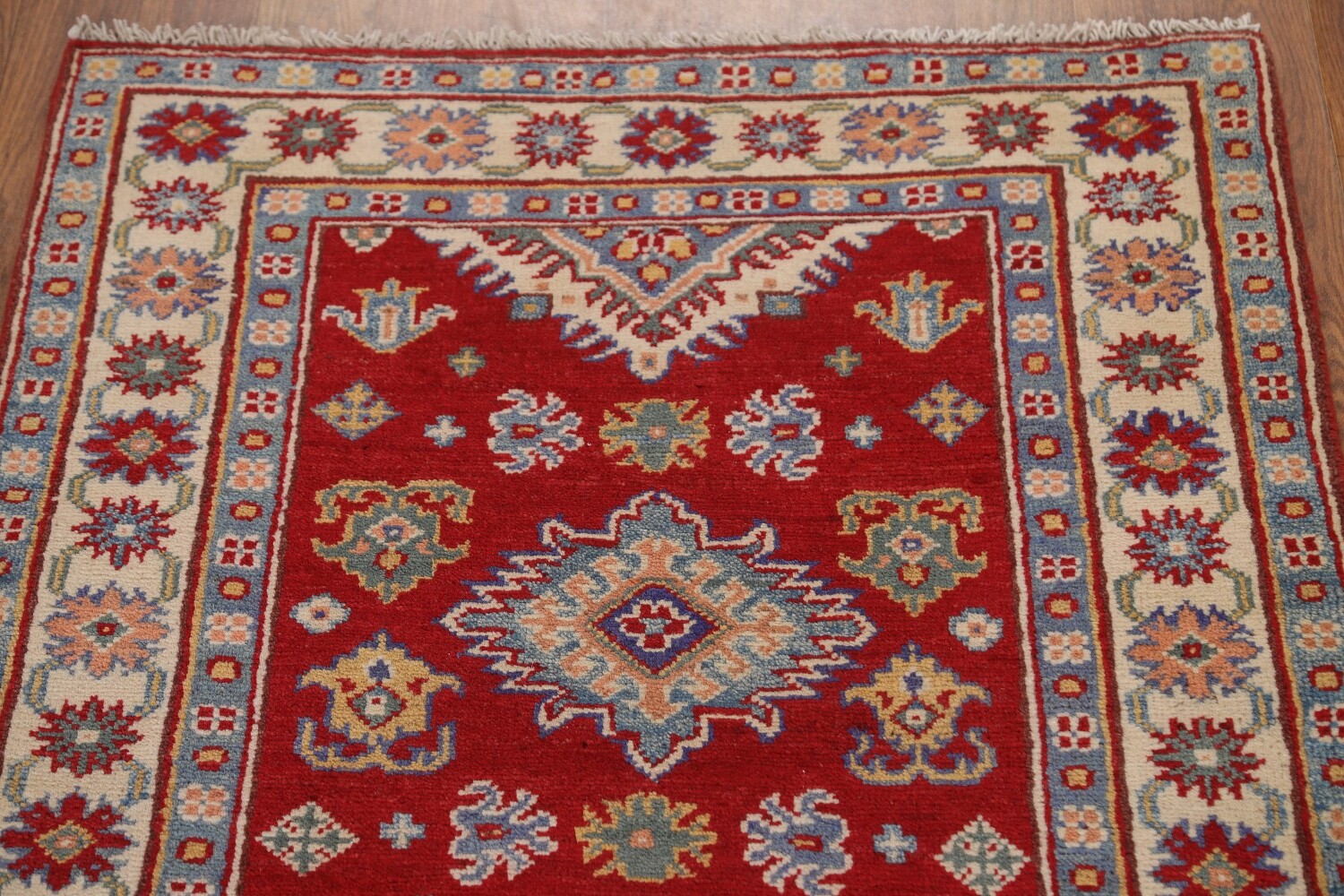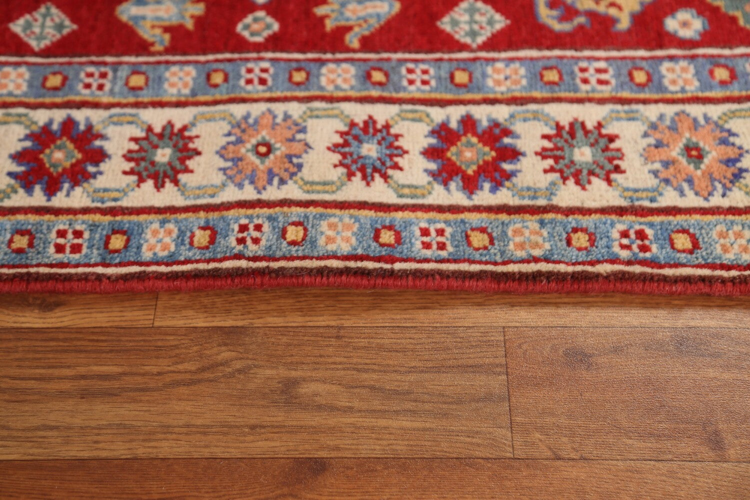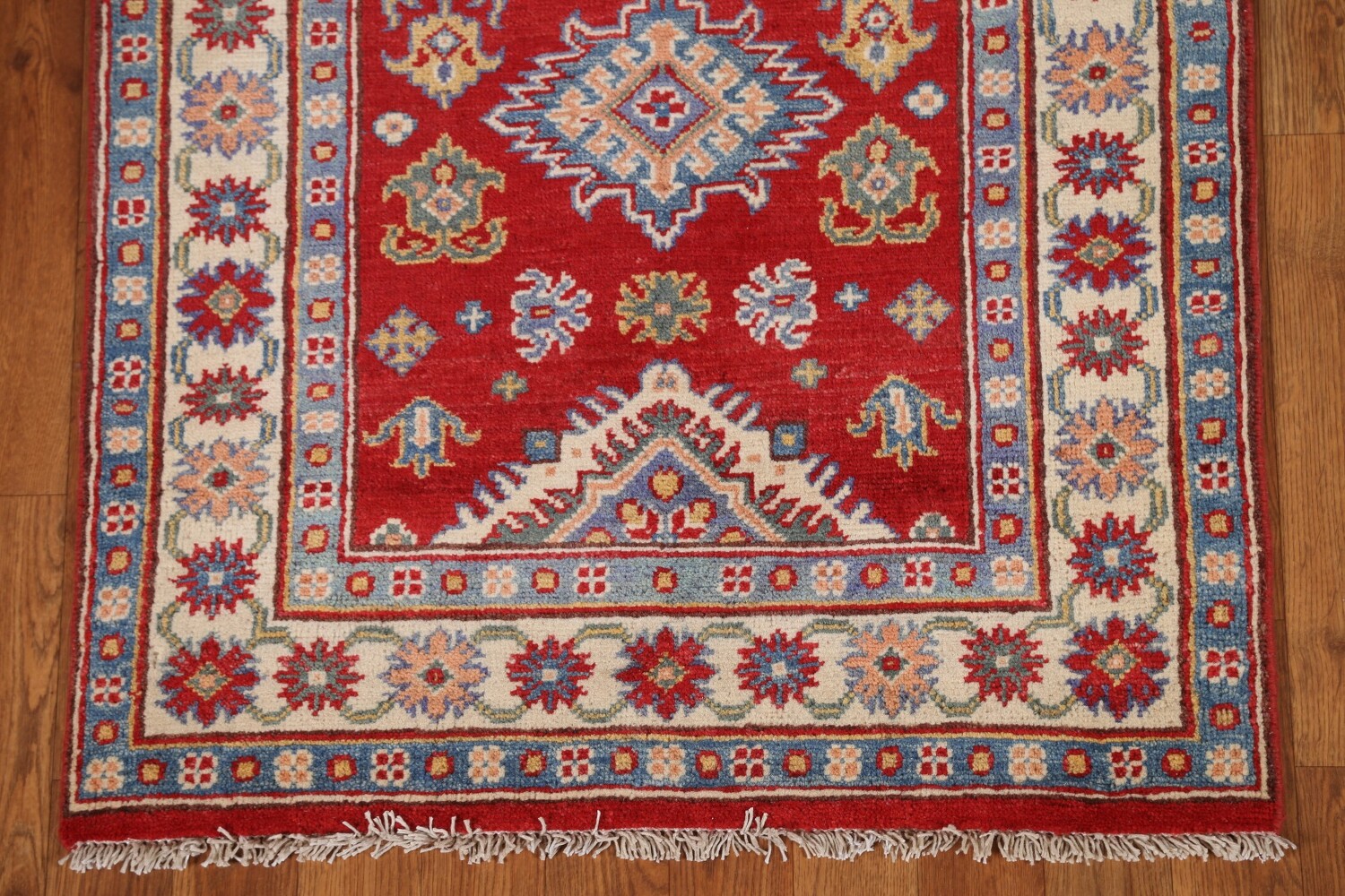 A Beautiful Genuine Pakistan Kazak rug is Hand Knotted by skillful weavers in Pakistan with 100% Wool Material. This rug is in condition. dimensions are 9' 1'' X 2' 8'' in foot and 277 X 81 in centimeter. the primary color is Red.