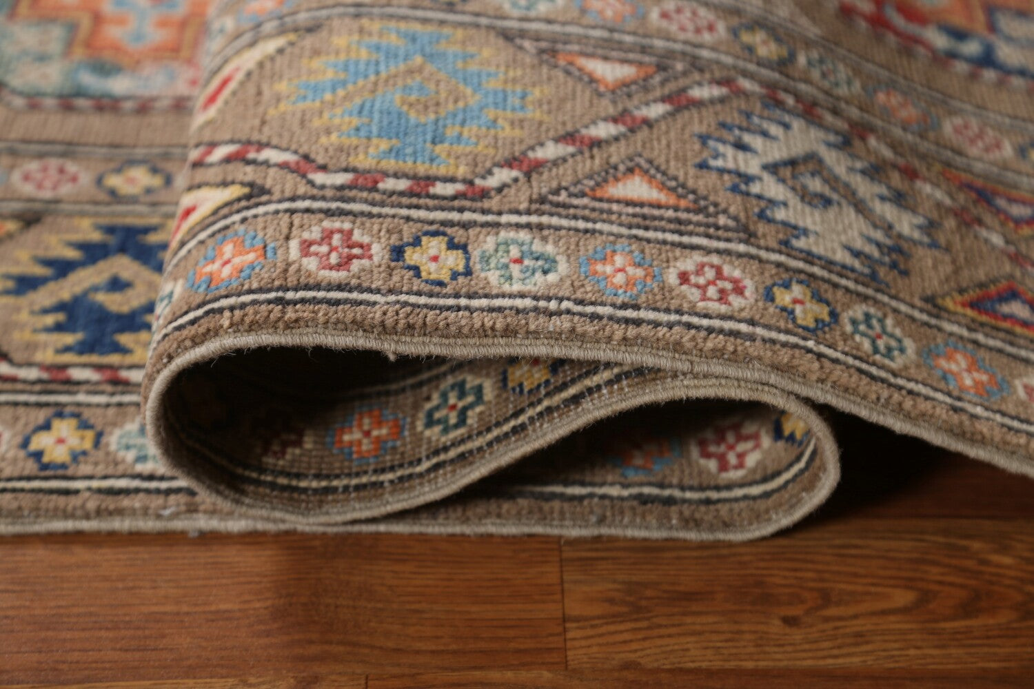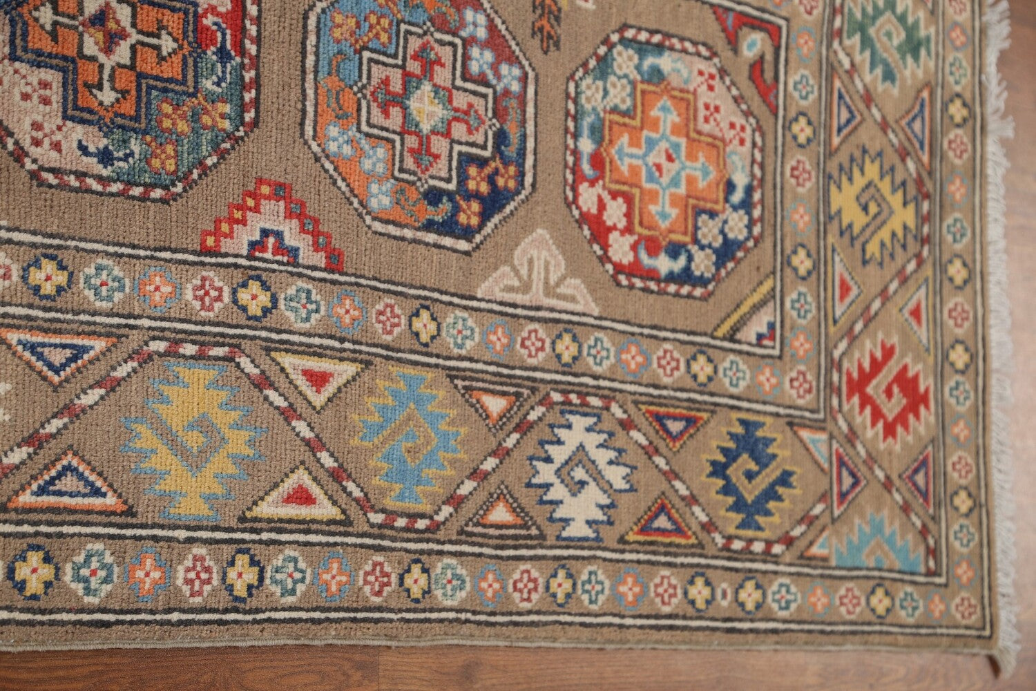 A Beautiful Genuine Pakistan Kazak rug is Hand Knotted by skillful weavers in Pakistan with 100% Wool Material. This rug is in New, First Quality condition. dimensions are 8' 8'' X 2' 8'' in foot and 264 X 81 in centimeter. the primary color is Brown.