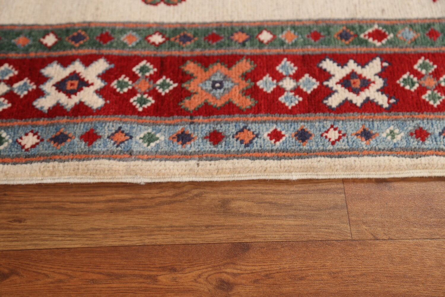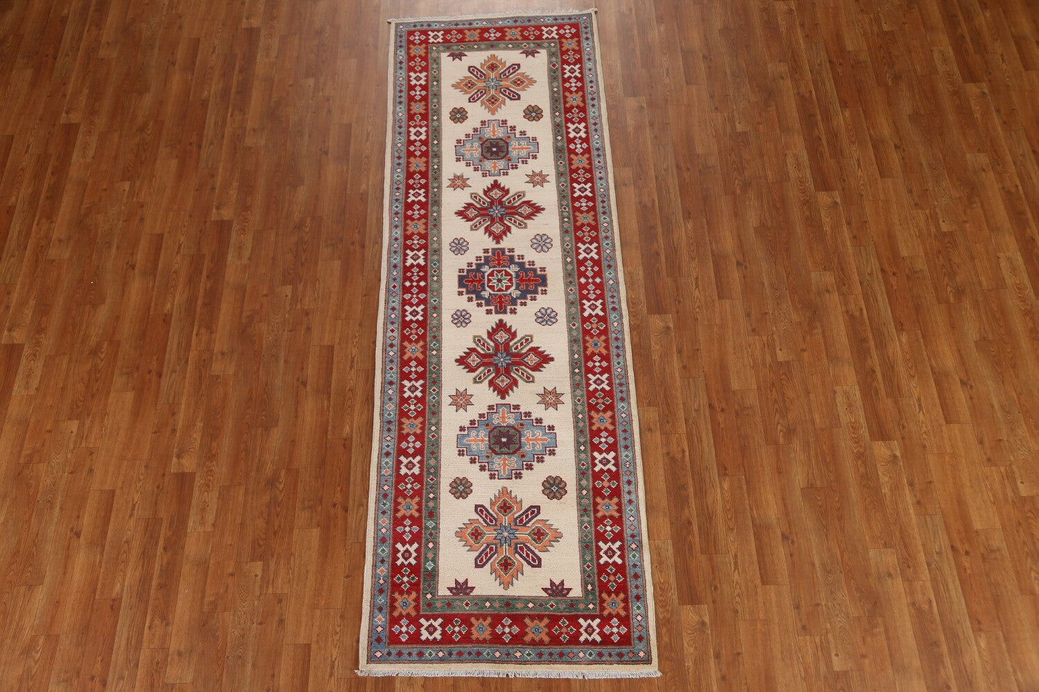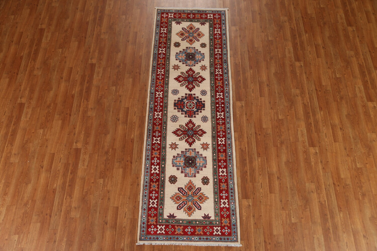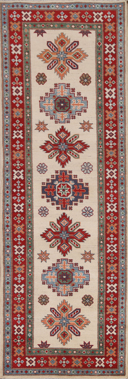 A Beautiful Genuine Pakistan Kazak rug is Hand Knotted by skillful weavers in Pakistan with 100% Wool Material. This rug is in New, First Quality condition. dimensions are 8' 8'' X 2' 10'' in foot and 264 X 86 in centimeter. the primary color is Beige & Ivories.